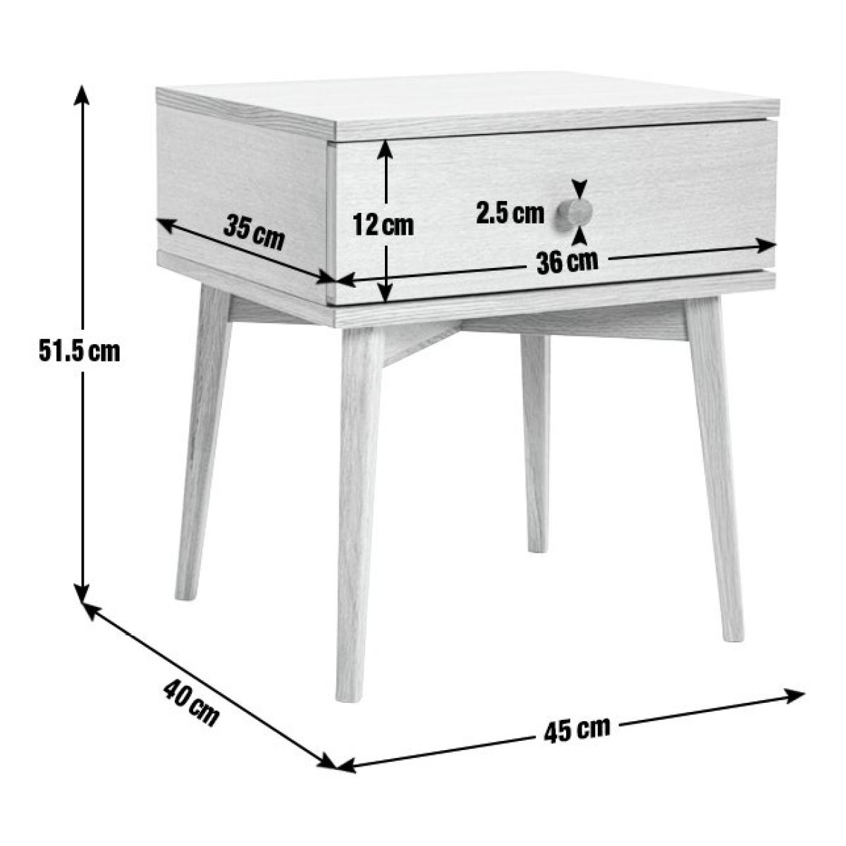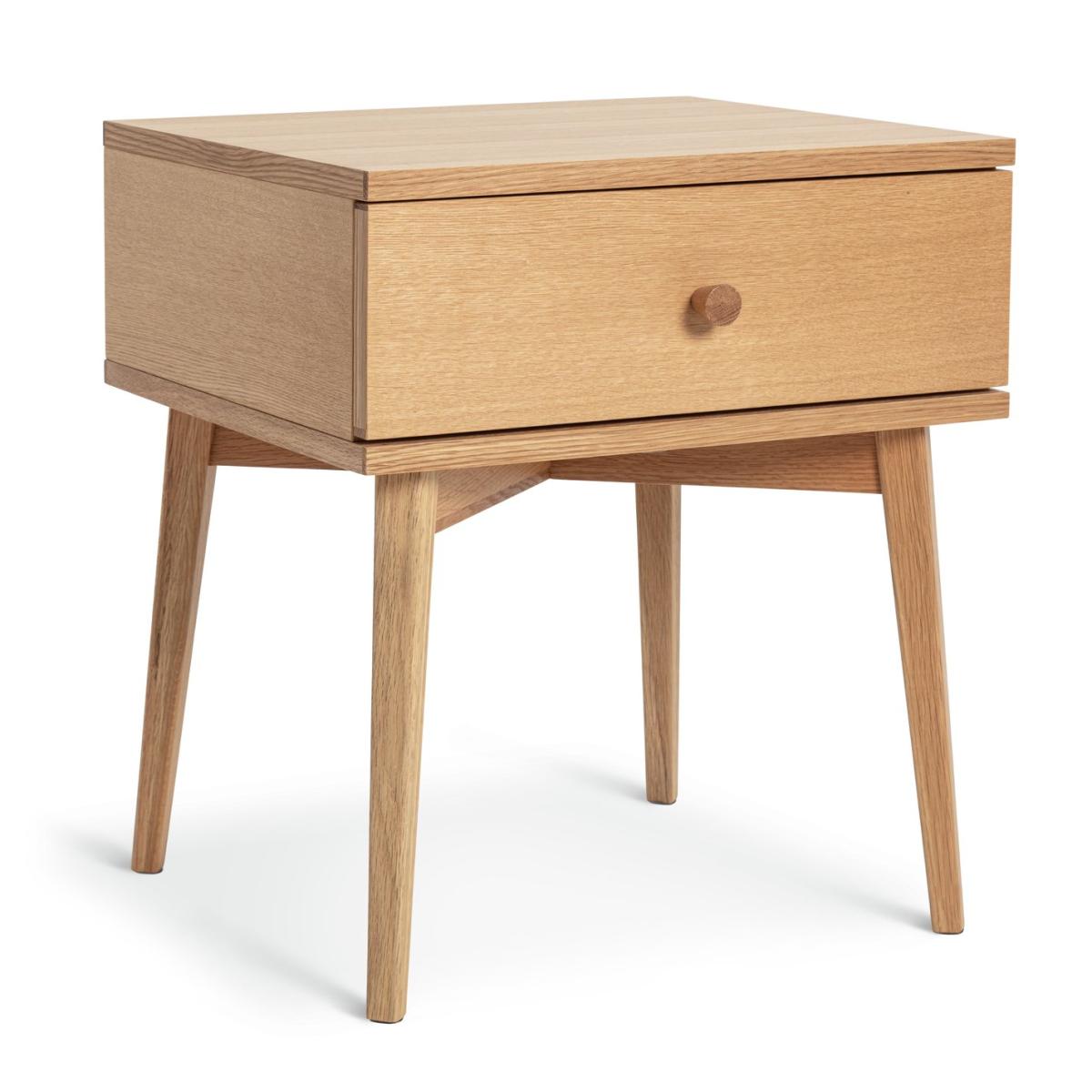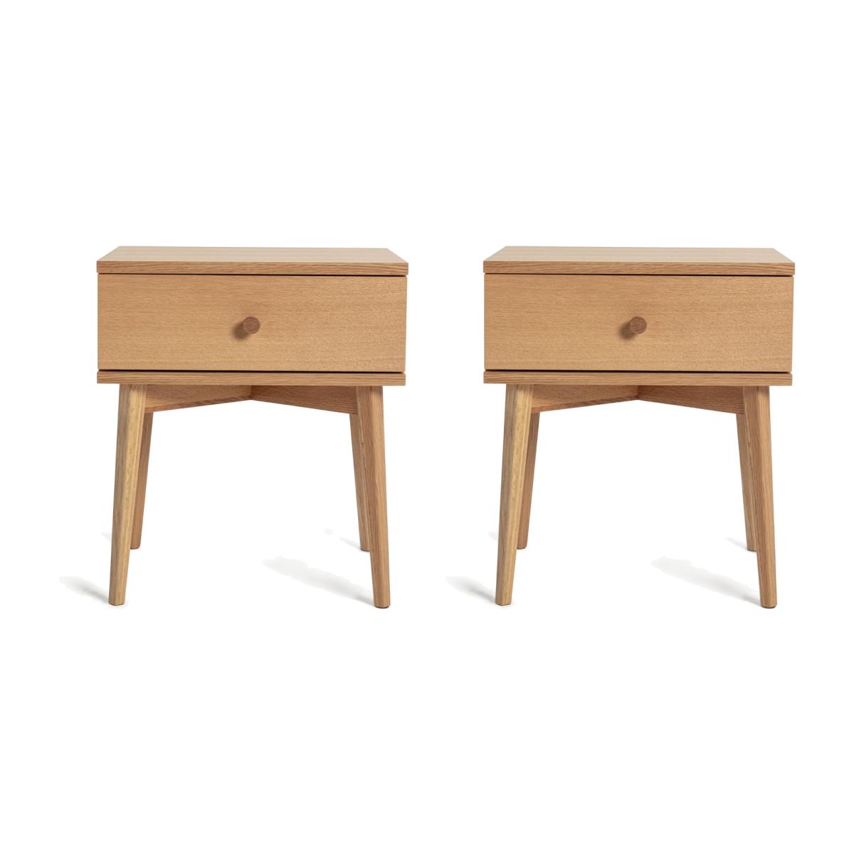 A side of modern style please. Breathe new life into your bedroom with our set of 2 bedside tables. The oak veneered nightstands are subtle and stylish with matching knobs and smooth tapered legs. A single drawer glides open on a metal runner with enough space for your electronic devices and bedside essentials. Perfectly practical.