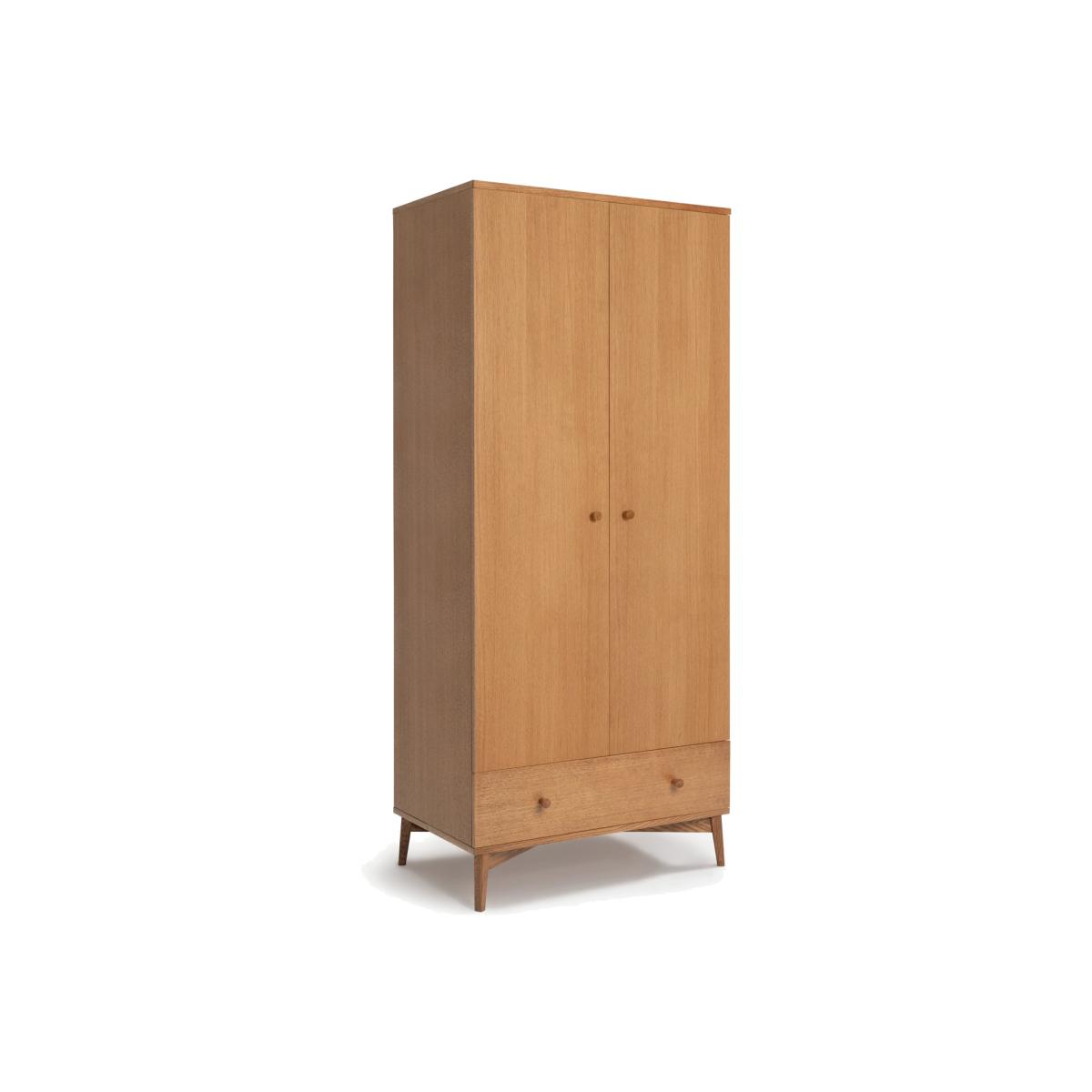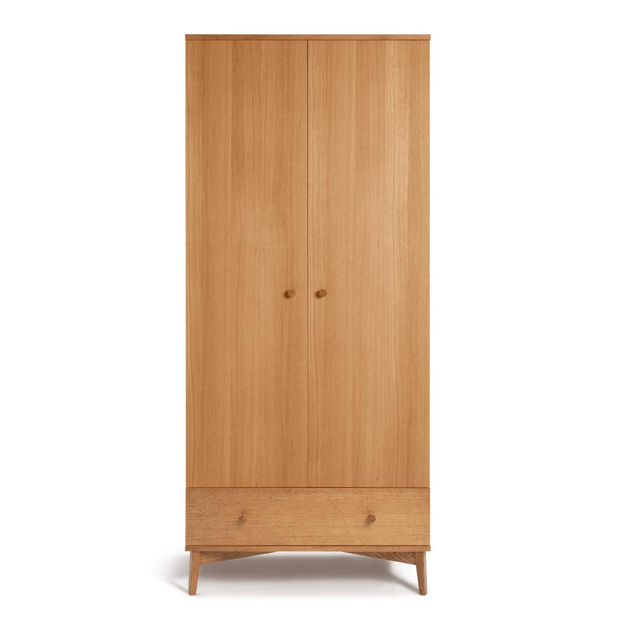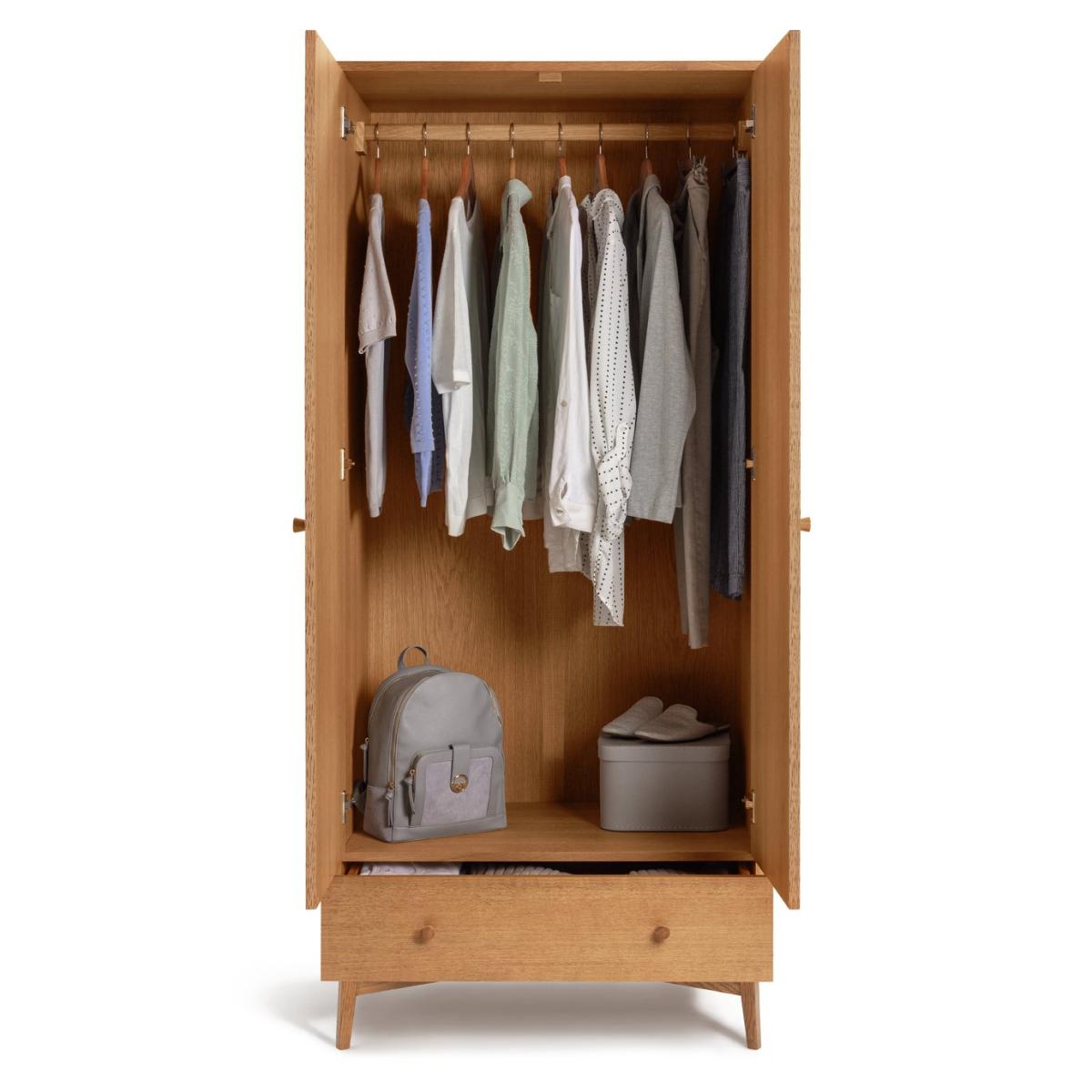 Solid option. Our Kirk 2 door, 1 drawer walnut wardrobe is naturally accommodating. Plenty of long hanging space inside with a strong fixed rail, and an easy glide bottom drawer for gym kit to jumpers. 100% oak, with an attractive natural grain and a splayed leg frame, this is a piece of furniture made to last. Today's choice, tomorrow's classic maybe. With a raw and natural finish, our capsule collection style wooden wardrobe is timeless in its presentation.