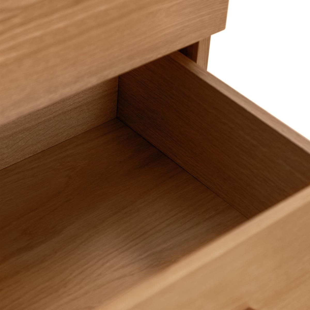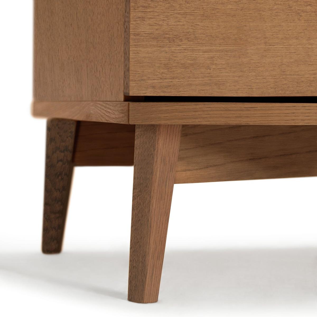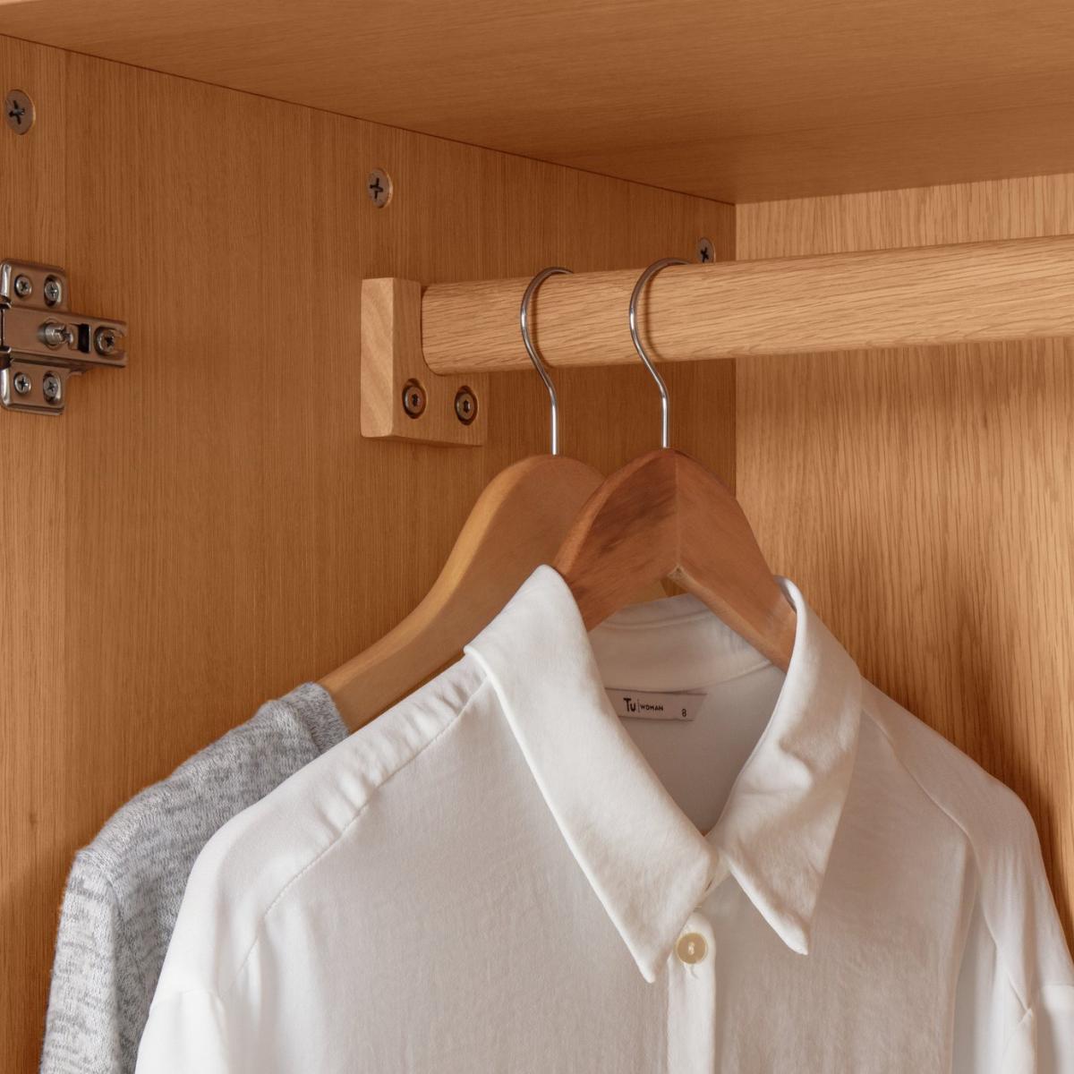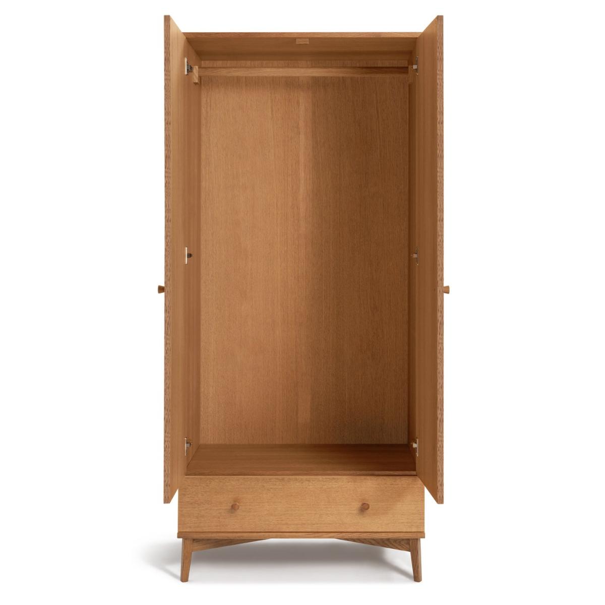Solid option. Our Kirk 2 door, 1 drawer walnut wardrobe is naturally accommodating. Plenty of long hanging space inside with a strong fixed rail, and an easy glide bottom drawer for gym kit to jumpers. 100% oak, with an attractive natural grain and a splayed leg frame, this is a piece of furniture made to last. Today's choice, tomorrow's classic maybe. With a raw and natural finish, our capsule collection style wooden wardrobe is timeless in its presentation.