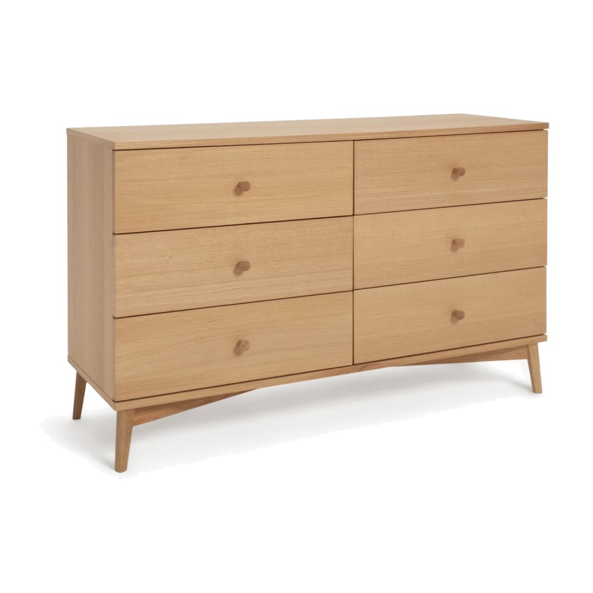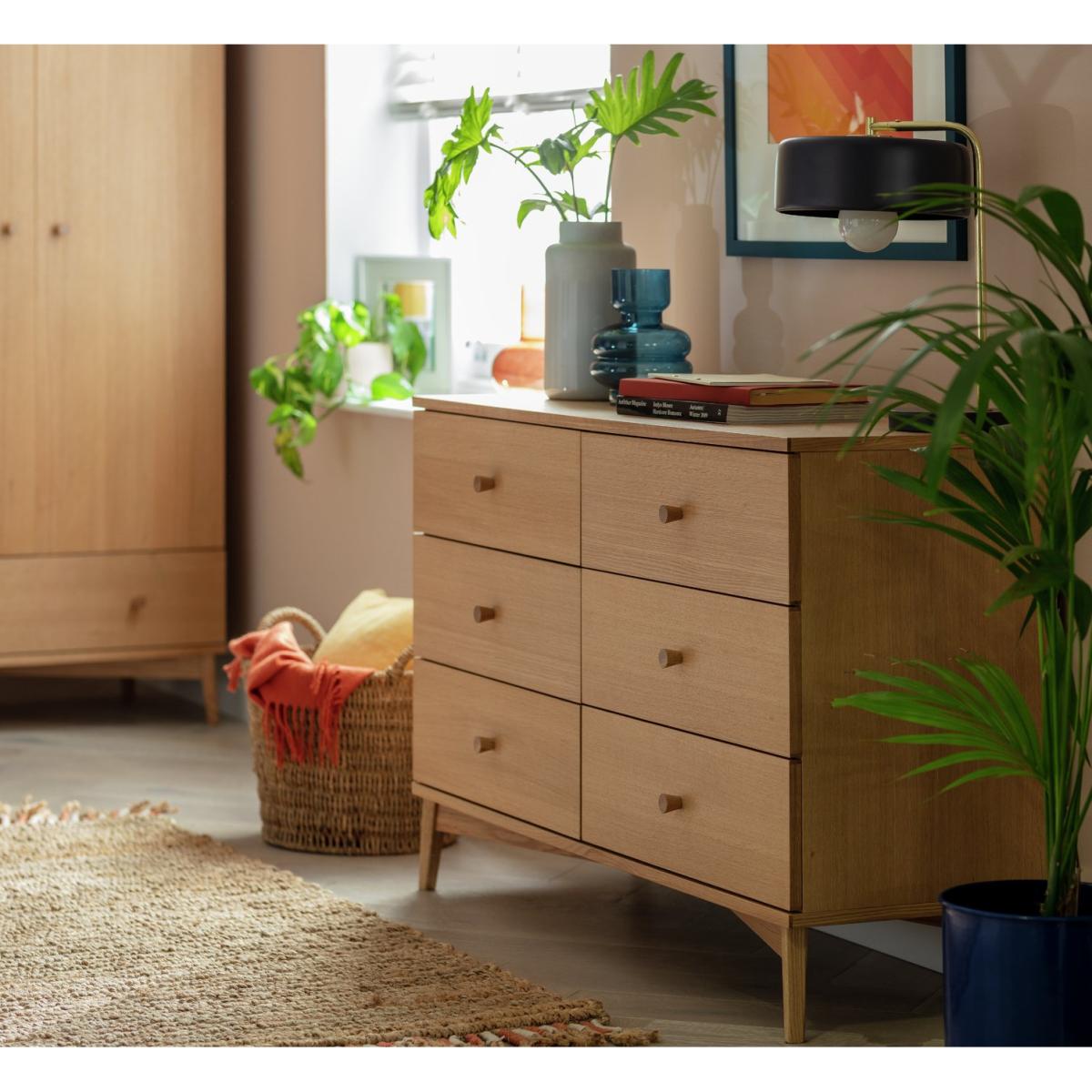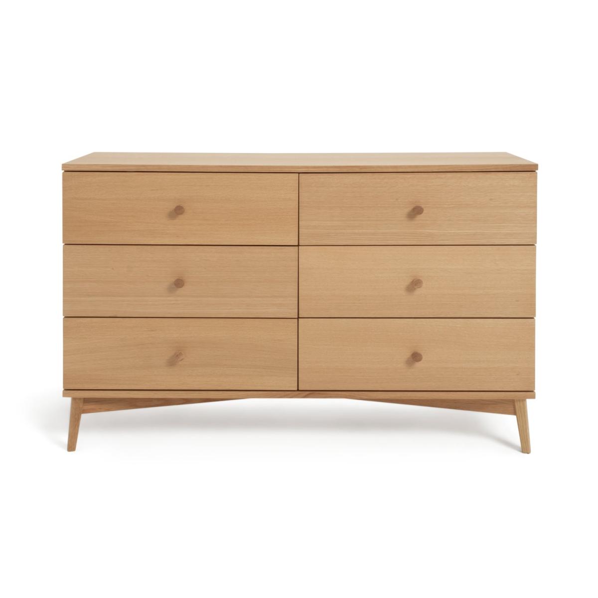 Deciding on decluttering? Our Kirk 6 drawer oak cabinet is here to help. Round wooden handles add a classic touch, while splayed legs elevate the look and bring an air of spaciousness. Set on metal runners, each of the drawers glide open to reveal plenty of room for clothes, linen and more. A handsome addition to a bedroom or lounge. Want a darker finish? Kirk is also available in a walnut finish. Part of the Kirk collection. Made of MDF and oak veneer. Wooden handles. 6 drawers with metal runners. Self-assembly - 2 people recommended (includes wall fixings). If this product is over 60cm high it must be securely attached to the wall to prevent overturning. Dimensions: Size H76, W118, D40cm. Internal drawer H13, W71.2, D33cm. Handle size: L2.5, W2.5cm. Weight 55kg. Package Dimensions: Package 1 dimensions: H23, W126, D48,. Package 1 weight: 32.5kg. Package 2 dimensions: H12, W65, D64cm. Package 2 weight: 23.5kg. FSC certified meaning the materials used for this product are responsibly sourced. General information: We are excited to be welcoming some of our favourite HOME products into the Habitat range. Your product may arrive in Habitat or HOME packaging. Manufacturer's 1 year guarantee.