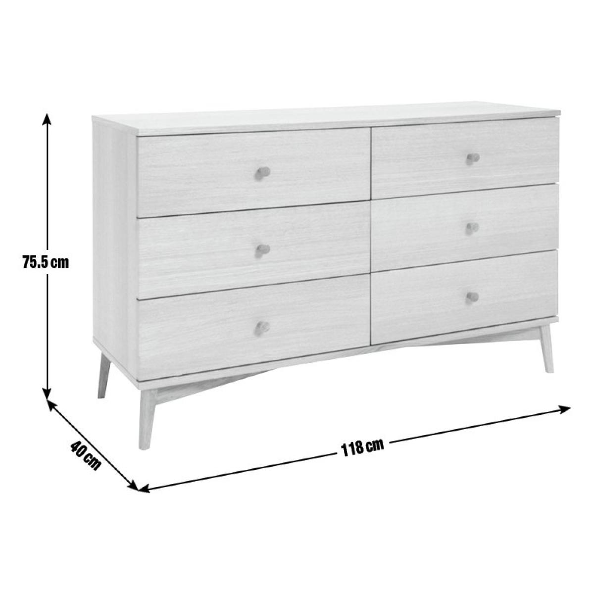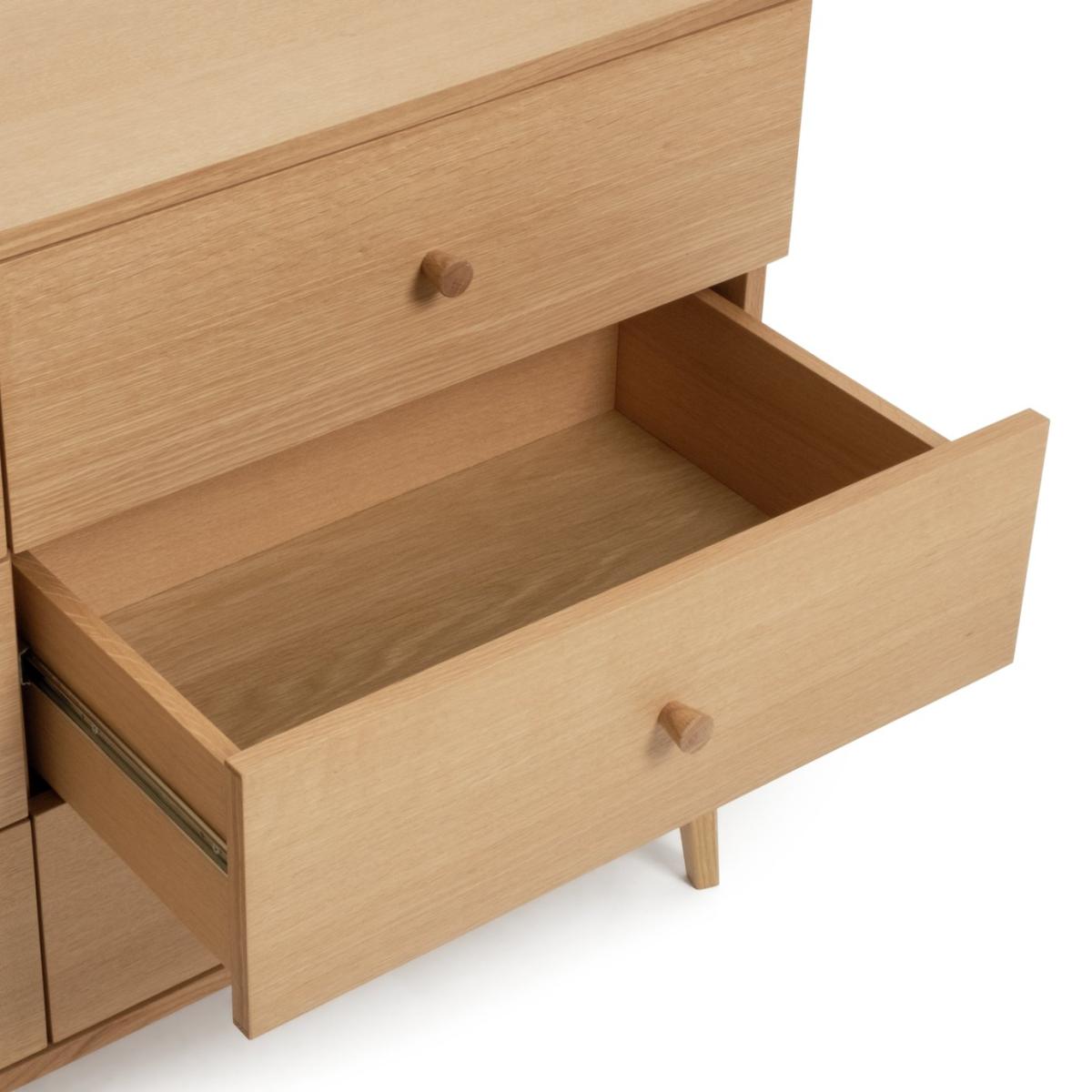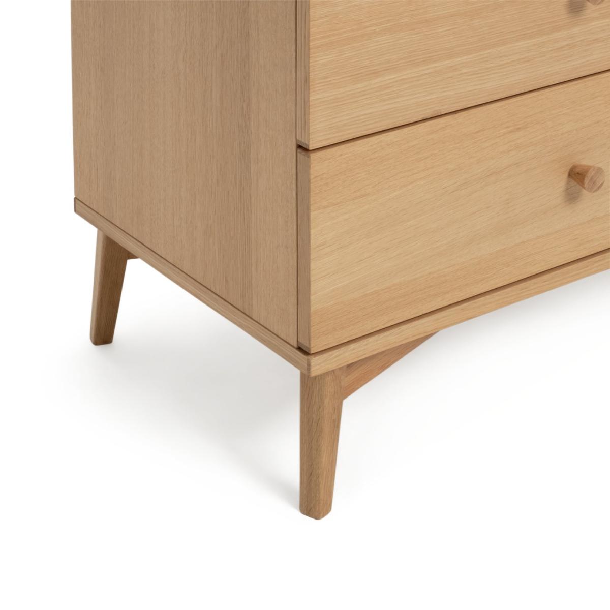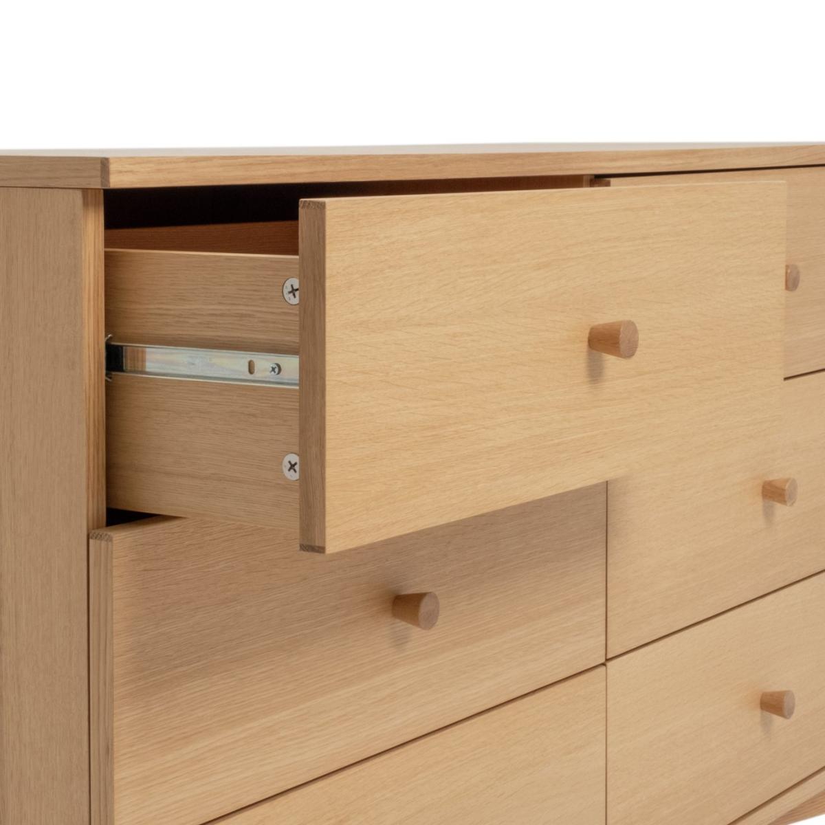 Deciding on decluttering? Our Kirk 6 drawer oak cabinet is here to help. Round wooden handles add a classic touch, while splayed legs elevate the look and bring an air of spaciousness. Set on metal runners, each of the drawers glide open to reveal plenty of room for clothes, linen and more. A handsome addition to a bedroom or lounge. Want a darker finish? Kirk is also available in a walnut finish. Part of the Kirk collection. Made of MDF and oak veneer. Wooden handles. 6 drawers with metal runners. Self-assembly - 2 people recommended (includes wall fixings). If this product is over 60cm high it must be securely attached to the wall to prevent overturning. Dimensions: Size H76, W118, D40cm. Internal drawer H13, W71.2, D33cm. Handle size: L2.5, W2.5cm. Weight 55kg. Package Dimensions: Package 1 dimensions: H23, W126, D48,. Package 1 weight: 32.5kg. Package 2 dimensions: H12, W65, D64cm. Package 2 weight: 23.5kg. FSC certified meaning the materials used for this product are responsibly sourced. General information: We are excited to be welcoming some of our favourite HOME products into the Habitat range. Your product may arrive in Habitat or HOME packaging. Manufacturer's 1 year guarantee.