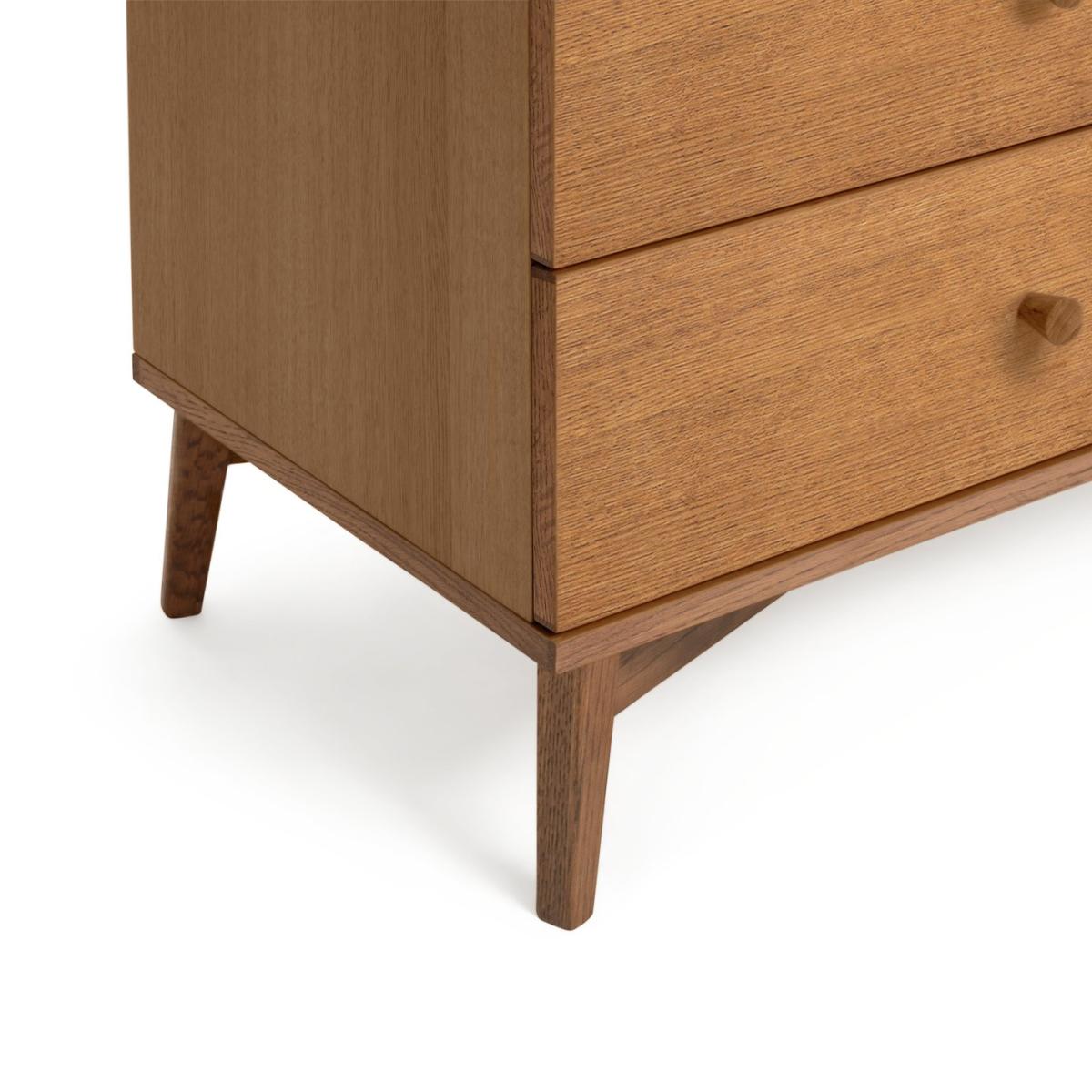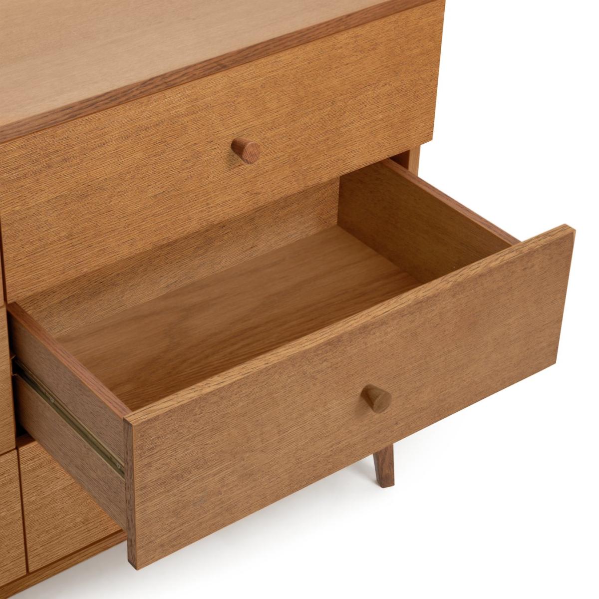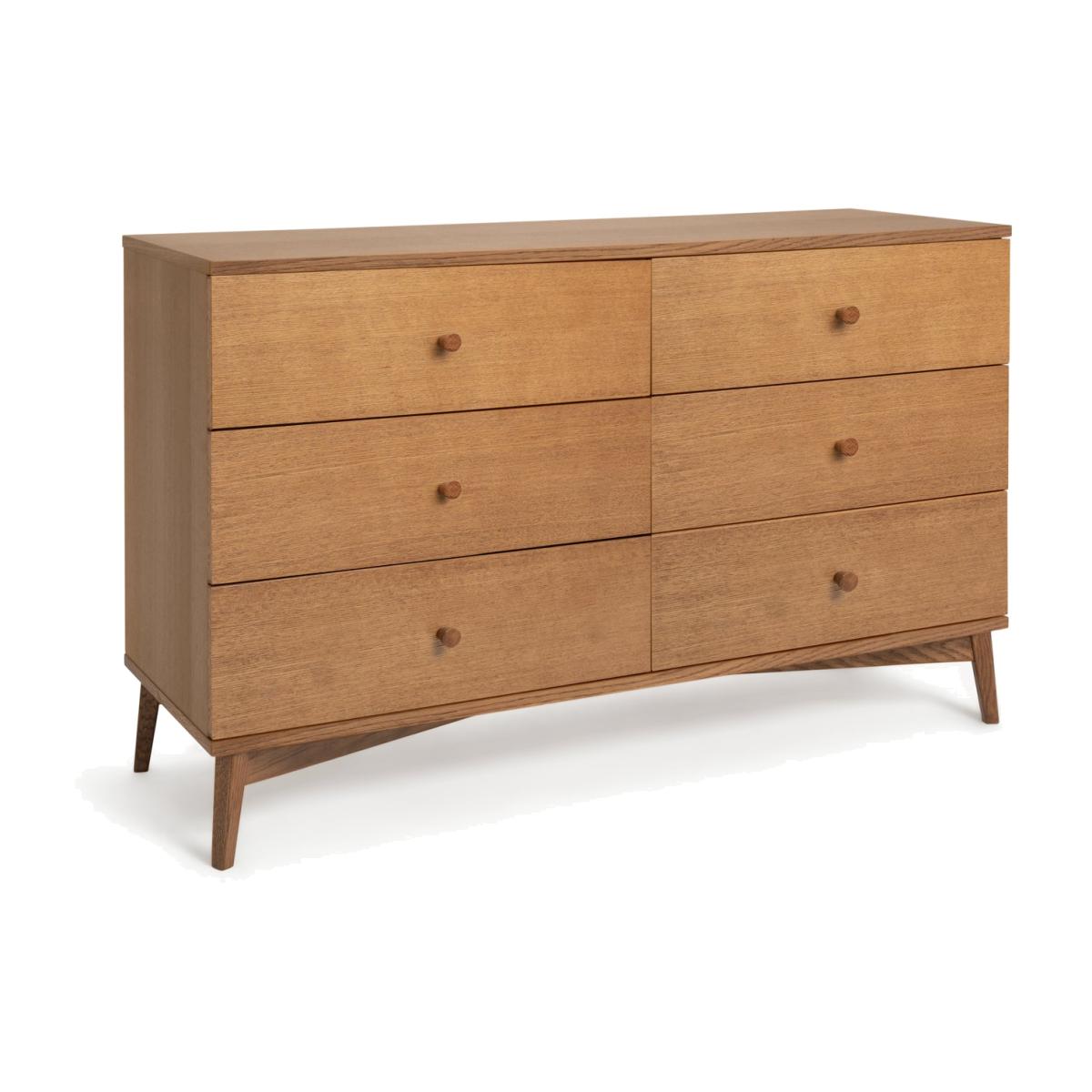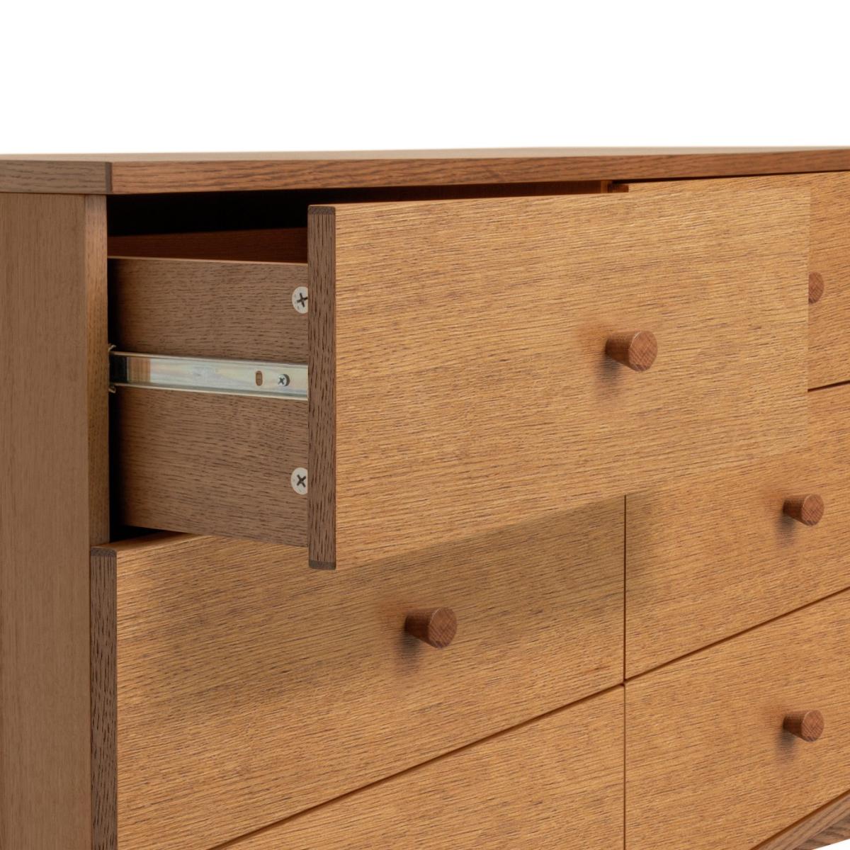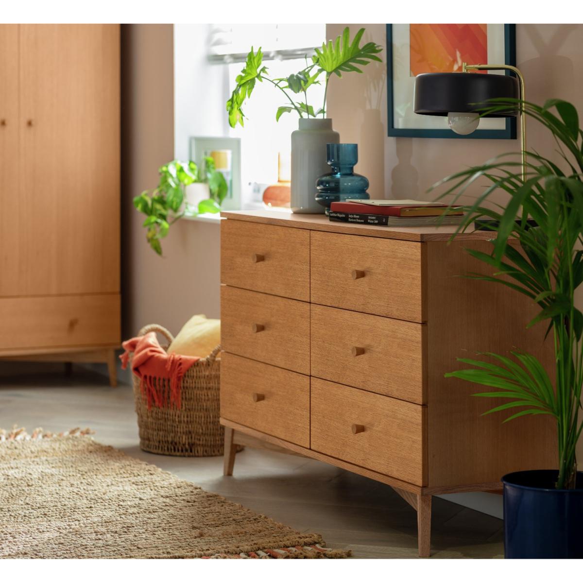 Deciding on decluttering? Our Kirk 6 drawer walnut cabinet is here to help. Round wooden handles add a classic touch, while splayed legs elevate the look and bring an air of spaciousness. Set on metal runners, each of the drawers glide open to reveal plenty of room for clothes, linen and more. A handsome addition to a bedroom or lounge. Want to go a little paler? Kirk is also available in a light oak shade. Part of the Kirk collection. Made of MDF and oak veneer. Wooden handles. 6 drawers with metal runners. Self-assembly - 2 people recommended (includes wall fixings). If this product is over 60cm high it must be securely attached to the wall to prevent overturning. Dimensions: Size H76, W118, D40cm. Internal drawer H13, W71.2, D33cm. Handle size: L2.5, W2.5cm. Weight 55kg. Package Dimensions: Package 1 dimensions: H23, W126, D48,. Package 1 weight: 32.5kg. Package 2 dimensions: H12, W65, D64cm. Package 2 weight: 23.5kg. FSC certified meaning the materials used for this product are responsibly sourced. General information: We are excited to be welcoming some of our favourite HOME products into the Habitat range. Your product may arrive in Habitat or HOME packaging. Manufacturer's 1 year guarantee.
