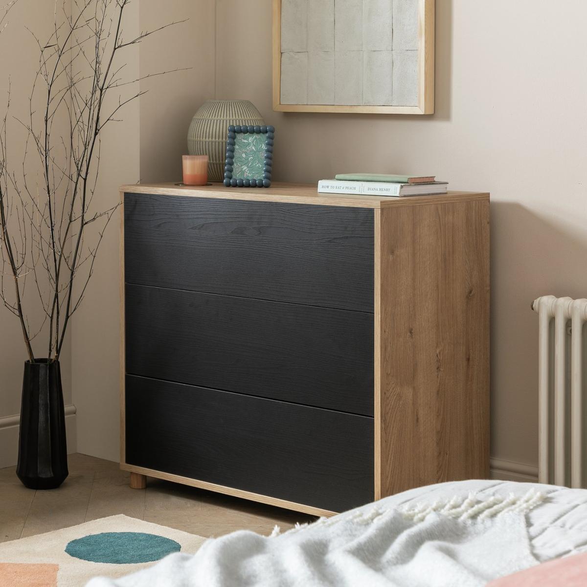 Introducing 2-tone Koda. A chest that combines the tones of warm wood with a contemporary colour block finish. With 3 deep, push-to-open drawers you get masses of space. And the top can function as a TV stand, dressing table or bedside table. A modern chest for modern life and part of an exclusive furniture collection from the Habitat in-house studio. Part of the Koda collection. Made of wood effect and solid wood. 3 drawers with metal runners. Self-assembly - 2 people recommended (includes wall fixings). If this product is over 60cm high it must be securely attached to the wall to prevent overturning. Dimensions: Size H83.6, W90, D46cm. Internal drawer H16.6, W81, D37.2cm. Large internal drawer H18, W84.6, D39cm. Weight 47.6kg. Package Dimensions: Package 1 dimensions: H10.5, W88, D52.5cm. Package 1 weight: 20.1kg. Package 2 dimensions: H11.5, W103, D52.5cm. Package 2 weight: 27.5kg. General information: FSC certified meaning the materials used for this product are responsibly sourced. Manufacturer's 2 year guarantee.