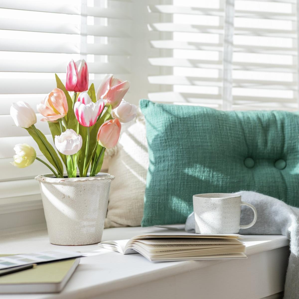 I love this big artificial tulip plant for adding a pop of colour and charm without the maintenance of real blooms. It works particularly well in modern and minimalist interiors where clean lines and bold accents are key, but it can also soften a more traditional or eclectic space. Practical styling tips include placing it in a sleek pot or a textured black or matte finish container to enhance its presence; it works beautifully on side tables, kitchen counters, or as a centrepiece on dining or coffee tables. Because it’s artificial, it’s perfect for spaces with limited natural light or high-traffic areas where fresh flowers might not last. To keep it looking its best, dust periodically and avoid placing it in direct sunlight to prevent fading.