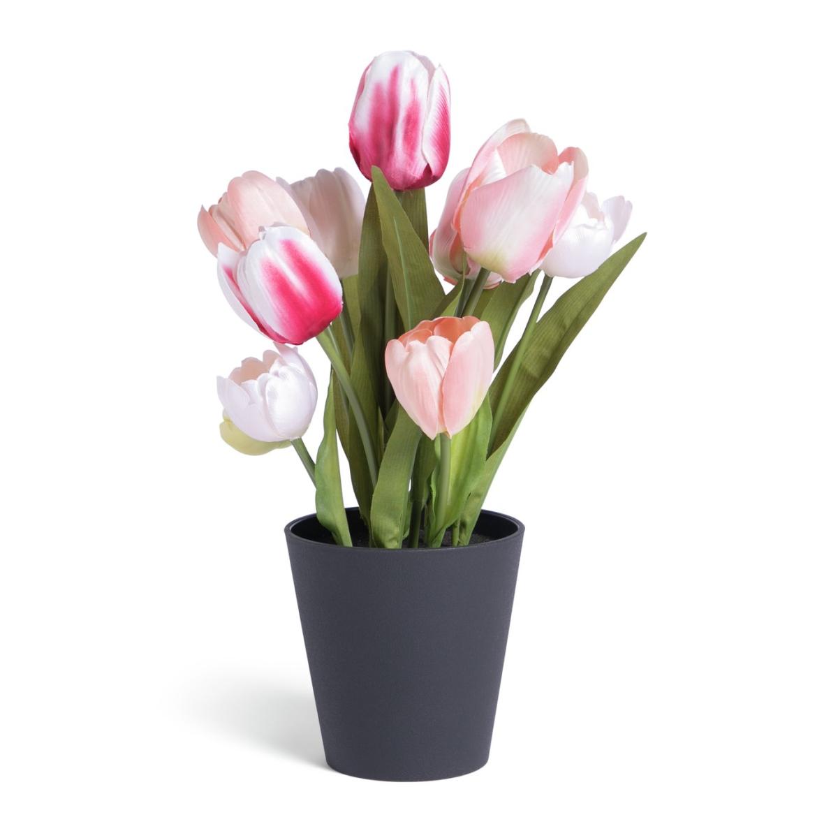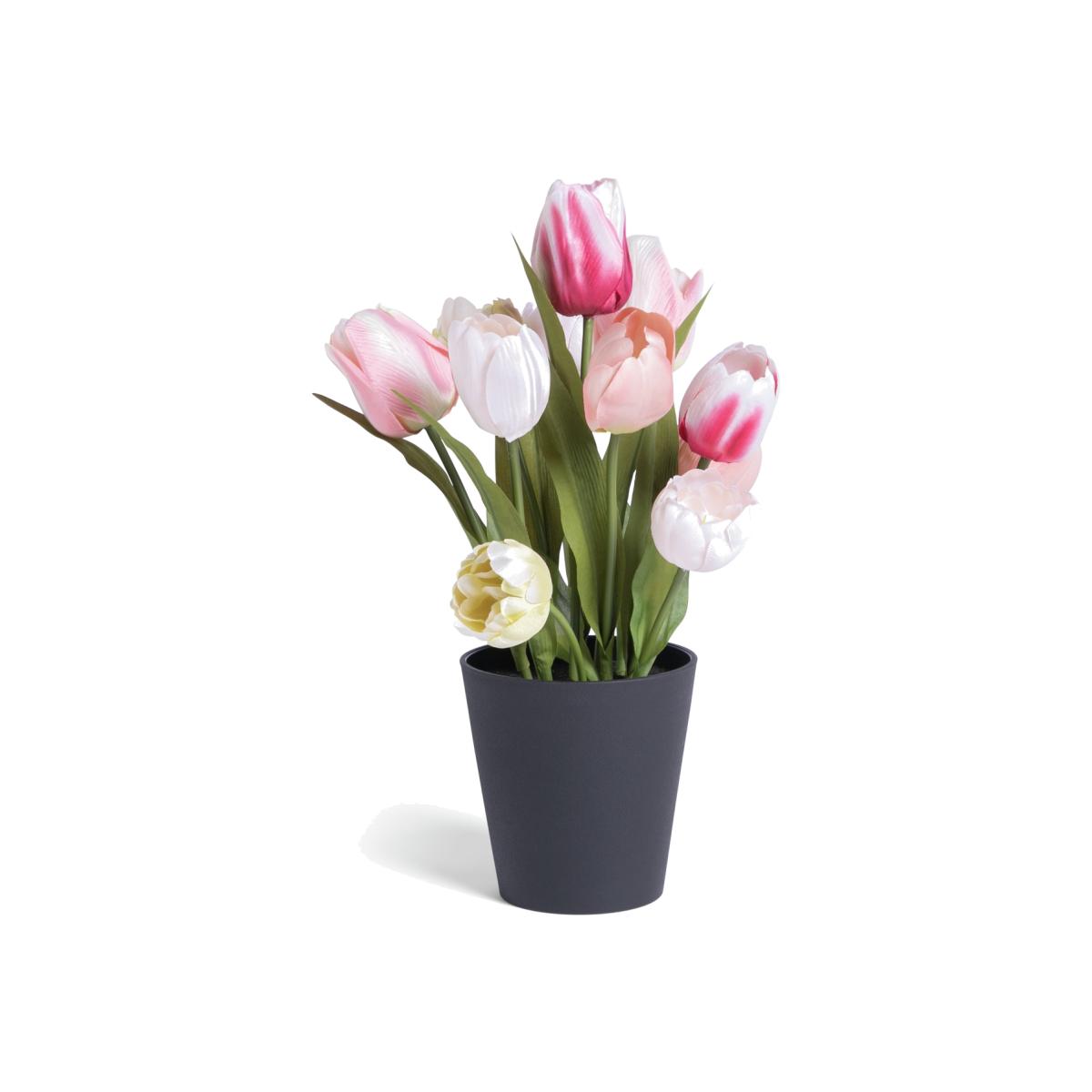 I have too many tulips. Said no one ever. Our large faux tulip plant features a generous bouquet of these lovely flowers. A symphony of romantic colours amongst lush green leaves. A plant that'll stay fuss-free and fabulous, forever. These beauties come in a smart yet simple black pot, so they come ready to add to your space. Size H37, W25.5, D25.5cm. Diameter 25.5cm.