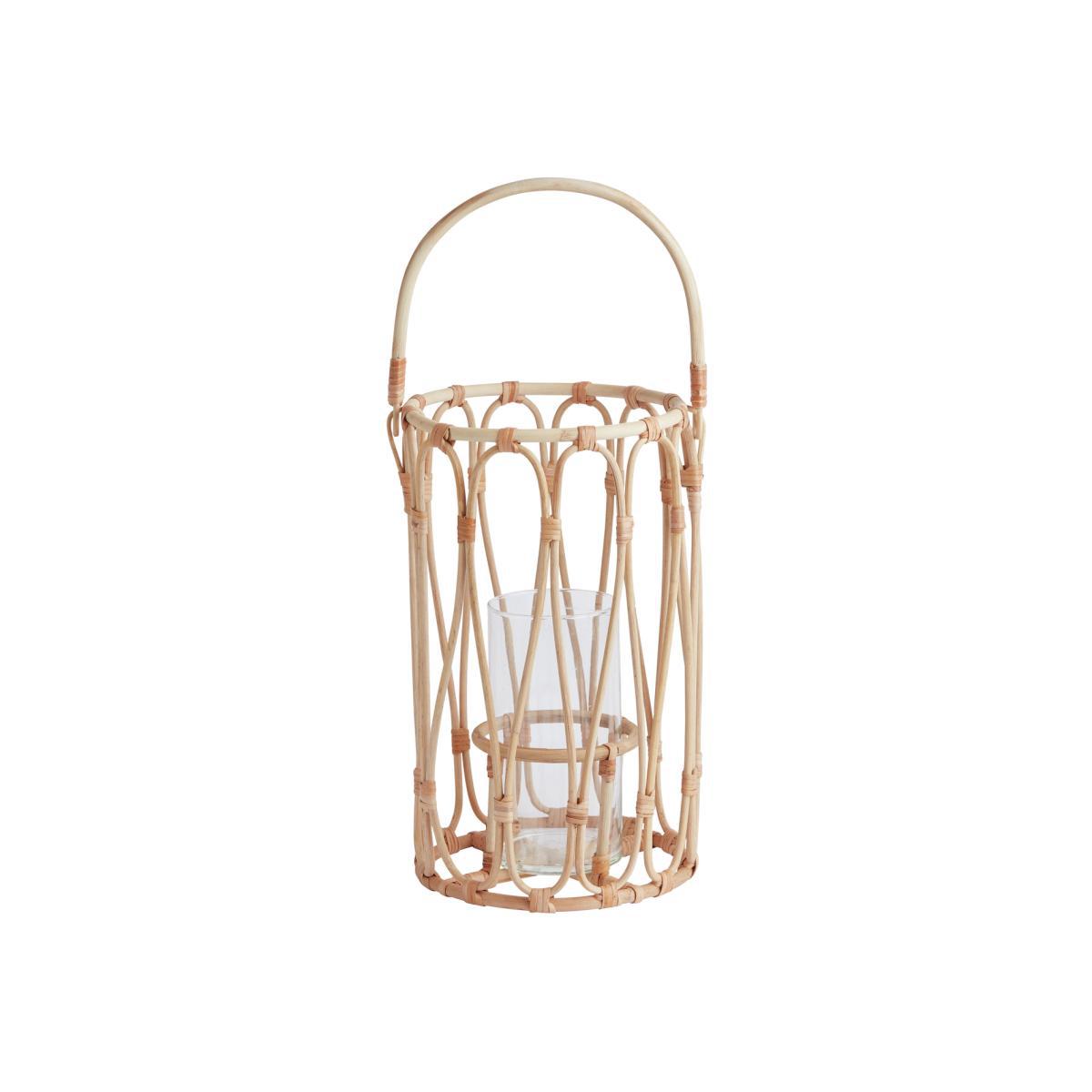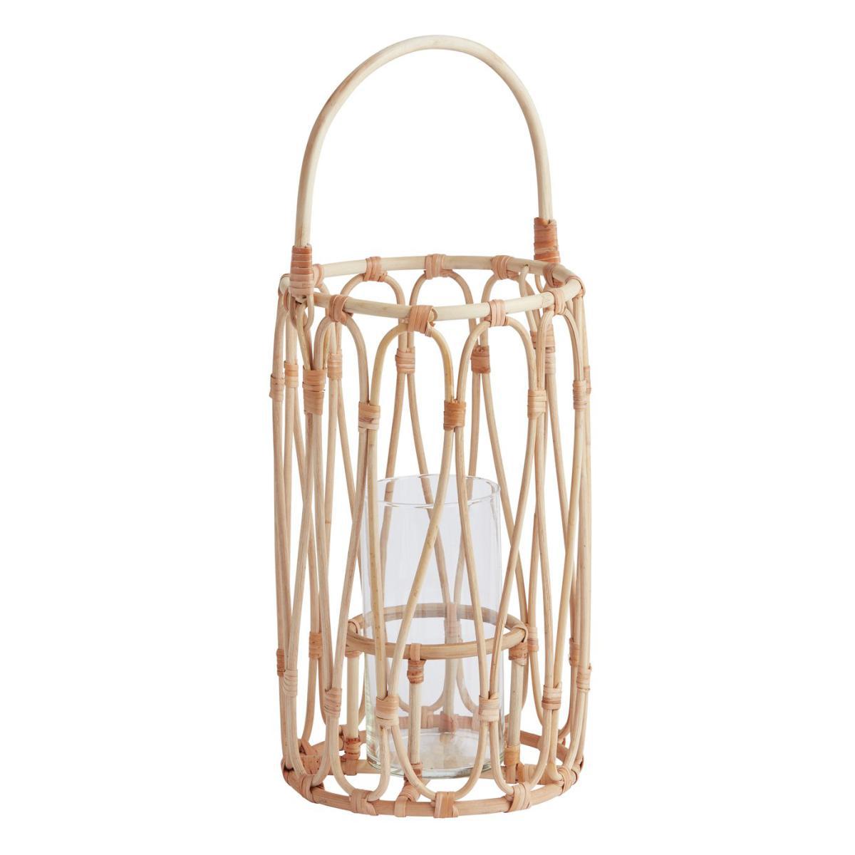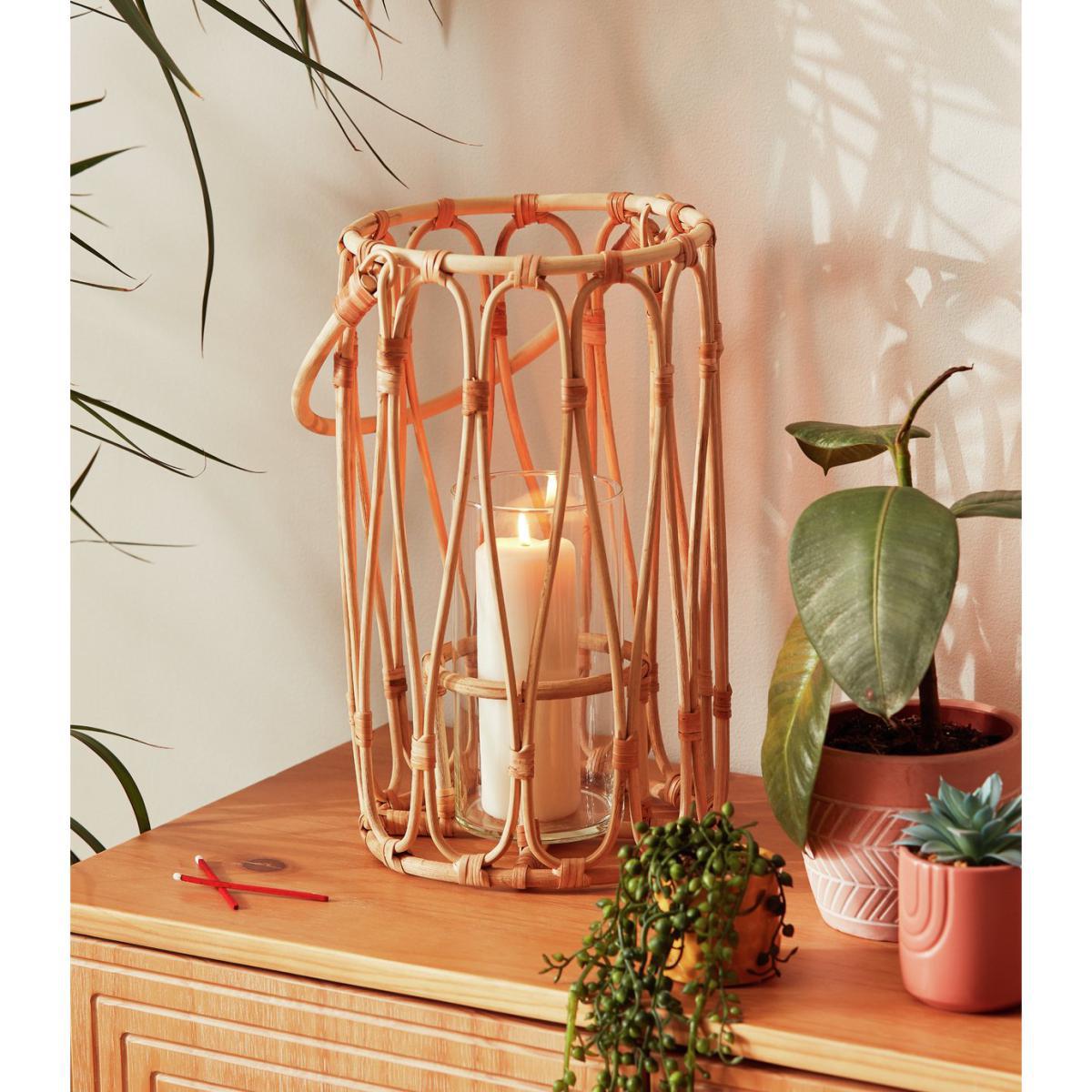 Set the mood to retro with our large bamboo lantern. Pop a candle in the glass holder and strike a match for an instant cosy glow. See how the bound rattan cylindrical frame throws dancing shadows on surrounding surfaces. Coming in from the garden or moving from kitchen to lounge? Just pick the lantern up using the woven handle and take the light with you. Shine on.