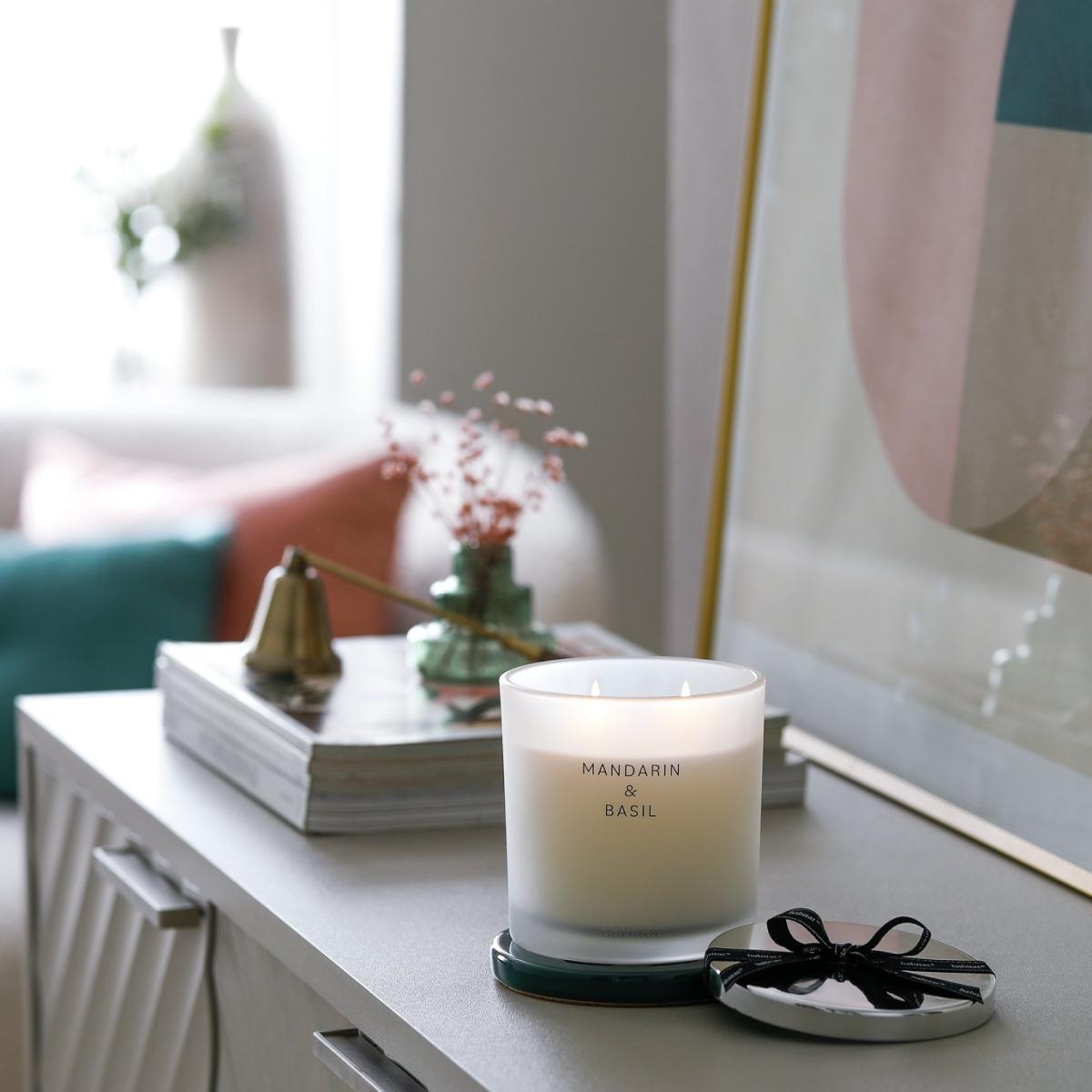 I love this candle for its sophisticated scent combination of mandarin and basil, which adds a fresh and uplifting touch to any space. Its large size makes it a real statement piece, ideal for centrepieces or placing on a mantel. It works well in both contemporary and classic interiors, especially when paired with neutral palettes or natural textures like wood and linen. Practical styling tips include placing it atop a tray to group with other candles or decorative objects, and using the lid as a temporary cover to preserve the scent when not in use. Its clean, minimalist design also means it can seamlessly integrate into varied colour schemes and styling schemes.