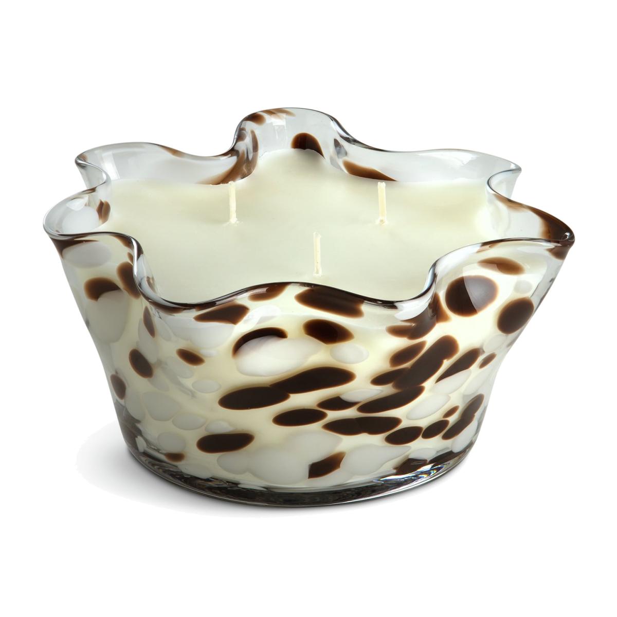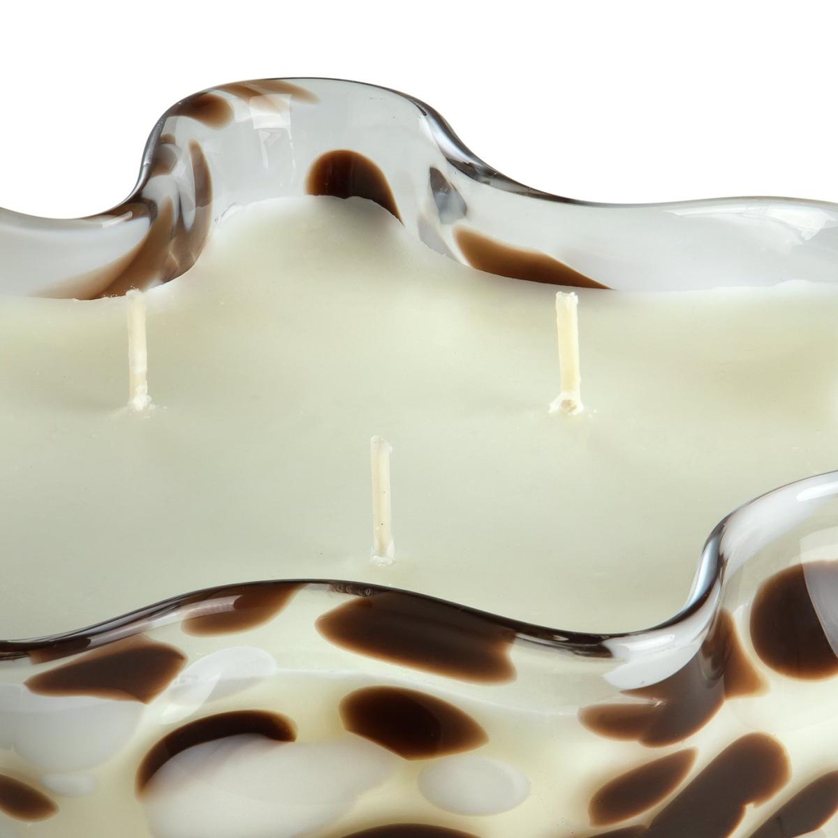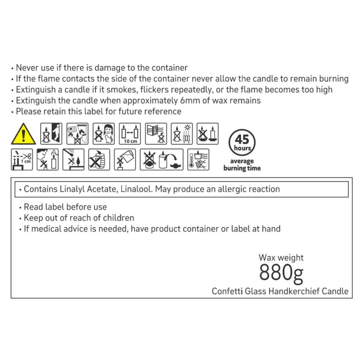 Create a cosy ambience with this handsome candle. Light to enjoy the gentle scent of sweet bergamot blended with white suede and creamy amber wafting through your home. Poured into a sculptural confetti glass holder with handkerchief curves. White Suede & Amber scent. Paraffin wax. Approximate burn time 45 hours. Size H10, Diameter 20cm.