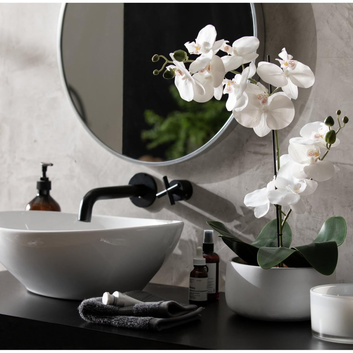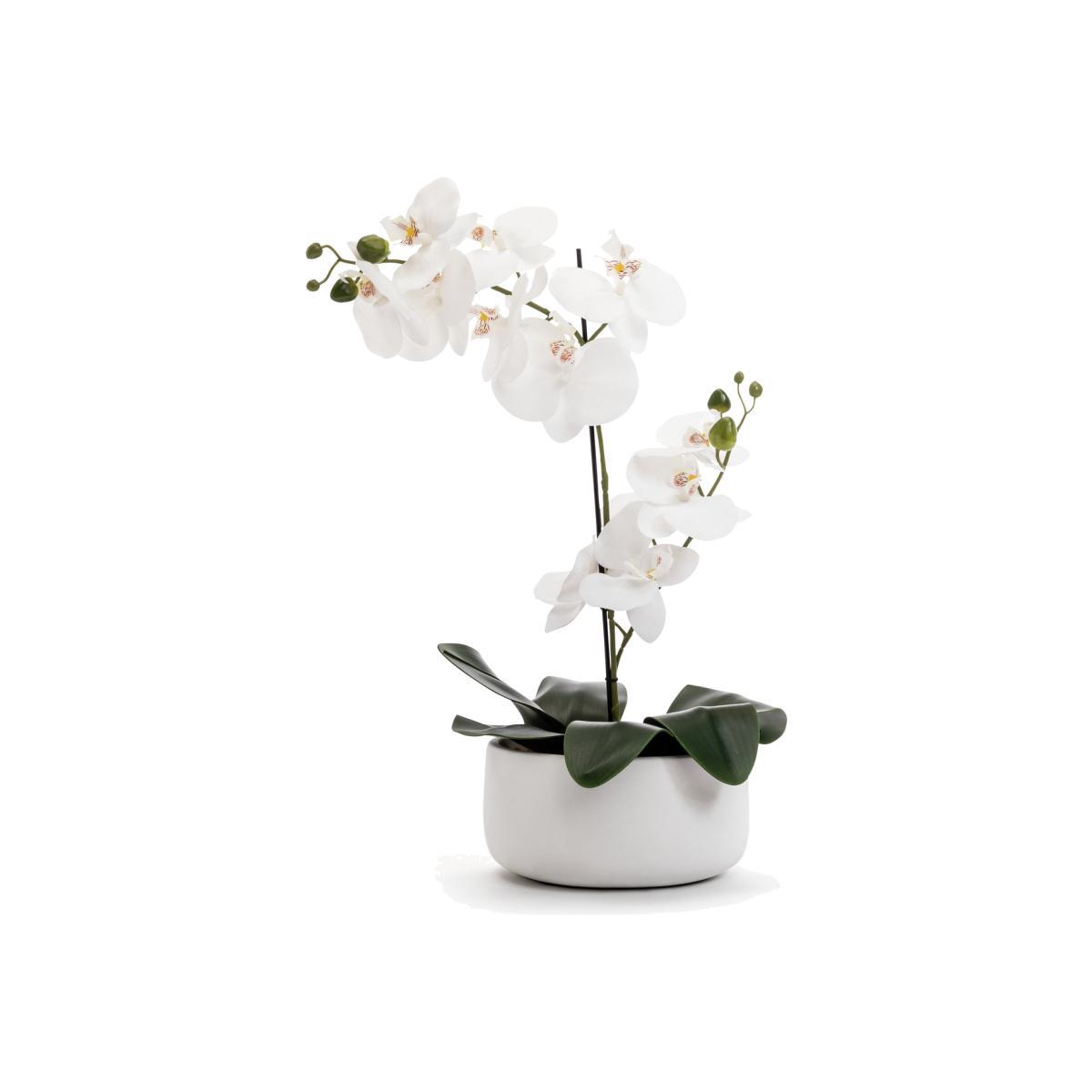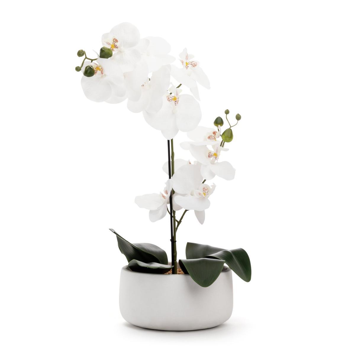 Best buds. Our fab faux orchid brightens up any room without adding to your workload. Charming as a coffee table centrepiece or calming desk companion, this leafy lovely displays an array of bright open flowers and shoots. And it comes in a large white ceramic pot that's timeless and contemporary. A maintenance-free marvel, this one's blooming brilliant.
