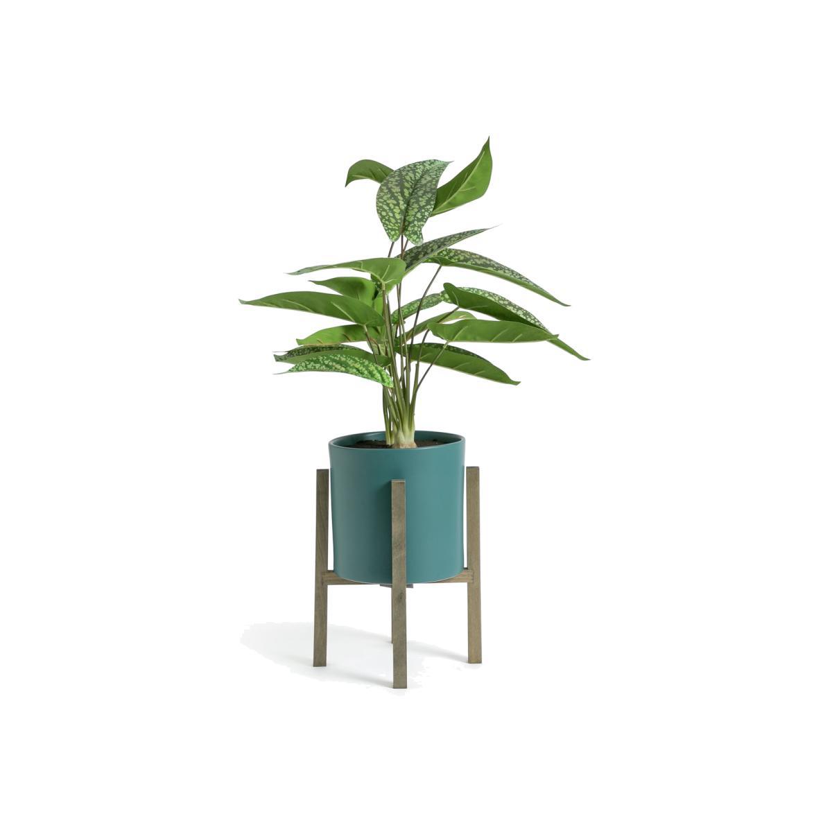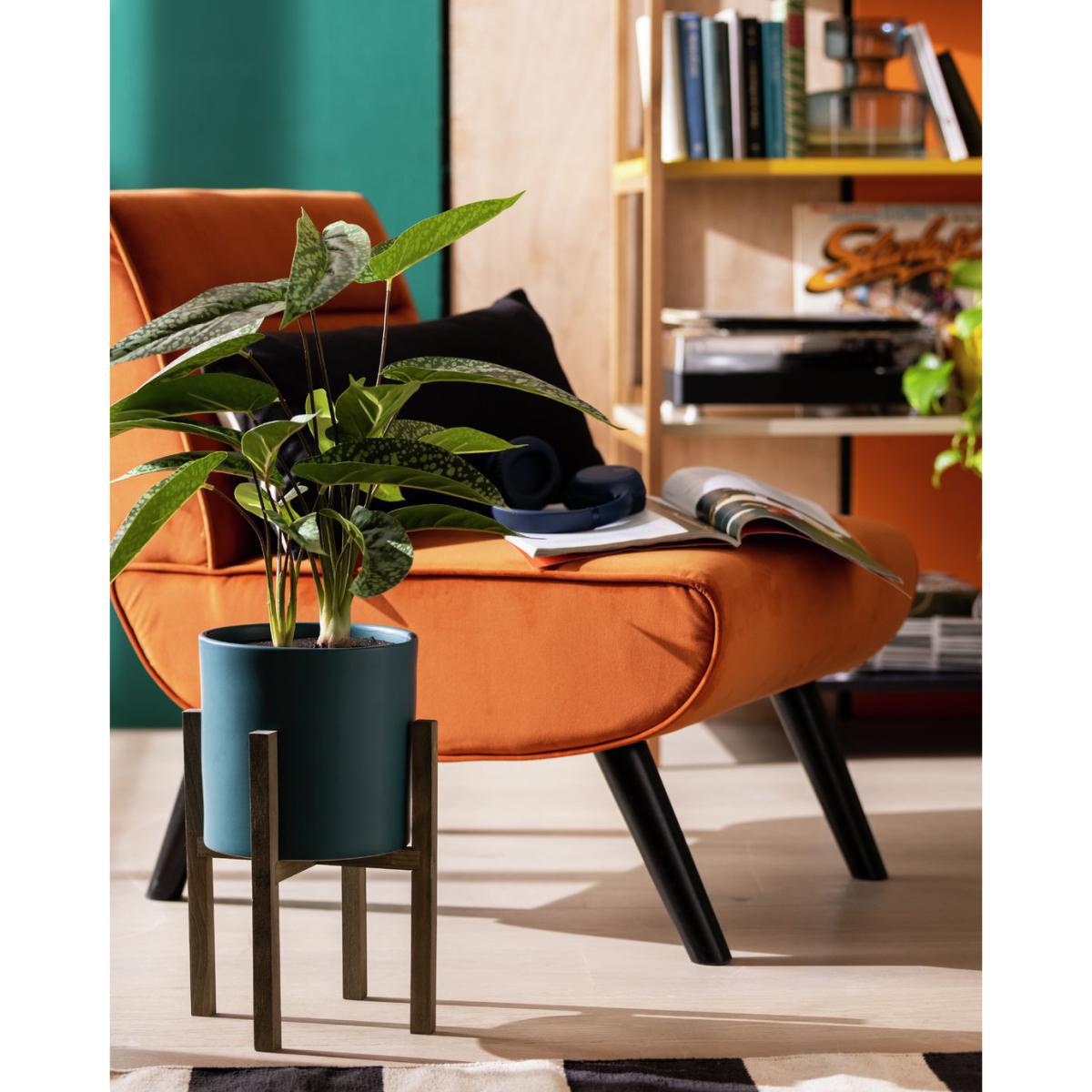 Raise the bar, with this charming raised planter which features a large leafy, tropical faux botanical. Borrowing from Mid Century design inspiration it's petrol blue earthenware pot perches inside a raw wood frame to bring a homely and natural feel to your home.