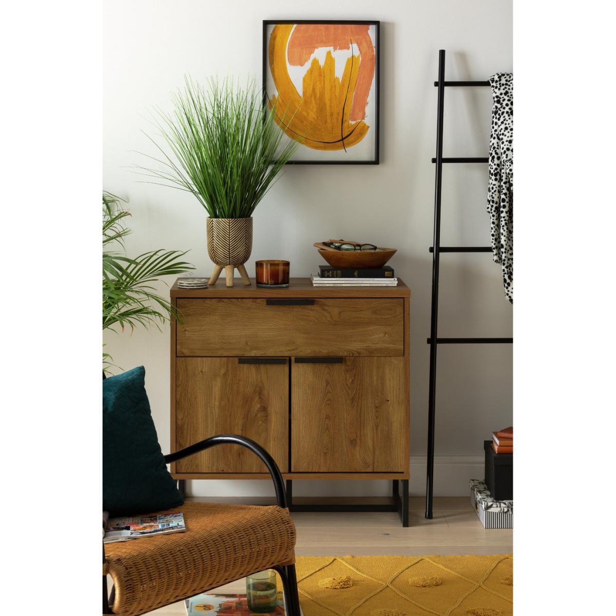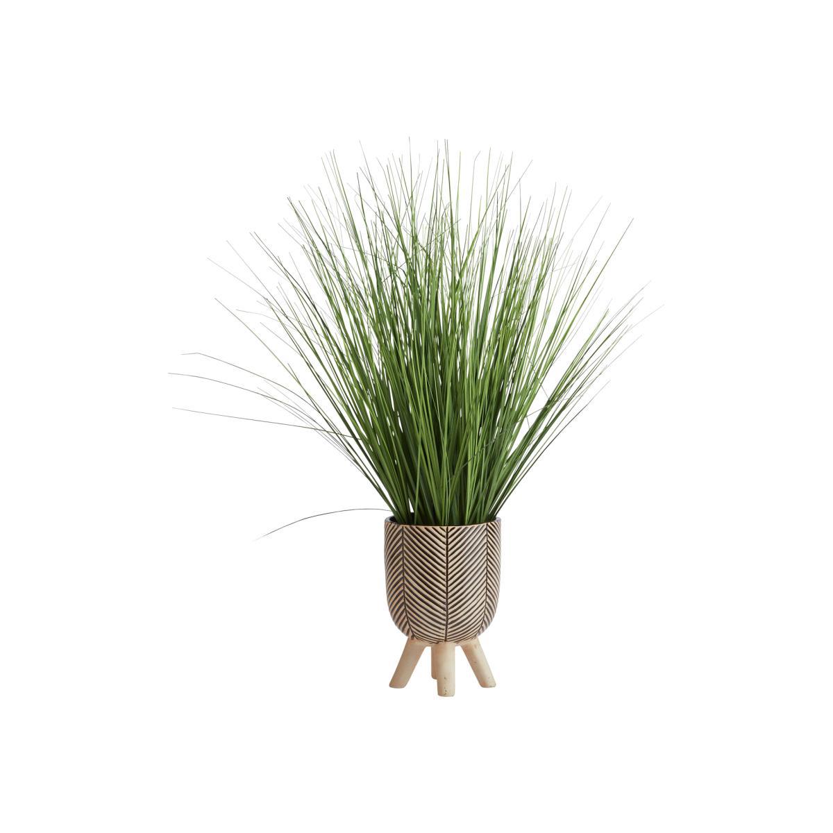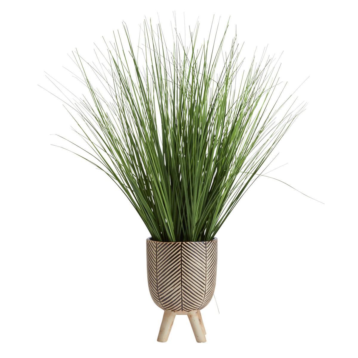 Bring a burst of freshness to your space with our tall faux grass. Gorgeously green, its life-like fronds spring from a rustic black and cream patterned pot. On 4 sturdy diagonal legs, it'll sit proudly on your sideboard or table. The stunning striped design and rounded body give this planter a primitive edge. And the best bit? No sunlight, watering or pruning required. Go wild.