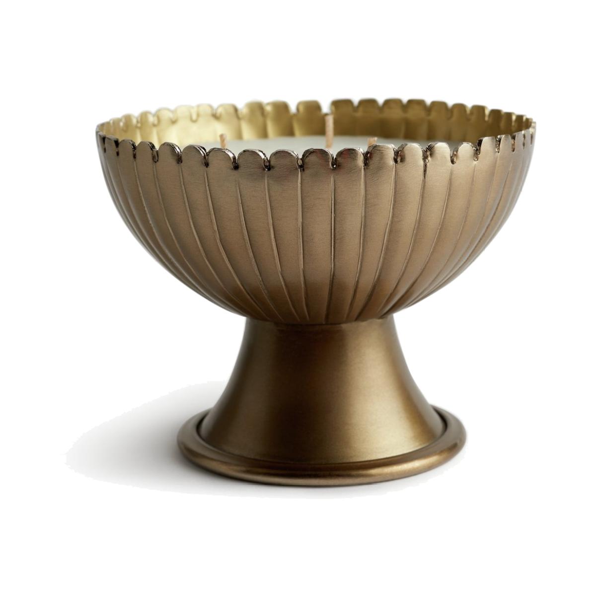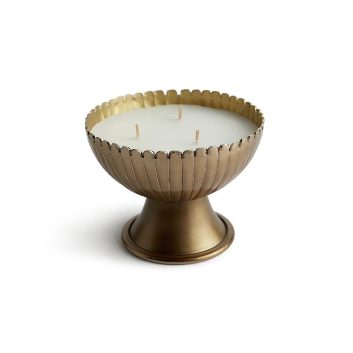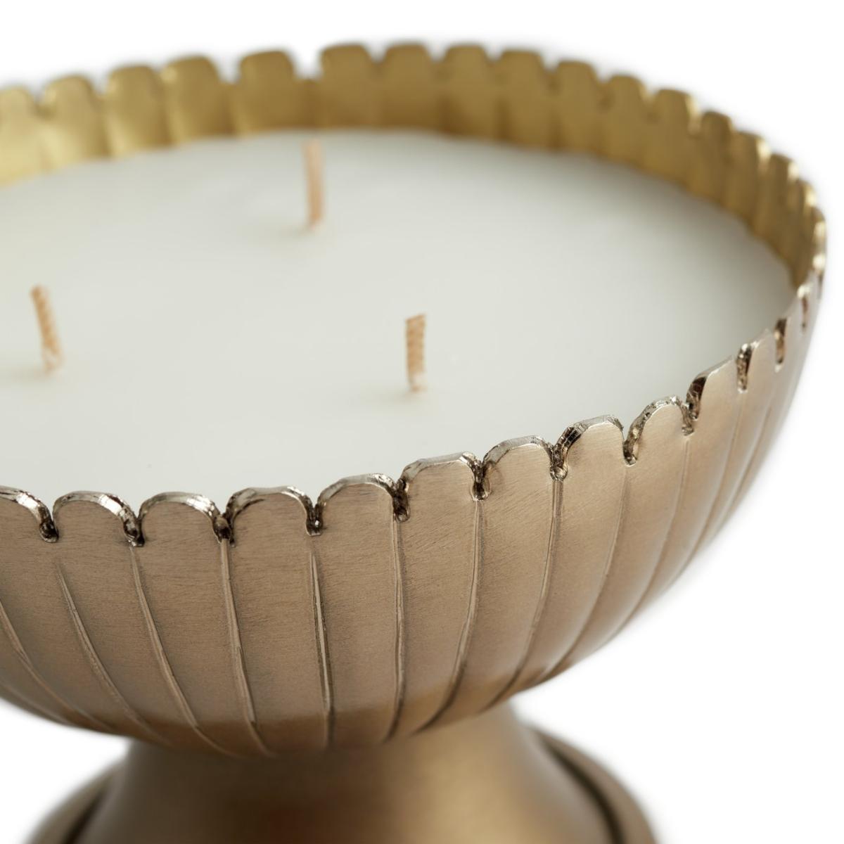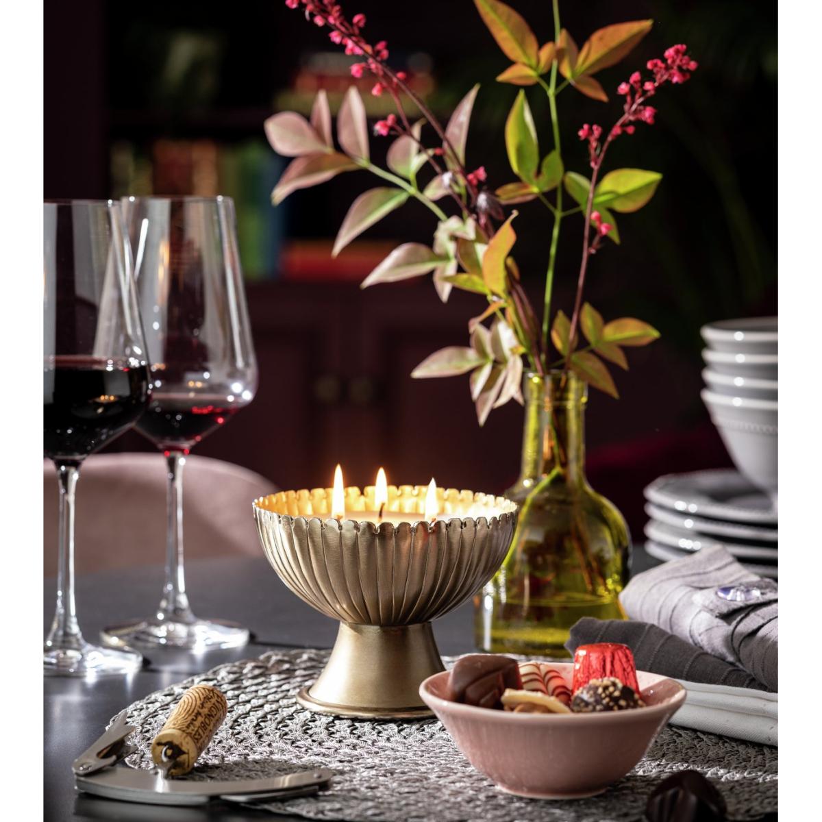 Get the golden glow. Our large, scented candle makes a glittering centrepiece. Set the mood in seconds. Just light up the trio of wicks for a soothing, sensual feel. Enjoy the calming aroma as it floats through your home. We're all about its metallic finish and textural details. Dinner party or a night by the fire? Light up for an instant intimate ambience. Divine.