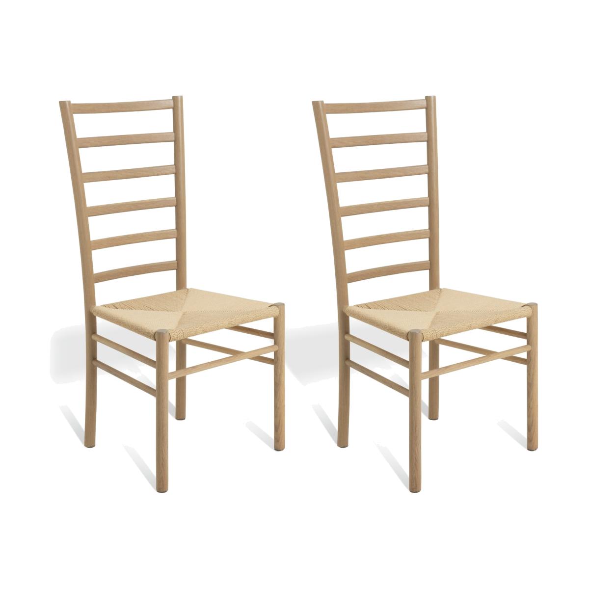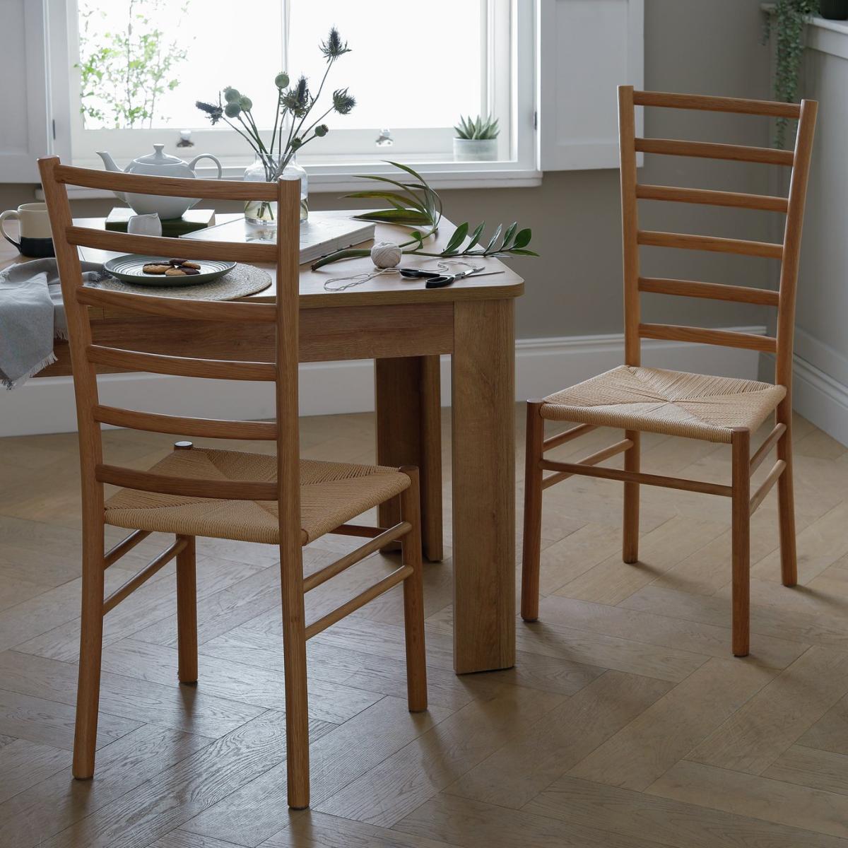 Taking inspiration from classic design, this pair of dining chairs offer insta-style looks. Enjoy the rich warm grain of the natural oak turned frame. Look how the splayed back rest is finely honed to a smooth finish for comfort. While a firm but shaped woven seat pad provides ample support for easy sitting through long social occasions. What's next? Just place 2 or more around your table and wait for the compliments to flow. If natural oak and eye-catching style is for you, look at our Laurie collection for more pieces. Part of the Laurie collection. Chair: 2 chairs supplied. Size H104, W48.5, D48.5cm. Seat height 59cm. Oak frame with oak legs. Fully assembled -. Max user weight per chair 100kg. Individual chair weight 4.4kg. Dust or wipe with a damp cloth only. Package Dimensions: Chair package size: H76, W51, D51cm. General information: We are excited to be welcoming some of our favourite HOME products into the Habitat range. Your product may arrive in Habitat or HOME packaging. Manufacturer's 1 year guarantee.