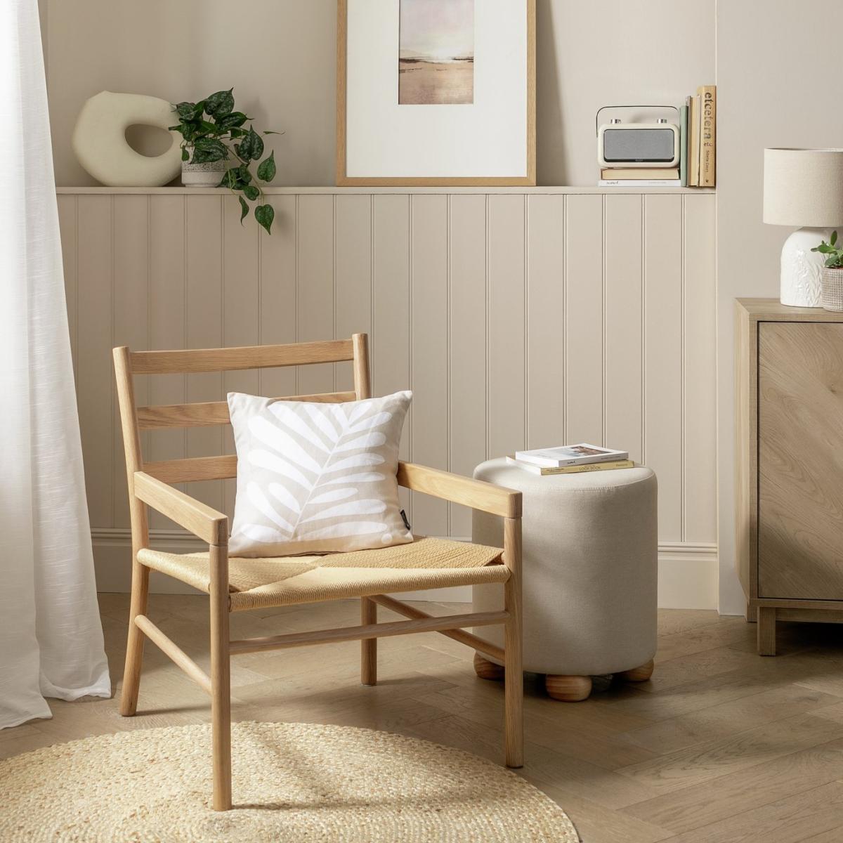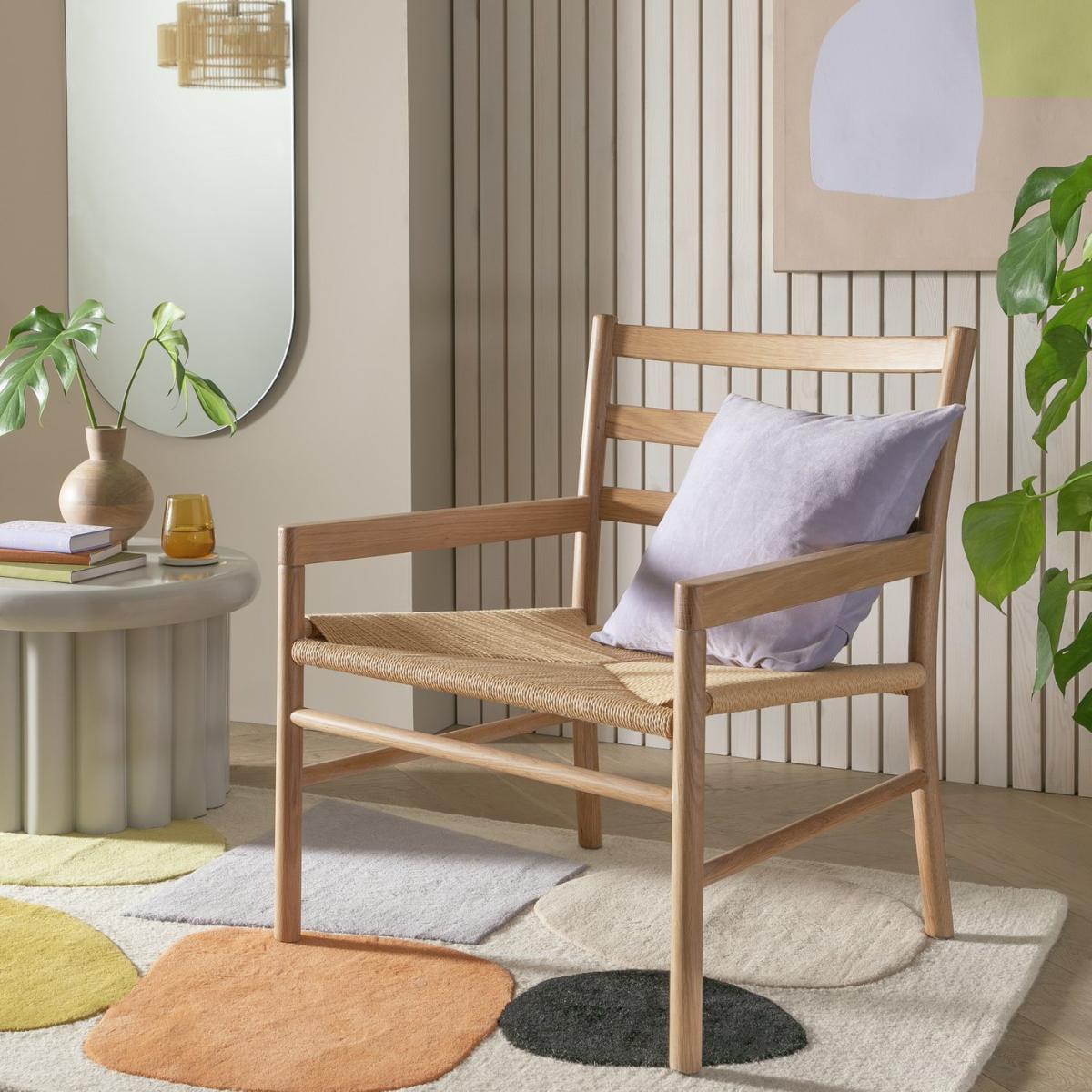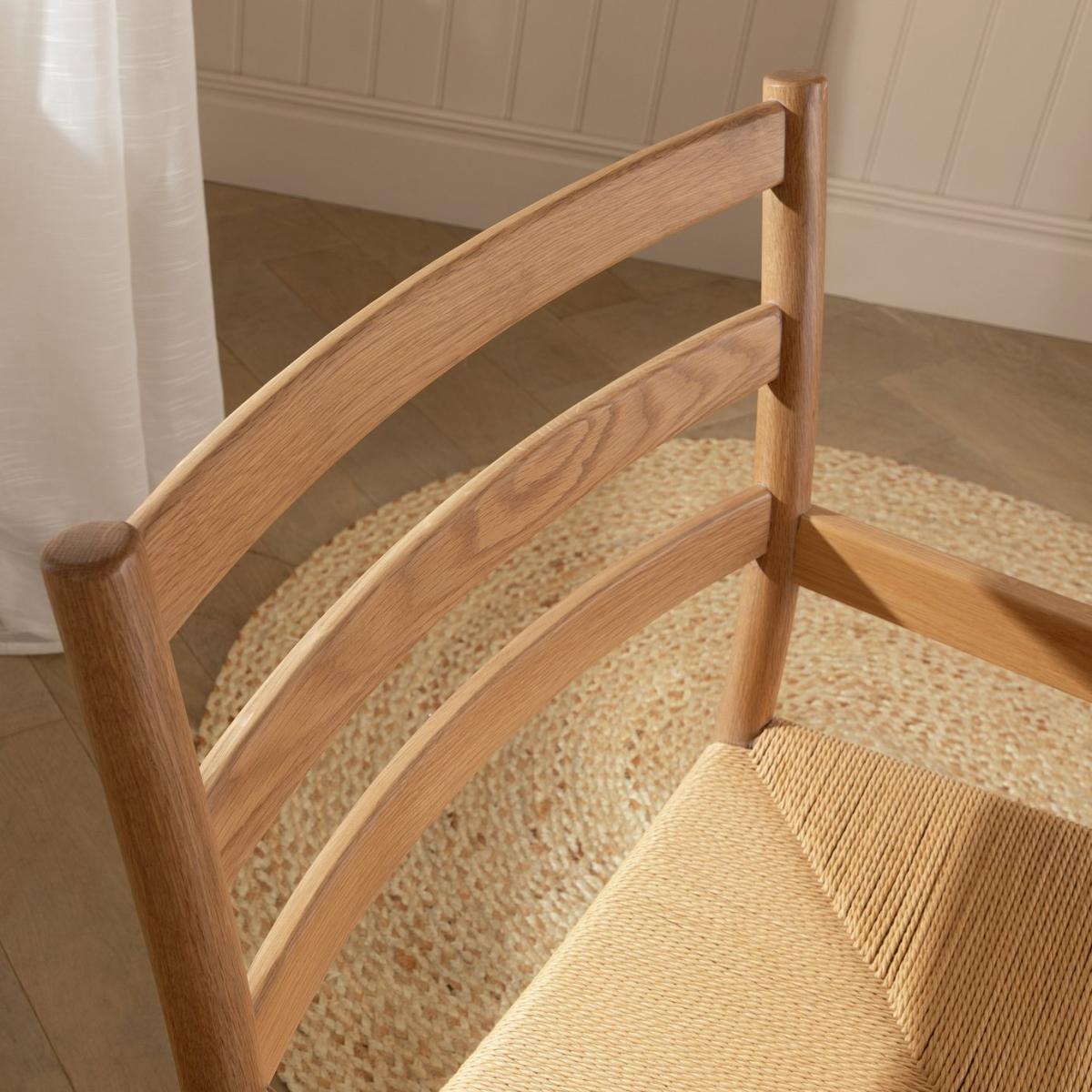 Lounge with Laurie. A solid oak chair in contemporary country style. Crafted with your sitting position in mind. Legs that sweep into a relaxed and comfy angle and a gently curved backrest is the result of traditional steam bending techniques. While the spacious woven seat is shaped for lasting support. Laurie offers all the features of a classic oak chair while catering for a modern way of living. Part of the Laurie collection. Dimensions: Size H79, W65.5, D70cm. Depth of seat: 58.1cm. Weight 7.3kg. Self-assembly. Maximum individual user weight 110kg. Packaged dimensions: Package size H69, W81.5, D73cm. FSC certified meaning the materials used for this product are responsibly sourced. General information: Manufacturer's 2 year guarantee.