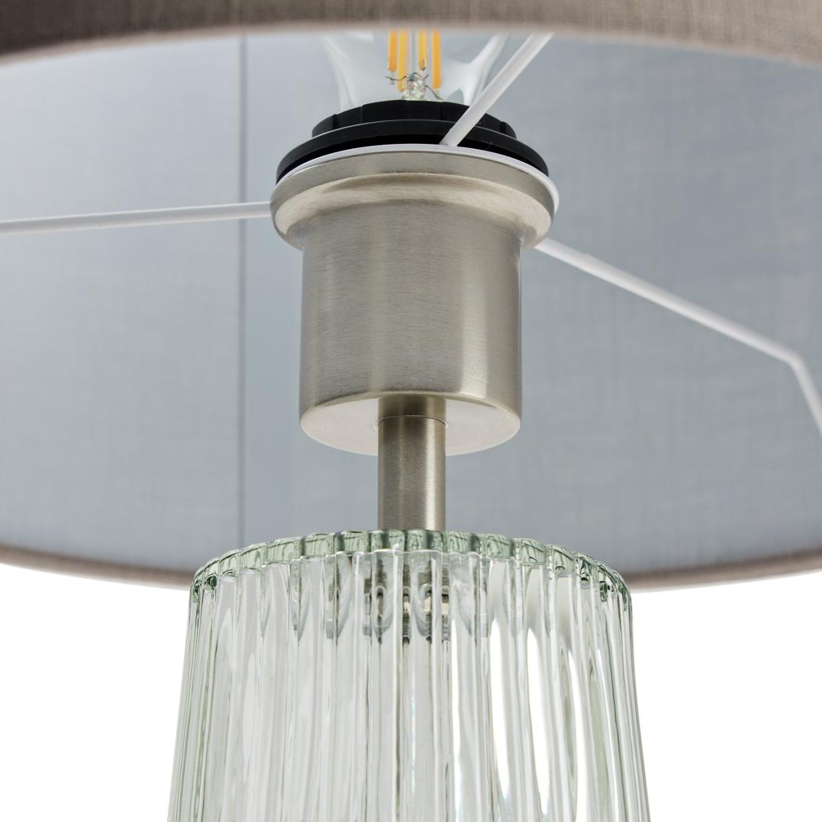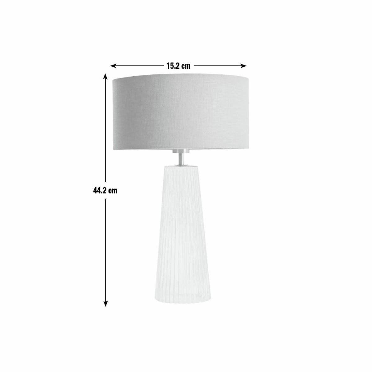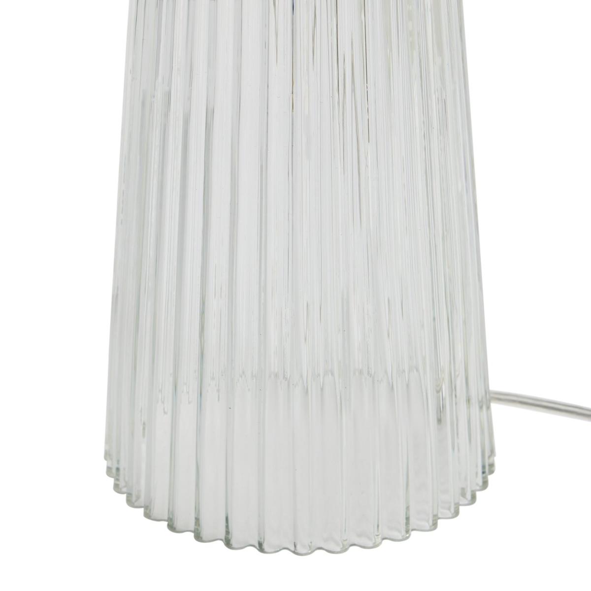Parisian chic. Our Le Marais lamp captures the glamour and refinement of French style with a distinctive ribbed glass base that radiates vintage elegance. Pair with a neutral shade or dial up the drama with a bright colour. Tres chic. Dimensions: Overall size H44.2, Diameter 15.2cm. Diameter of base 15.2cm. Cord length 1.8m. Bulb Information: Bulbs required 1 x globe E27 edison screw LED bulb(s)(not included). Recommended maximum wattage: 8 watts. LED bulb only. General Information: Base colour: clear. Base material: glass. In-line switch. IP rating 20. Fully assembled. Product is mains powered plug in. This lighting product is a class 2 fitting. Manufacturer's 1 year guarantee.
