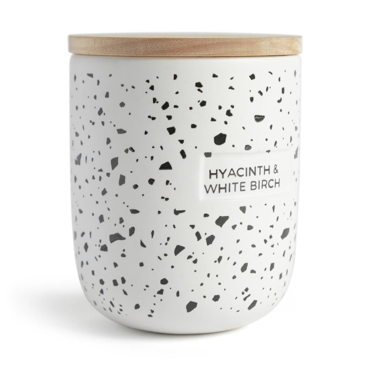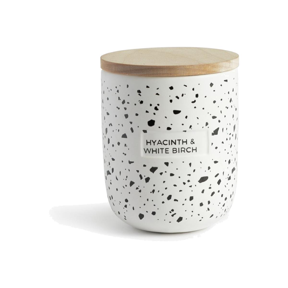 Bring springtime into your home. This hyacinth and birch scented candle is fresh, floral and fabulous. There's nothing like candlelight and a fragrant heady scent. Delicate hyacinth and sweet woody notes of birch create a blissful aroma to transform the mood in your lounge or bedroom. Long lasting too with 35 hours of burn time for endless relaxation. The pretty spotted container has a natural wooden lid to protect the wax and wick. Immerse yourself in a flower garden.