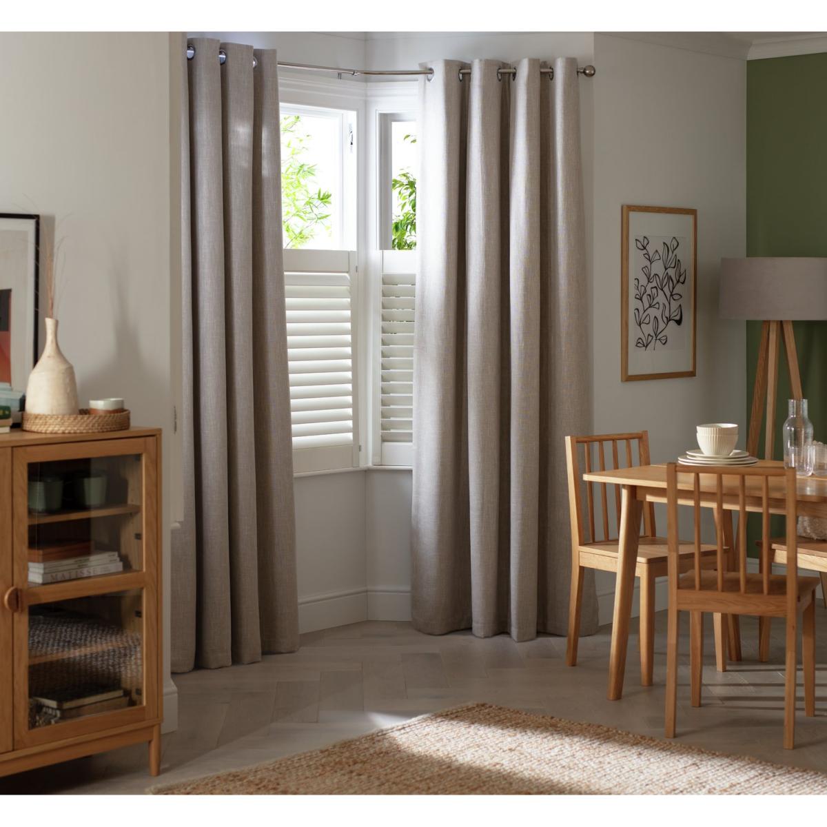 Light blocking linen. Thats the big draw of these blackout eyelet curtains. In neutral oatmeal they have the textured look of linen in a calming, back to nature shade. Designed for privacy the lining also means each curtain falls into soft satisfying folds from the shiny stainless-steel eyelets. Simply soothing. Bring out the natural beauty of these textured fabric curtains by choosing cushions and rugs that pick up on the relaxing decor. Oatmeal Plain Design. Silver stainless Eyelets. Features Blackout thermal. Polyesterviscose. Lined. Lining made from 100% polyester. Dimensions Size 168cm (66 inches) wide by 229cm (90 inches) drop. Dimensions provided include header tape. Width refers to one curtain panel before hanging. Eyelet diameter: 4cm. General information Contains one pair of curtains. Curtain pole not included. Dry clean only. General Information: We are excited to be welcoming some of our favourite HOME products into the Habitat range. Your product may arrive in Habitat or HOME packaging.