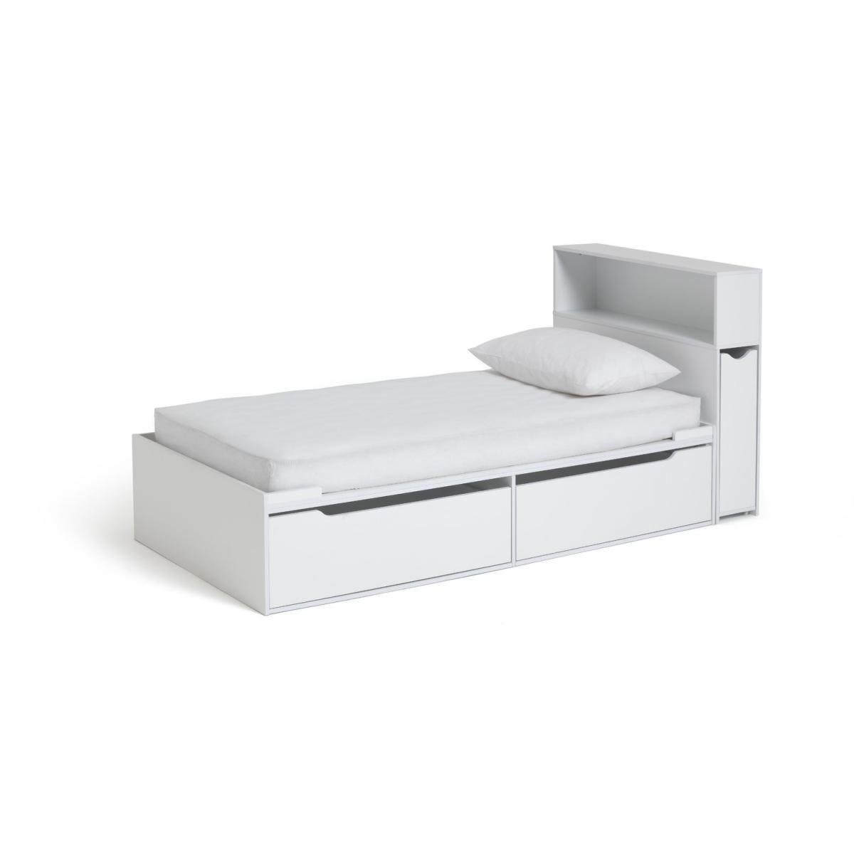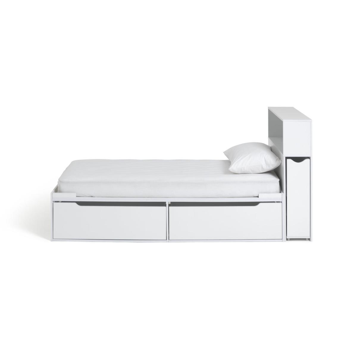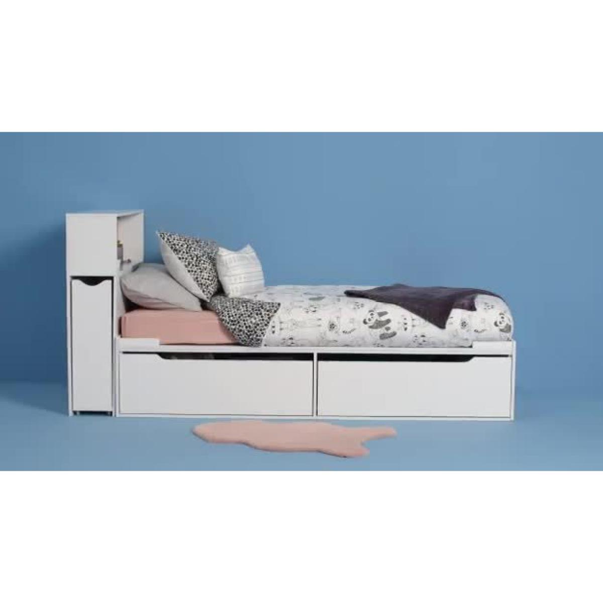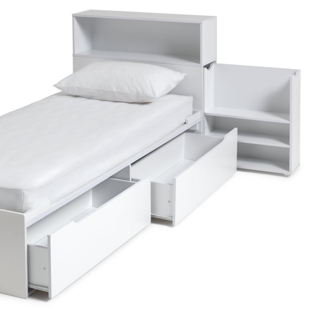 Combine smart storage with modern style. The Lloyd single cabin bed with storage headboard comes with an in-built shelf and pull-out side drawer, plus 2 deep underbed storage drawers. The perfect hideaway for toys, clothes and more, this bed is a great space-saver, keeping everything you need in one tidy footprint. Its white finish and cut-out handles create a fresh and uncluttered look. A modern and sturdy bed designed to last as your child grows, from age from 6 years upwards.