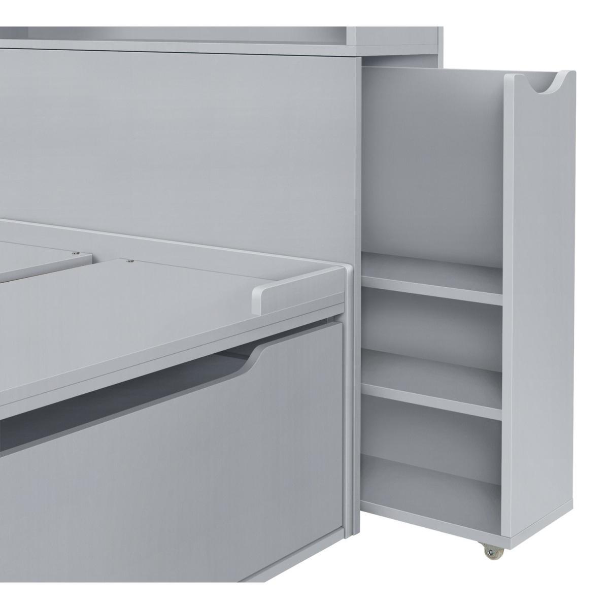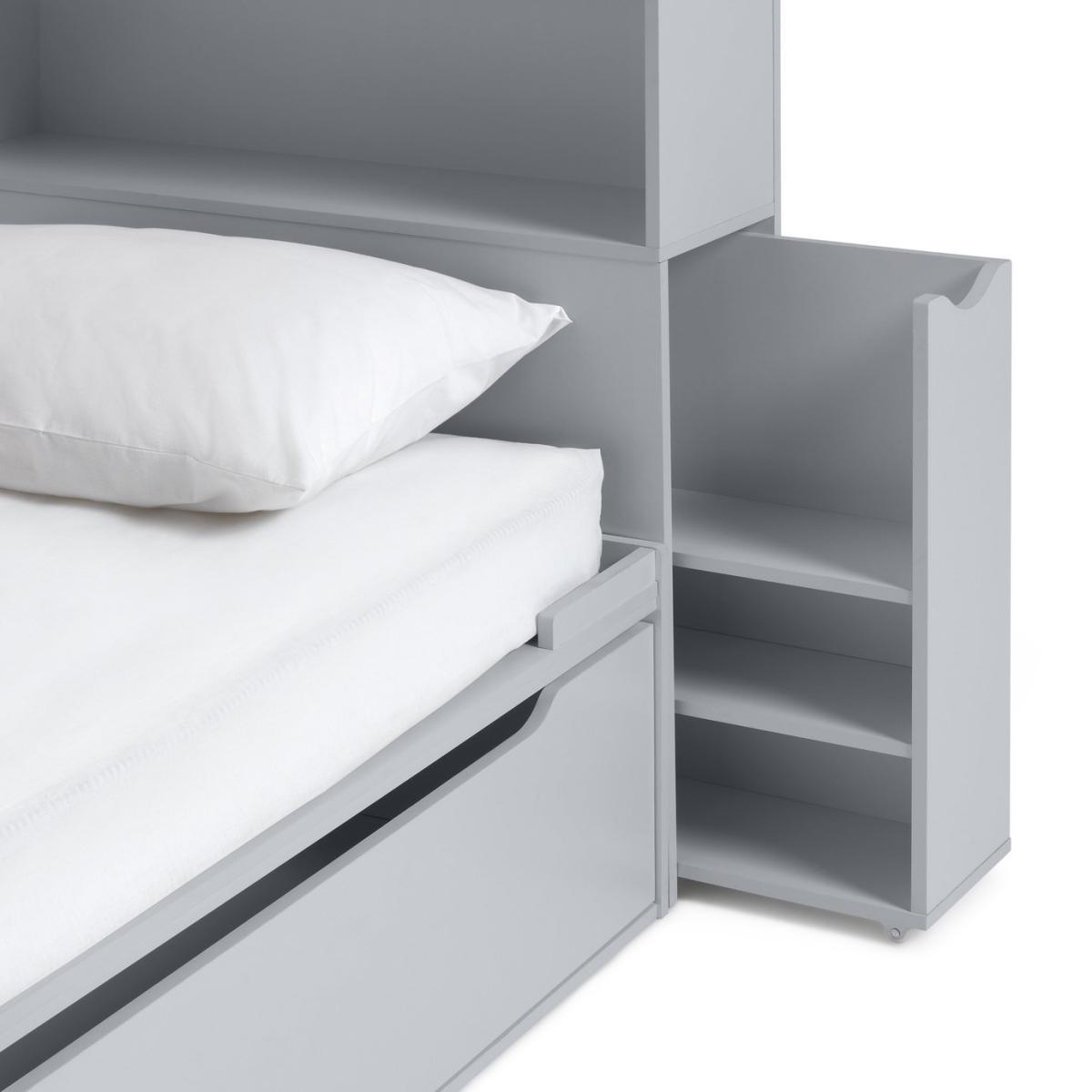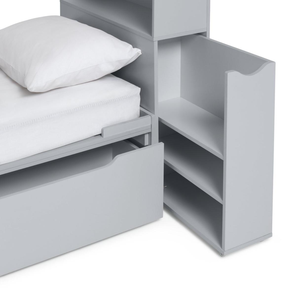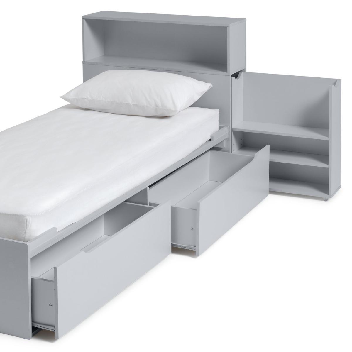 Combine smart storage with modern style. The Lloyd single cabin bed with storage headboard comes with an in-built shelf and pull-out side drawer, plus 2 deep underbed storage drawers. The perfect hideaway for toys, clothes and more, this bed is a great space-saver, keeping everything you need in one tidy footprint. Its grey finish and cut-out handles create a fresh and uncluttered look. A modern simple bed designed to suit any age from 4 years upwards.