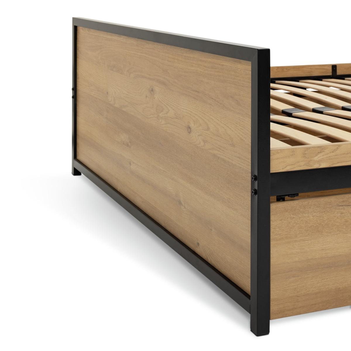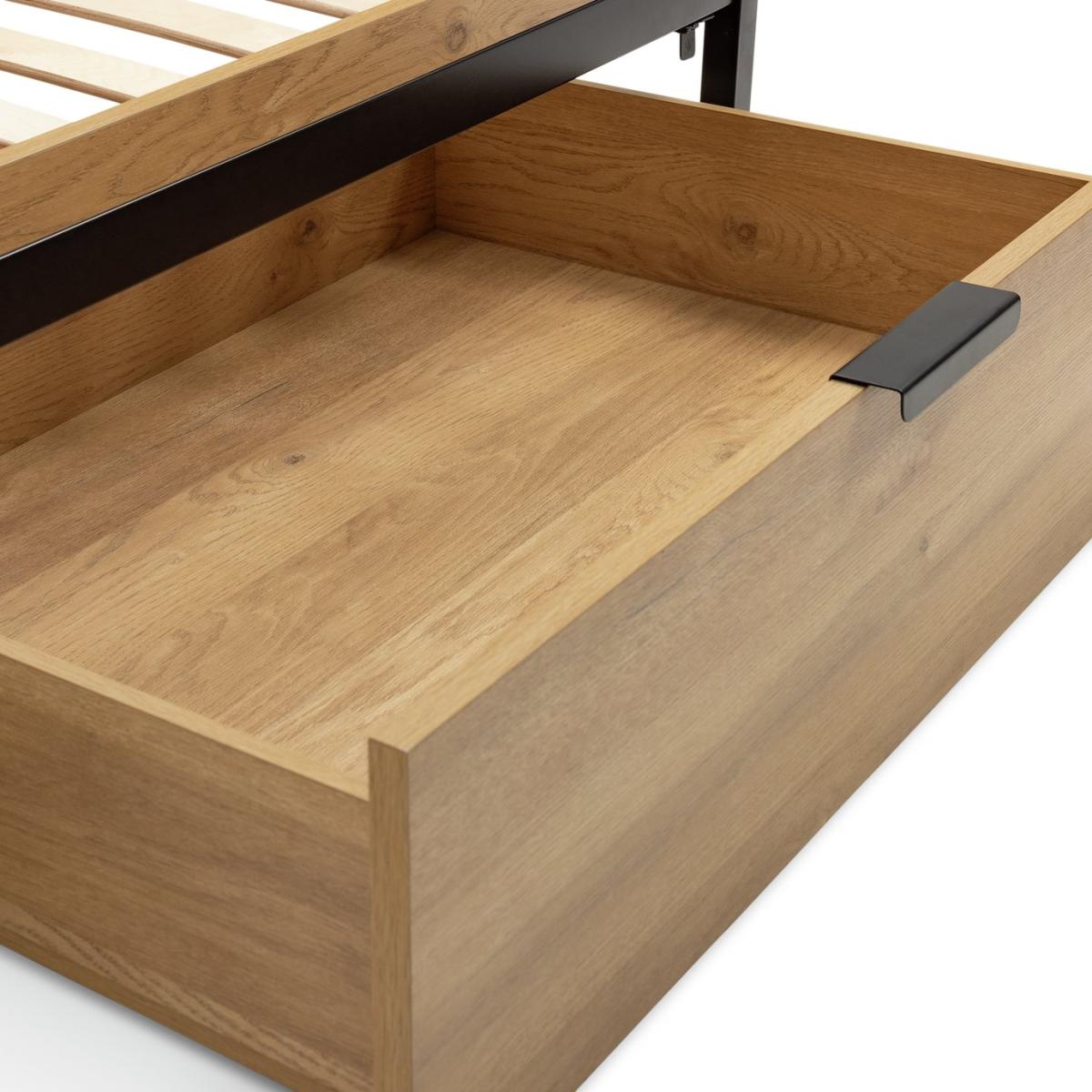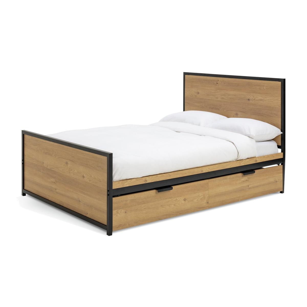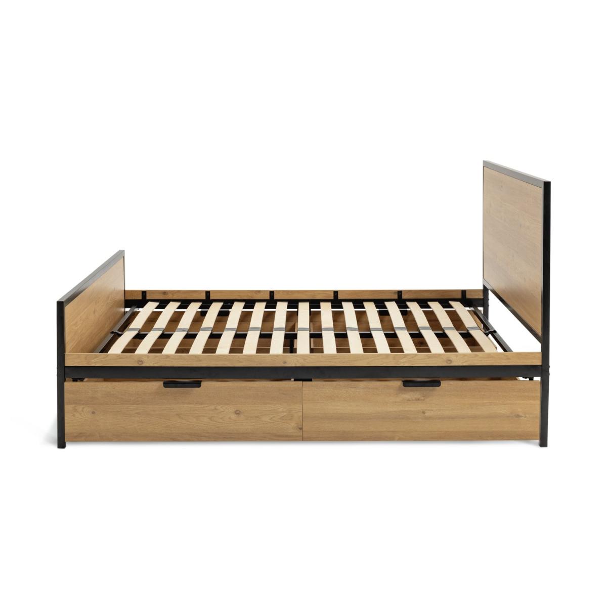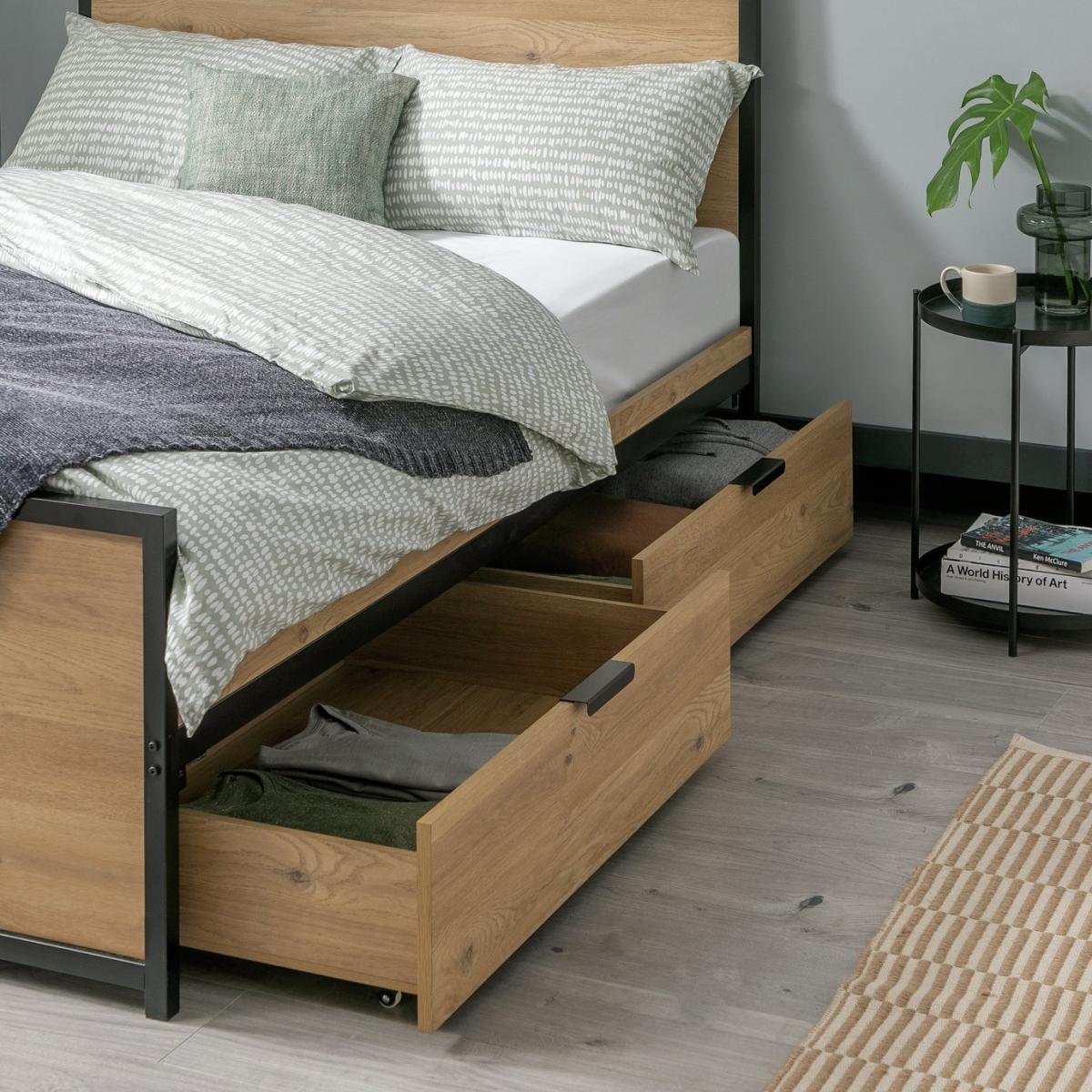 Nail that loft apartment look with this industrial style bed frame. Fashioned from powder coated steel and warm oak-effect wood. Cool looks for urban acolytes. And there's more. With spacious drawers in the base, you can neatly stow away blankets, seasonal clothes and things you'd like to keep out of sight. Awesome. Part of the Loft Living collection. Metal frame. Metal feet. Base with metal slats. 2 storage drawers. Storage capacity: 0.15 litre. Size W142, L197.6, H106.6cm. Height to top of siderail 38cm. 28cm clearance between floor and underside of bed. Drawer size H27, W61.8, D95.4cm. Weight 80.7kg. Total maximum user weight 220kg. Self-assembly - 2 people recommended. Package Dimensions: Package 1 dimensions: H11, W80, D152.5cm. Package 1 weight: 50.2kg. Package 2 dimensions: H9.5, W41.5, D201.5cm. Package 2 weight: 30.7kg. General Information: Manufacturer's 2 year guarantee. FSC certified meaning the materials used for this product are responsibly sourced.
