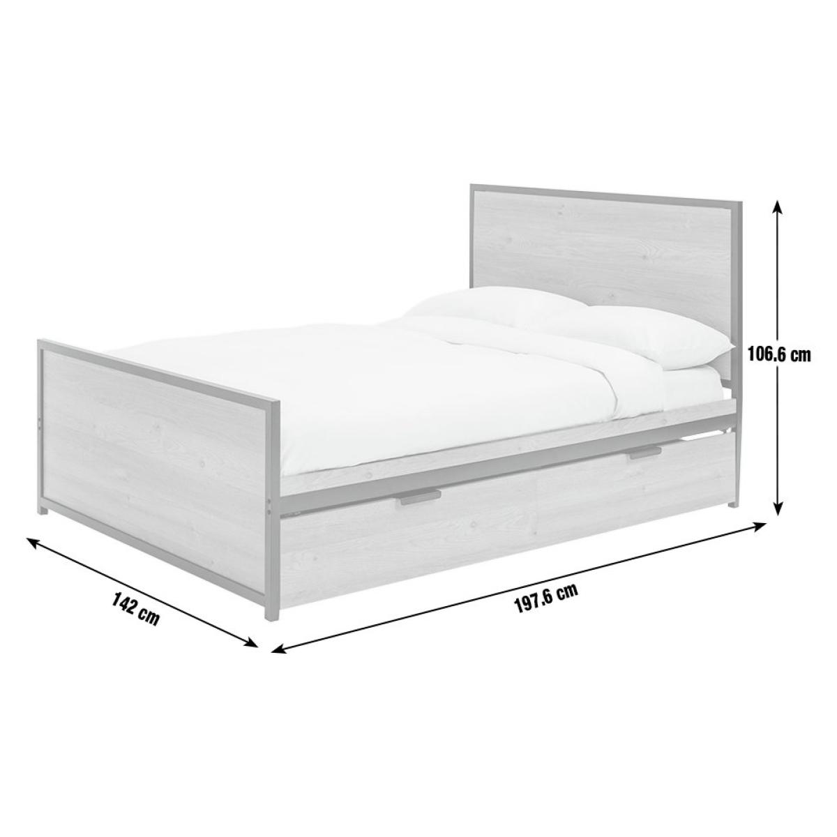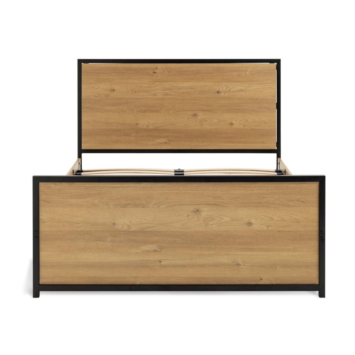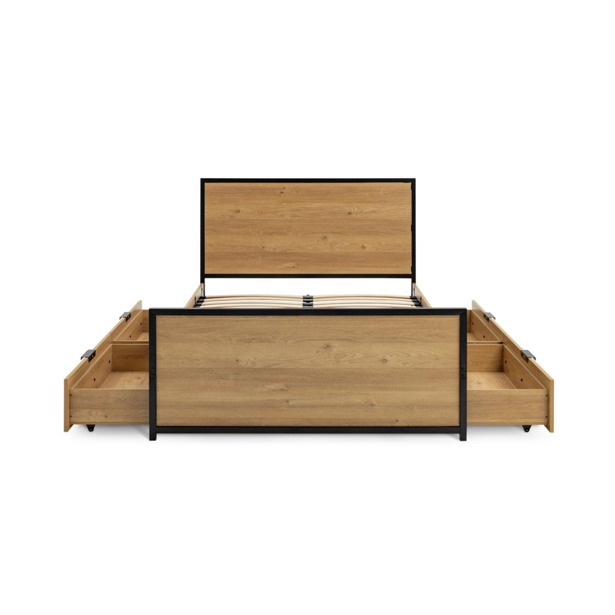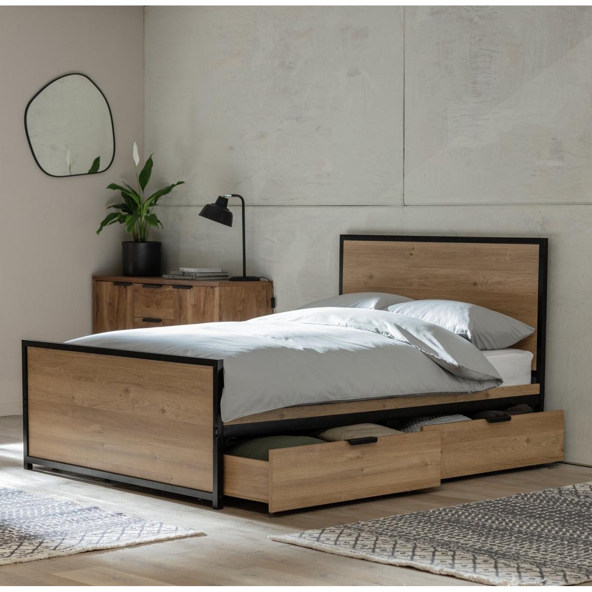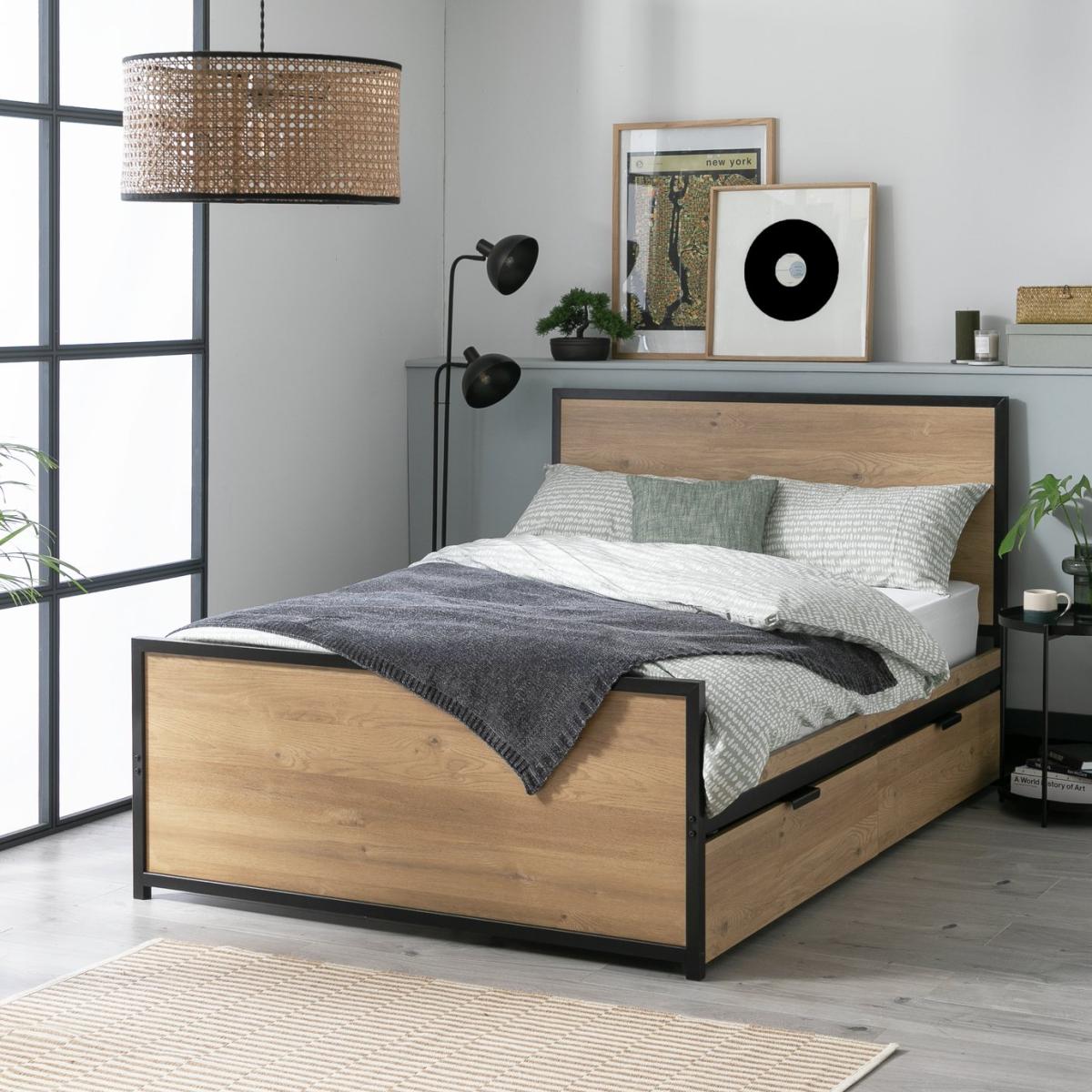 Nail that loft apartment look with this industrial style bed frame. Fashioned from powder coated steel and warm oak-effect wood. Cool looks for urban acolytes. And there's more. With spacious drawers in the base, you can neatly stow away blankets, seasonal clothes and things you'd like to keep out of sight. Awesome. Part of the Loft Living collection. Metal frame. Metal feet. Base with metal slats. 2 storage drawers. Storage capacity: 0.15 litre. Size W142, L197.6, H106.6cm. Height to top of siderail 38cm. 28cm clearance between floor and underside of bed. Drawer size H27, W61.8, D95.4cm. Weight 80.7kg. Total maximum user weight 220kg. Self-assembly - 2 people recommended. Package Dimensions: Package 1 dimensions: H11, W80, D152.5cm. Package 1 weight: 50.2kg. Package 2 dimensions: H9.5, W41.5, D201.5cm. Package 2 weight: 30.7kg. General Information: Manufacturer's 2 year guarantee. FSC certified meaning the materials used for this product are responsibly sourced.