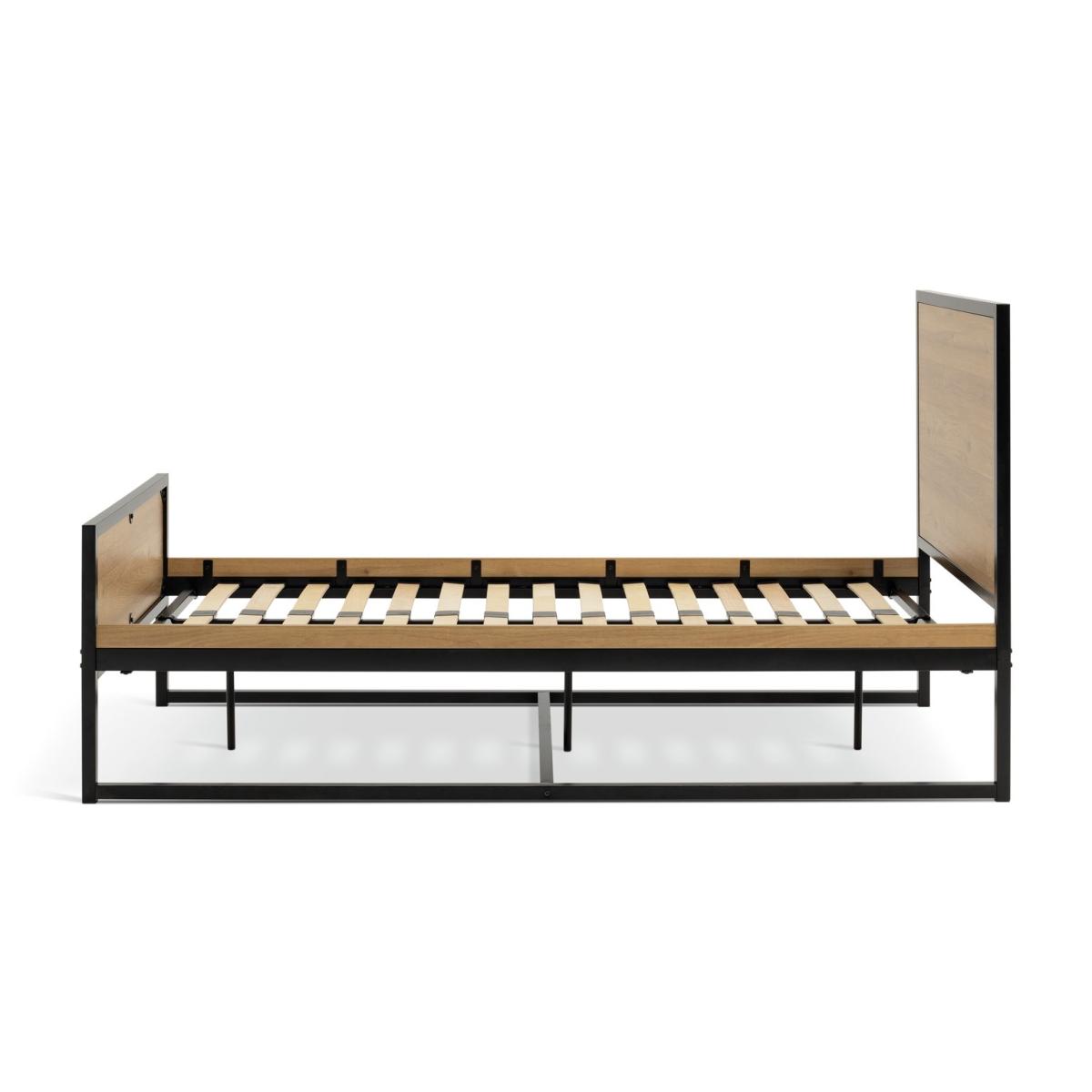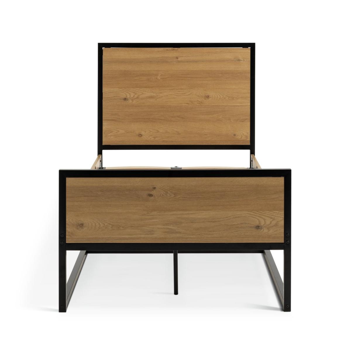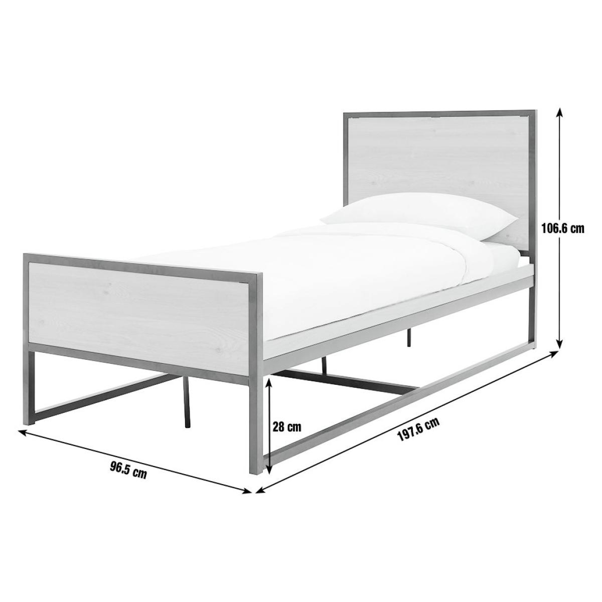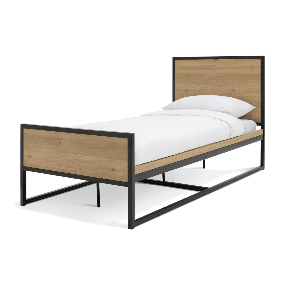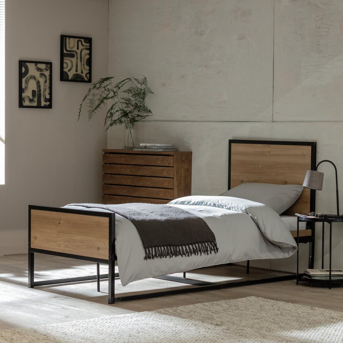 Nail that loft apartment look with this uncluttered, clean, industrial style bed frame. Fashioned from powder coated steel and warm oak-effect wood. Cool looks for urban acolytes. Part of the Loft Living collection. Metal frame. Metal feet. Base with metal slats. Size W96.5, L197.6, H106.6cm. Height to top of siderail 38cm. 28cm clearance between floor and underside of bed. Weight 37kg. Total maximum user weight 110kg. Self-assembly - 2 people recommended. Package Dimensions: Package 1 dimensions: H7, W79.5, D155.5cm. Package 1 weight: 25.7kg. Package 2 dimensions: H6.5, W39, D200cm. Package 2 weight: 21.5kg. General Information: Manufacturer's 2 year guarantee. FSC certified meaning the materials used for this product are responsibly sourced.