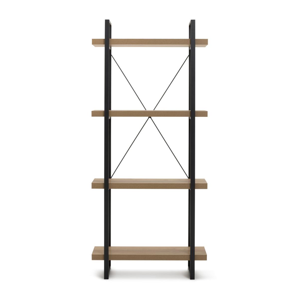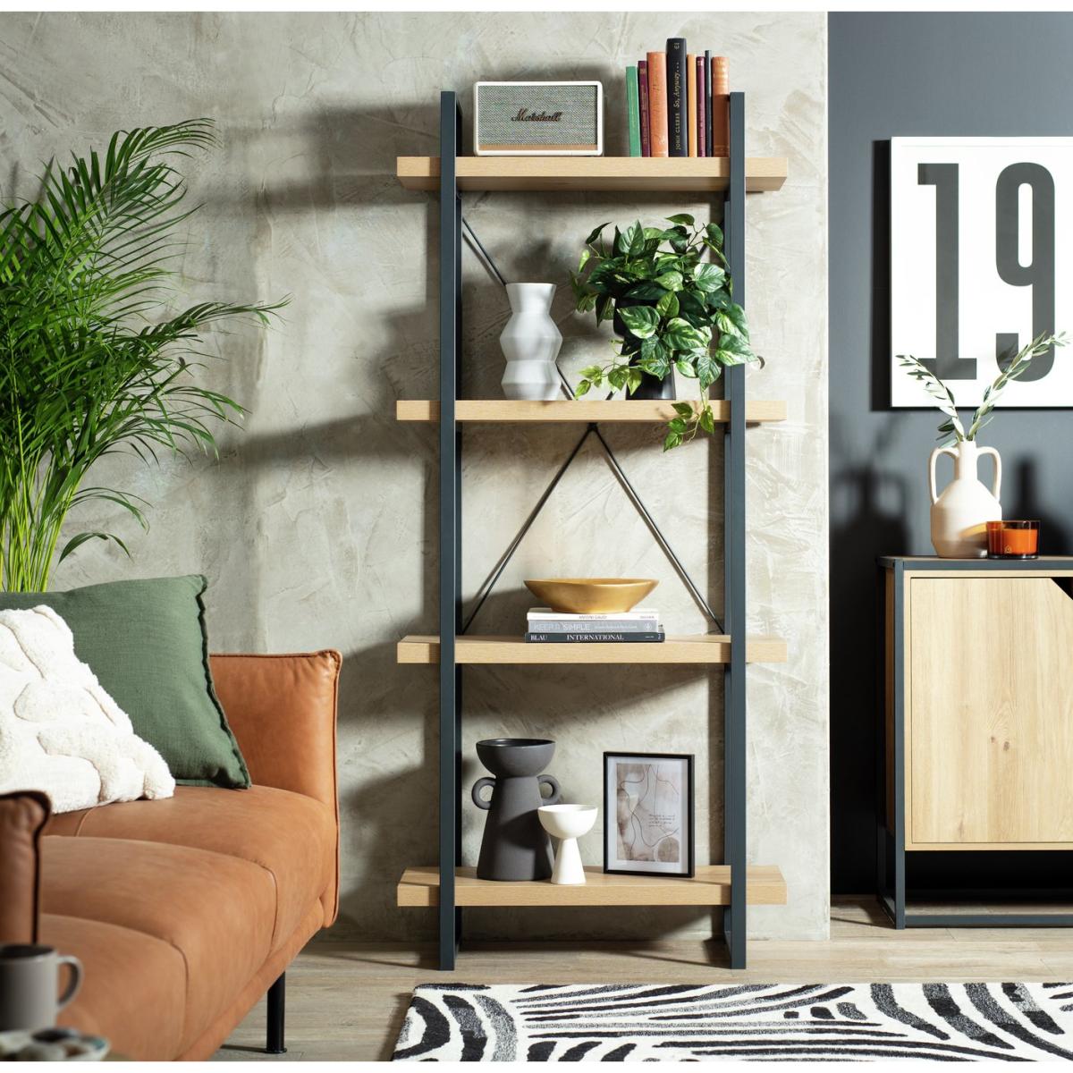 Create a loft living vibe. Enjoy the transformative power of our powder coated steel and oak look bookcase. An angular industrial style frame set against thick shelves with X-shaped back support. Uber cool. Part of the Loft Living collection. Made from steel and MDF with a wood effect finish. 4 fixed shelves. Packed flat - 2 people recommended. If this product is over 60cm high it must be securely attached to the wall to prevent overturning (fixings included). Dimensions: Size H175, W78, D29cm. Weight 20kg. Internal shelf space: H 44.5, W 78, D 26cm. Wall fixing recommended. Recommended maximum load per shelf: 15kg. , ideal for any cube storage boxes up to H44, W78, D26cm. Package dimensions: Package 1 dimensions: H182, W34, D18cm. Package 1 weight: 22.5kg. FSC certified meaning the materials used for this product are responsibly sourced. General Information: We are excited to be welcoming some of our favourite HOME products into the Habitat range. Your product may arrive in Habitat or HOME packaging.