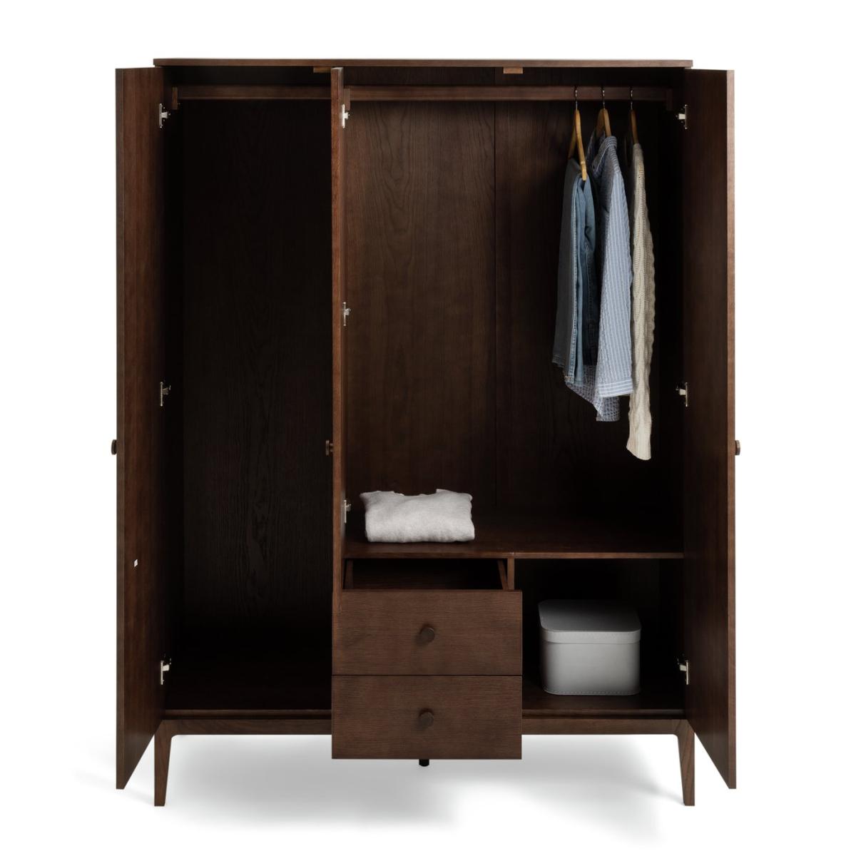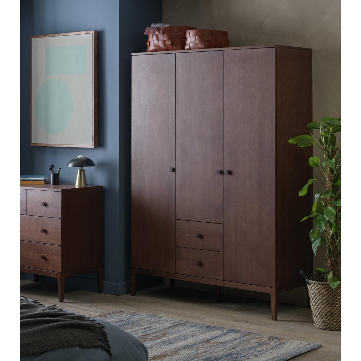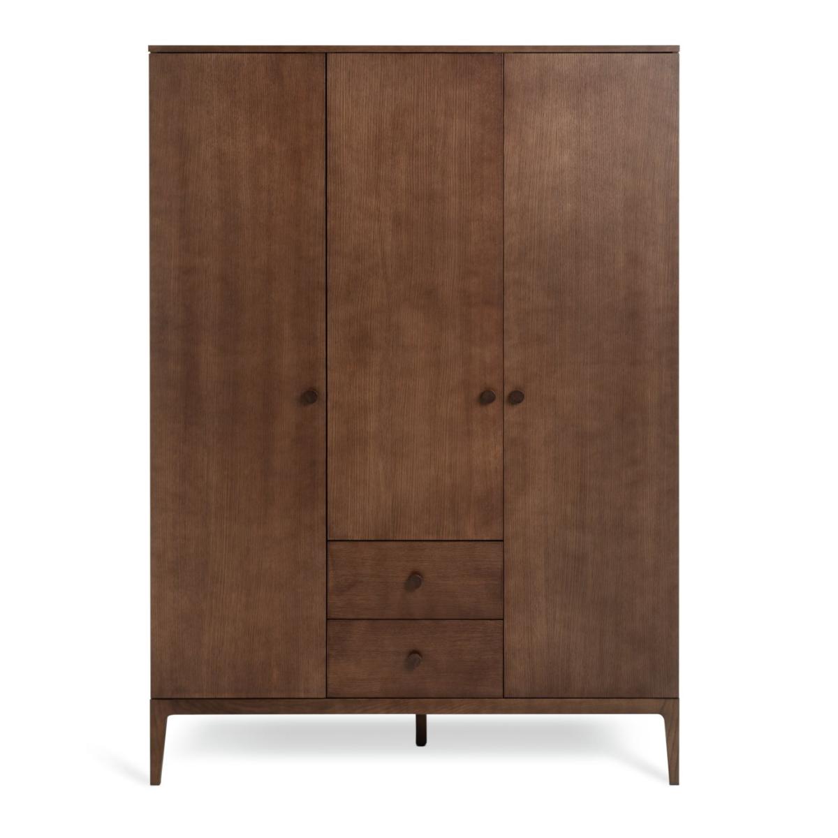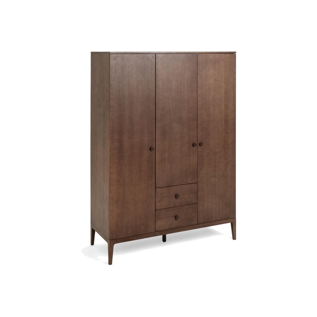 A simple scandi aesthetic meets the inspiration of rich mid-century walnut looks. Making Loxley one of our favourite designs. This 3-door wardrobe shouts high end all over. Echoing the functional principles of those early modernists, our wardrobe offers both long and semi-long hanging from an authentically styled fixed wooden rail. Plus 2 soft close easy glide drawers on metal runners, shelving and a handy cubby. The external drawer styling, and shorter door are typical of the 20th Century period as are the circular turned wooden handles and classically styled plinth. Beautiful, perfectly proportioned and practical. Part of the Loxley collection. Made of solid wood and MDF. Wooden handles. 3 doors. 2 drawers with metal runners. Soft close. 2 fixed hanging rails. Hanging rail holds up to 50kg. 2 fixed shelves. Packed flat - 2 people recommended (includes wall fixings). If this product is over 60cm high it must be securely attached to the wall to prevent overturning. Dimensions: Size H190, W135, D51.5cm. Internal hanging space H155, W43.2, D46.4cm. Internal drawer H15, W36.2, D38.2cm. Handle size: L3.5, W1.5cm. Weight 103kg. Package Dimensions: Package 1 dimensions: H29, W144, D58.5cm. Package 1 weight: 37kg. Package 2 dimensions: H10.5, W177, D57cm. Package 2 weight: 46kg. Package 3 dimensions: H7.5, W177, D2cm. Package 3 weight: 30kg. FSC certified meaning the materials used for this product are responsibly sourced. General information: We are excited to be welcoming some of our favourite HOME products into the Habitat range. Your product may arrive in Habitat or HOME packaging.
