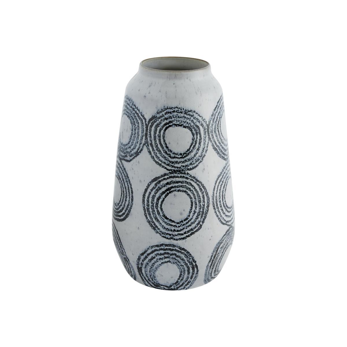The Mabel black and white patterned vase is hand decorated with a stamped, concentric circle design and each piece is unique. Made in Portugal from terracotta and exclusive to Habitat, the vase has a reactive glaze that gives the base colour faint grey flecks and smudges the circles' edges. We advise using a coaster or mat under this vase to protect your surfaces.