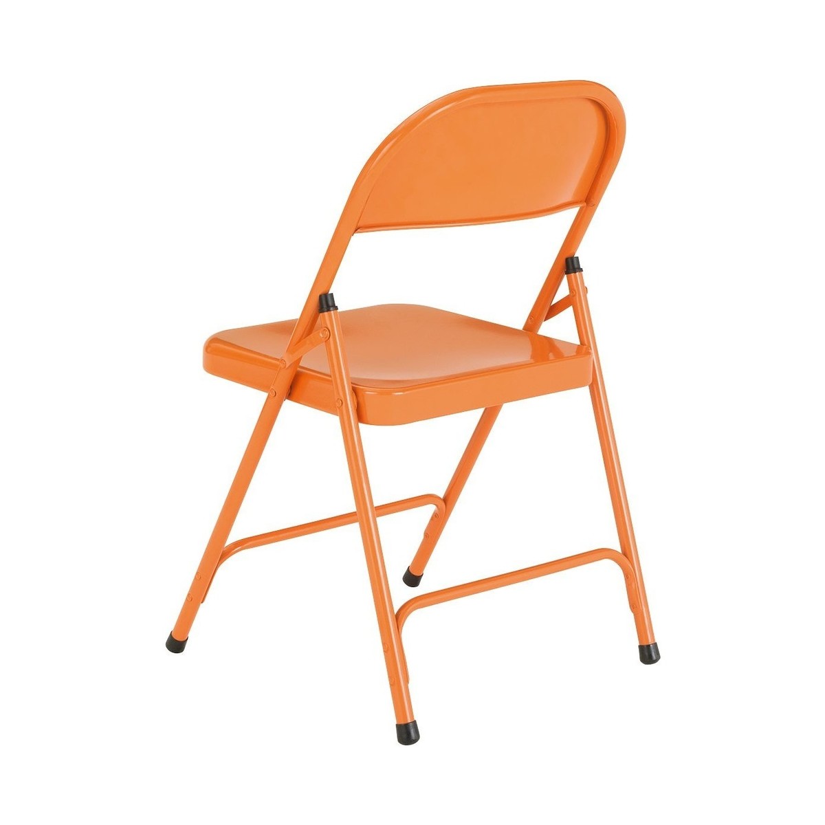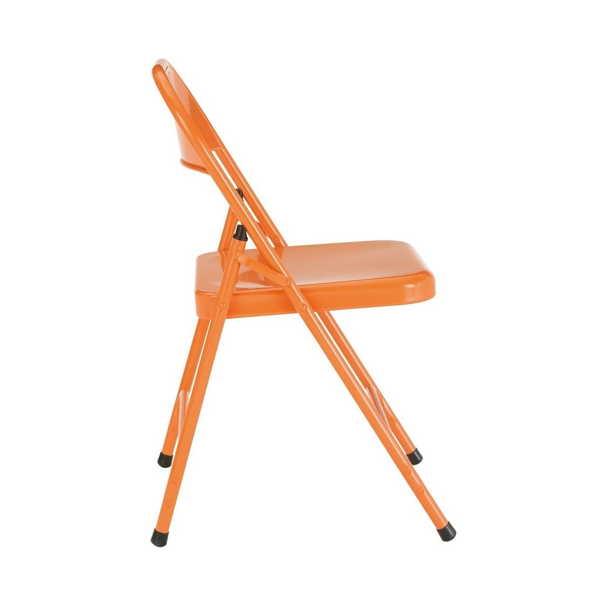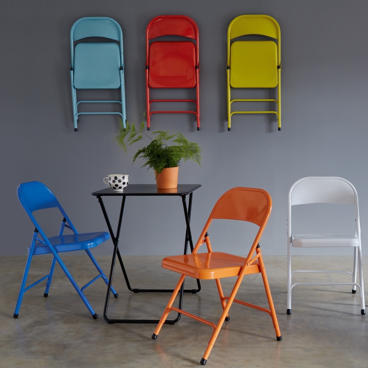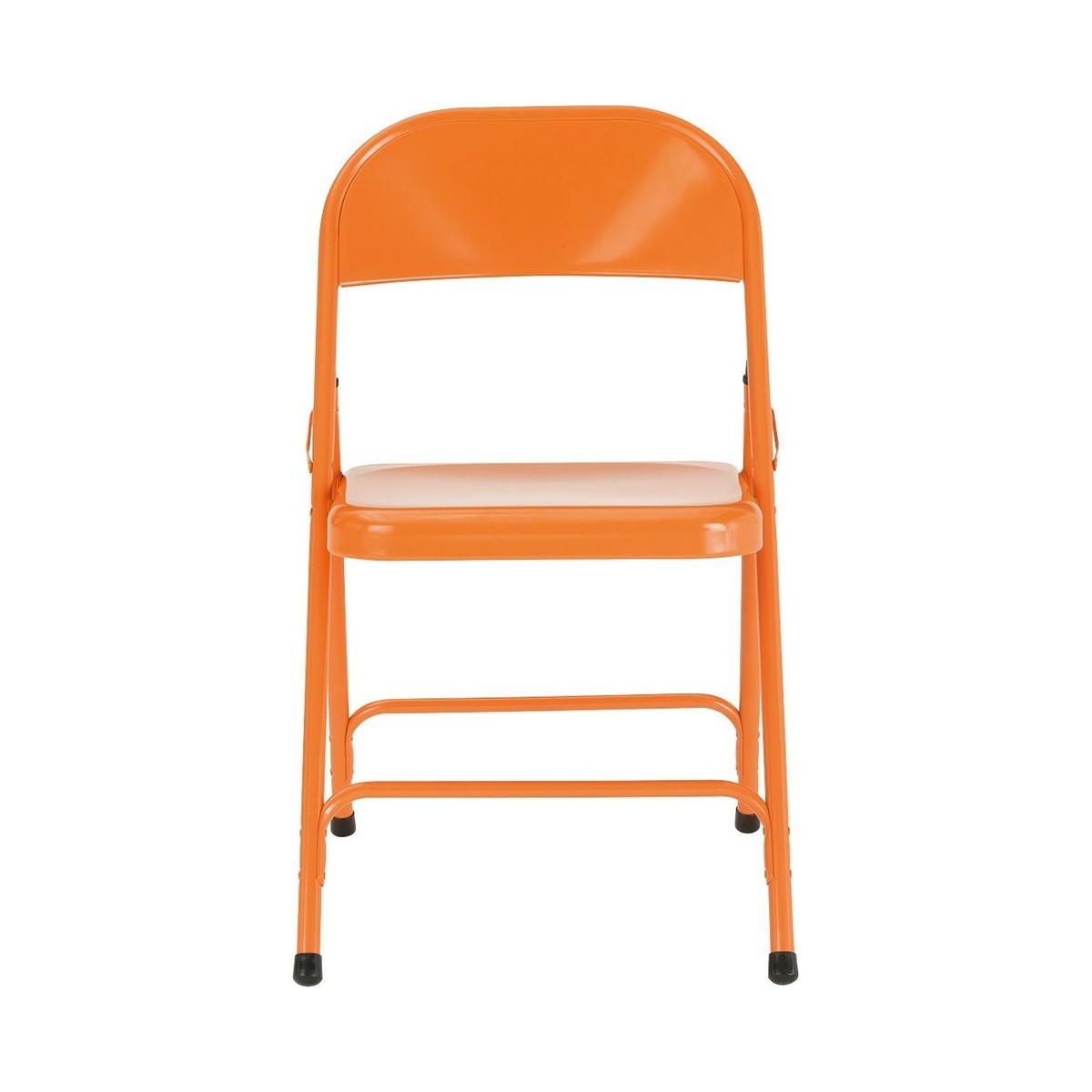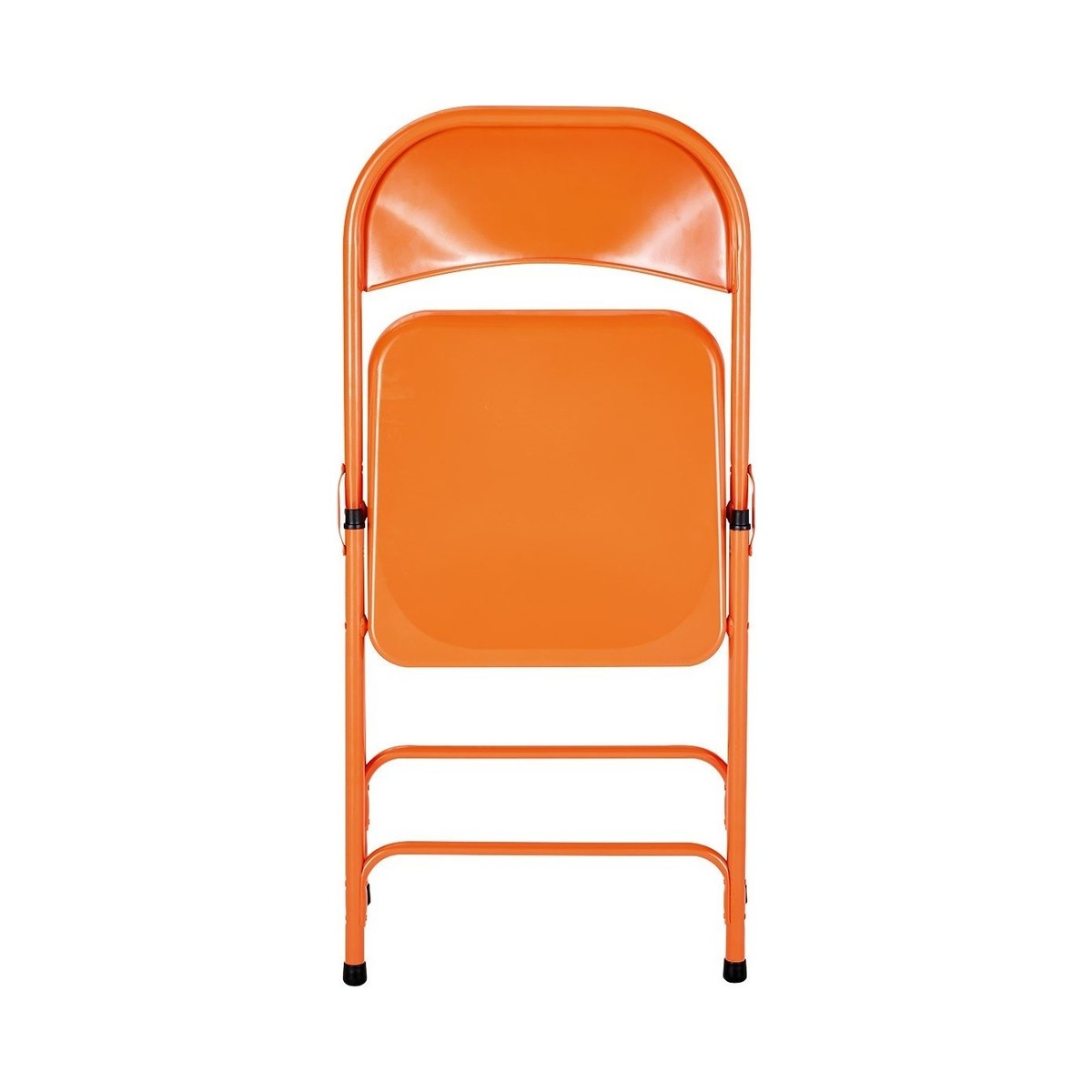 The Macadam orange metal folding chair is a versatile design in powder-coated steel and perfect for dining and occasional use.;The robust yet lightweight chair has a contoured back rest for additional comfort and folds flat for easy storage when not in use.;Macadam is available in a choice of fun, vibrant colours and look great when mix and matched.