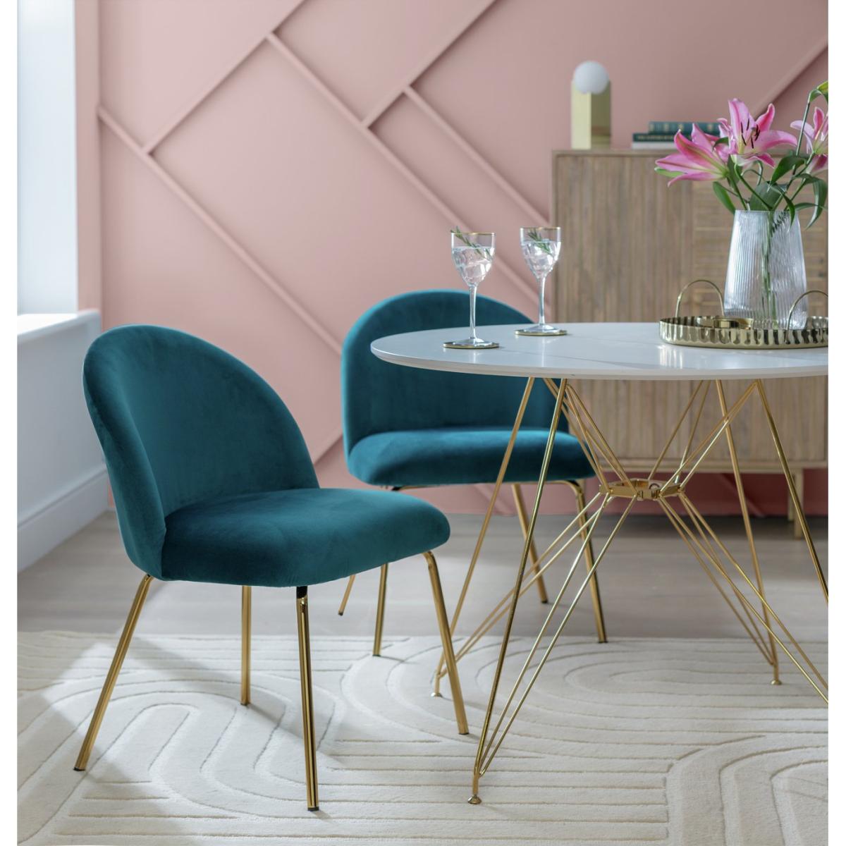 Sit in luxury. Eat in style. This Maddix chair duo with their soft seat pads, wrap around backs and robust steel frame are a diner's best friend. Designed to help you sit in comfort through dinner and beyond. And with no-scratch leg protectors, they'll look after your floor as much as your comfort. Make up a set of 6 or 8 to make an impression next time you are entertaining. Part of the Maddix collection. Chair: 2 chairs supplied. Size H77, W54.5, D60cm. Seat height 48cm. Steel frame with steel legs. Velvet seat pad. Self-assembly - 1 person recommended. Max user weight per chair 130kg. Individual chair weight 6.3kg. Wipe clean with a soft cloth. Package Dimensions: Chair package size: H63, W56, D58cm. General information: We are excited to be welcoming some of our favourite HOME products into the Habitat range. Your product may arrive in Habitat or HOME packaging. Manufacturer's 1 year guarantee.