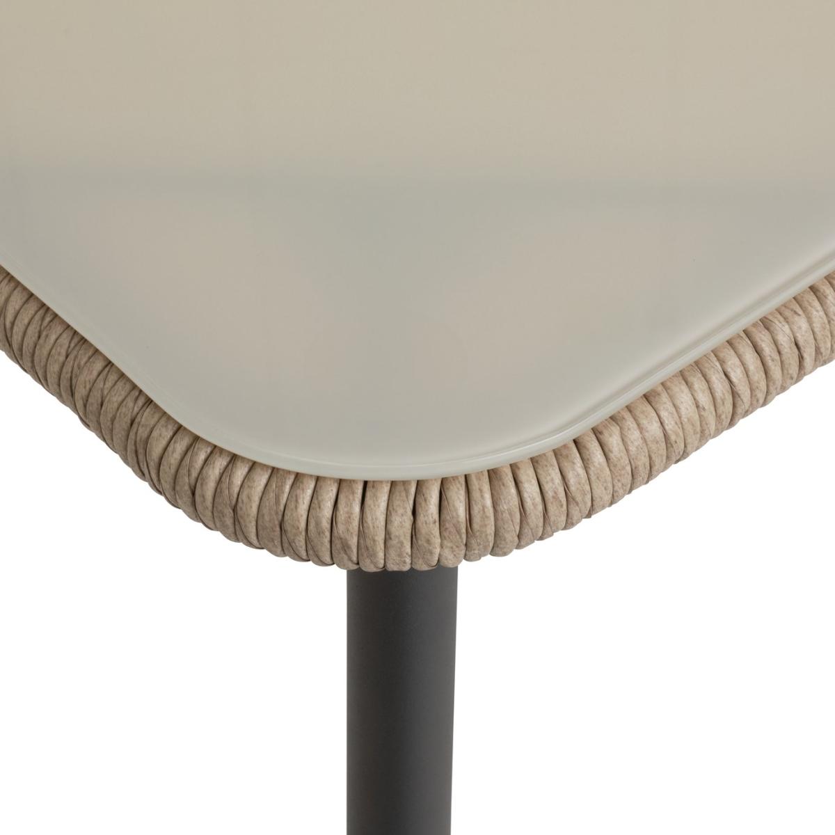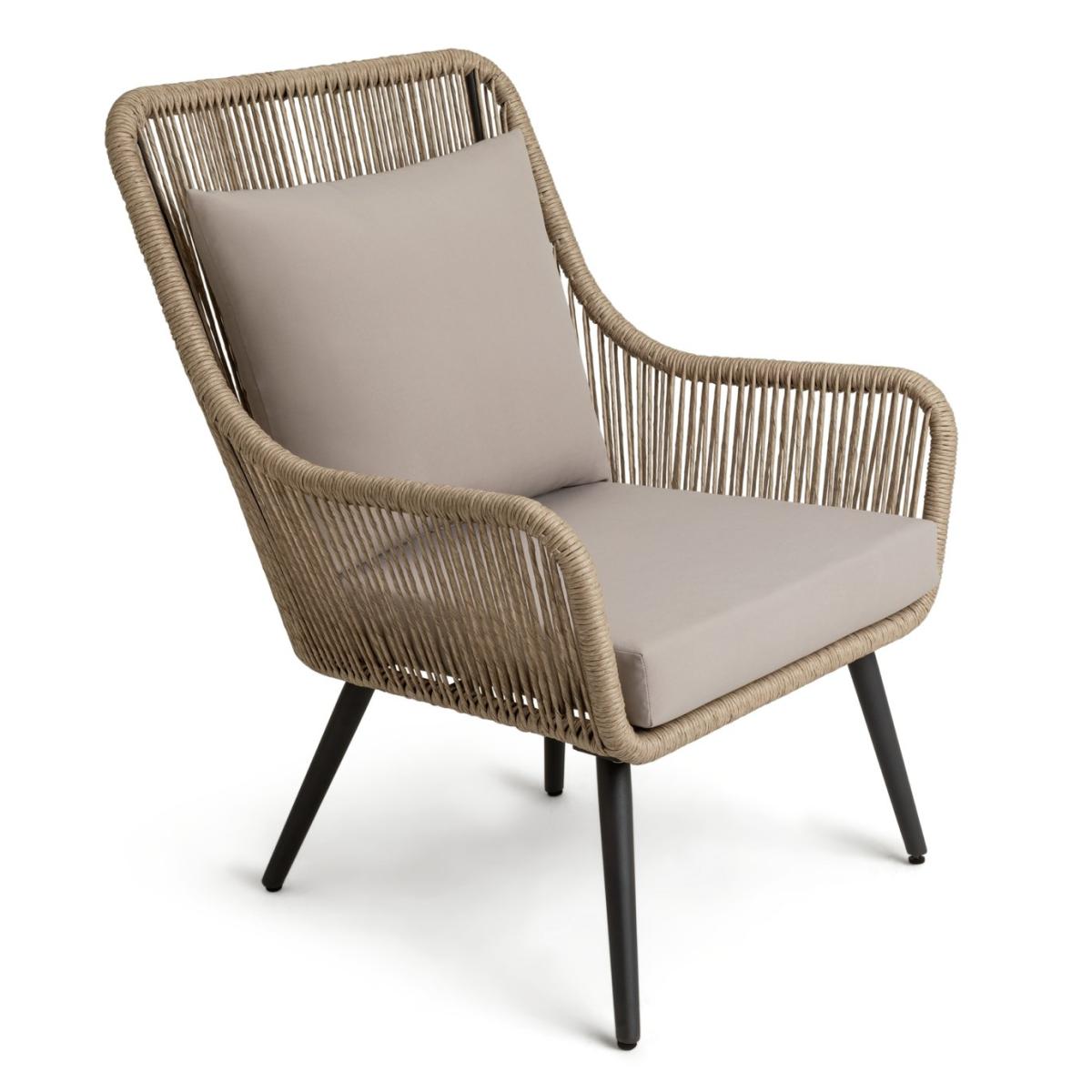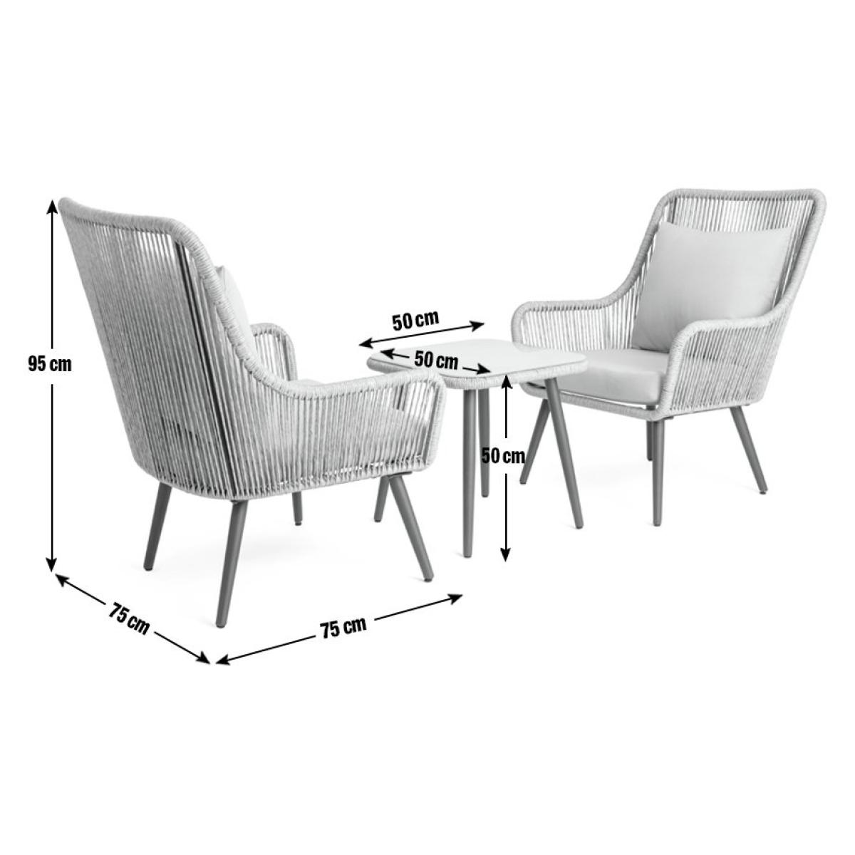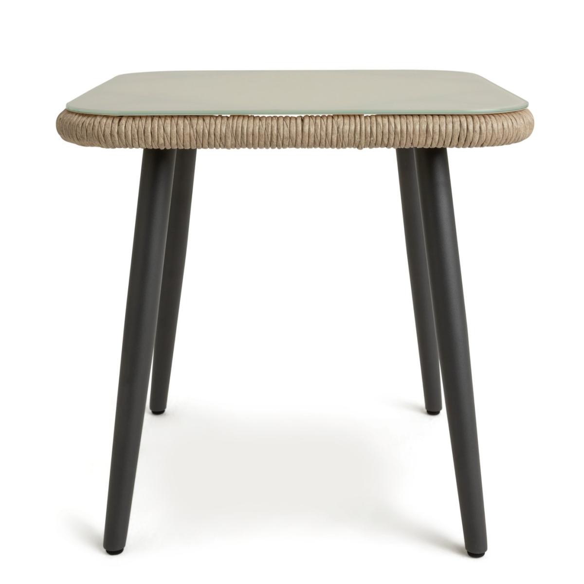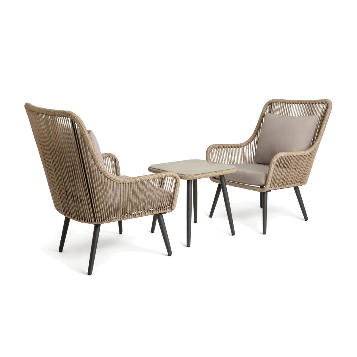Relaaax... Unwind on your patio or balcony with this comfy number. We're loving the handwoven rattan rope effect design on the 2 high back chairs and the ceramic glass top of the matching table. So smart. The 4 comfy cushions all have removable, washable covers to keep this bistro beauty looking top notch. Add some after dark atmosphere to your table for two. Take a look at our solar lighting collection and set the mood to romantic. Parasol base not included. Parasol not included. Includes 4 cushions. General features: Set seats 2 people. Set made from steel and rattan effect. Store inside when not in use. Cover or store inside in winter months to prolong life of the products. Total weight 24kg. Garden table features: Glass table top. Table size: H50, W50, L50cm. Removable legs for storage. Chair features: Chair seat and back made from steel. Size H95, W75, D77cm. Seat height 41cm. Seating area size W 59, D58cm. 110kg maximum user weight per chair. Cushion features: Polyester cushion and natural cushions. Removable covers. Remove cushions when not in use and store inside. Packaging information: Package 1 size H75, W78, D79cm. Package 1 weight 27.5kg. General Information: Minimal assembly - 2 people required. Manufacturer's 1 year guarantee.