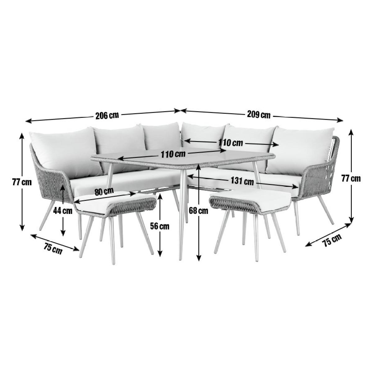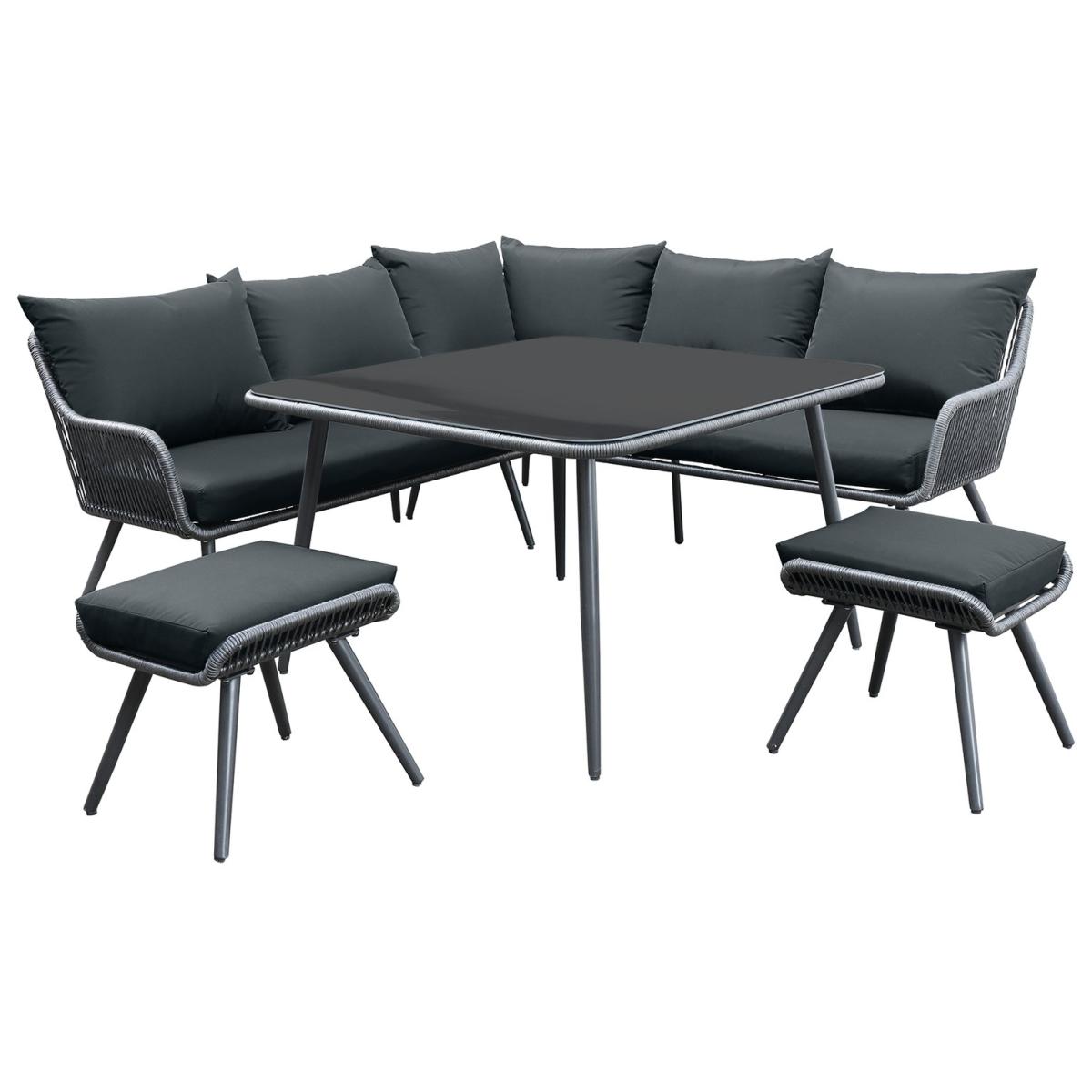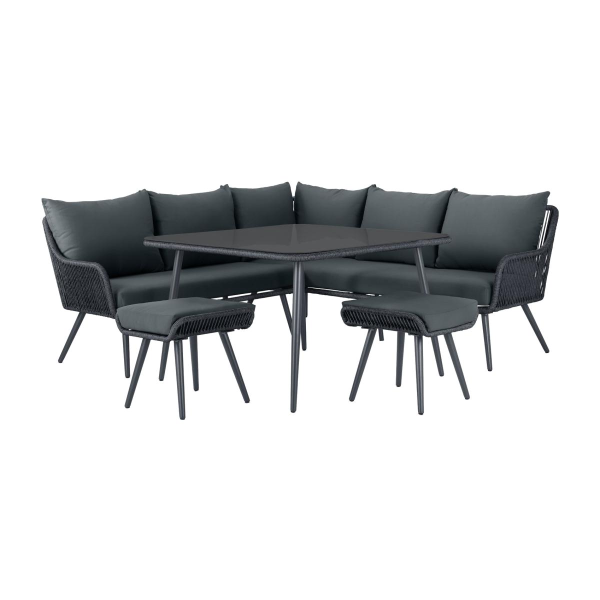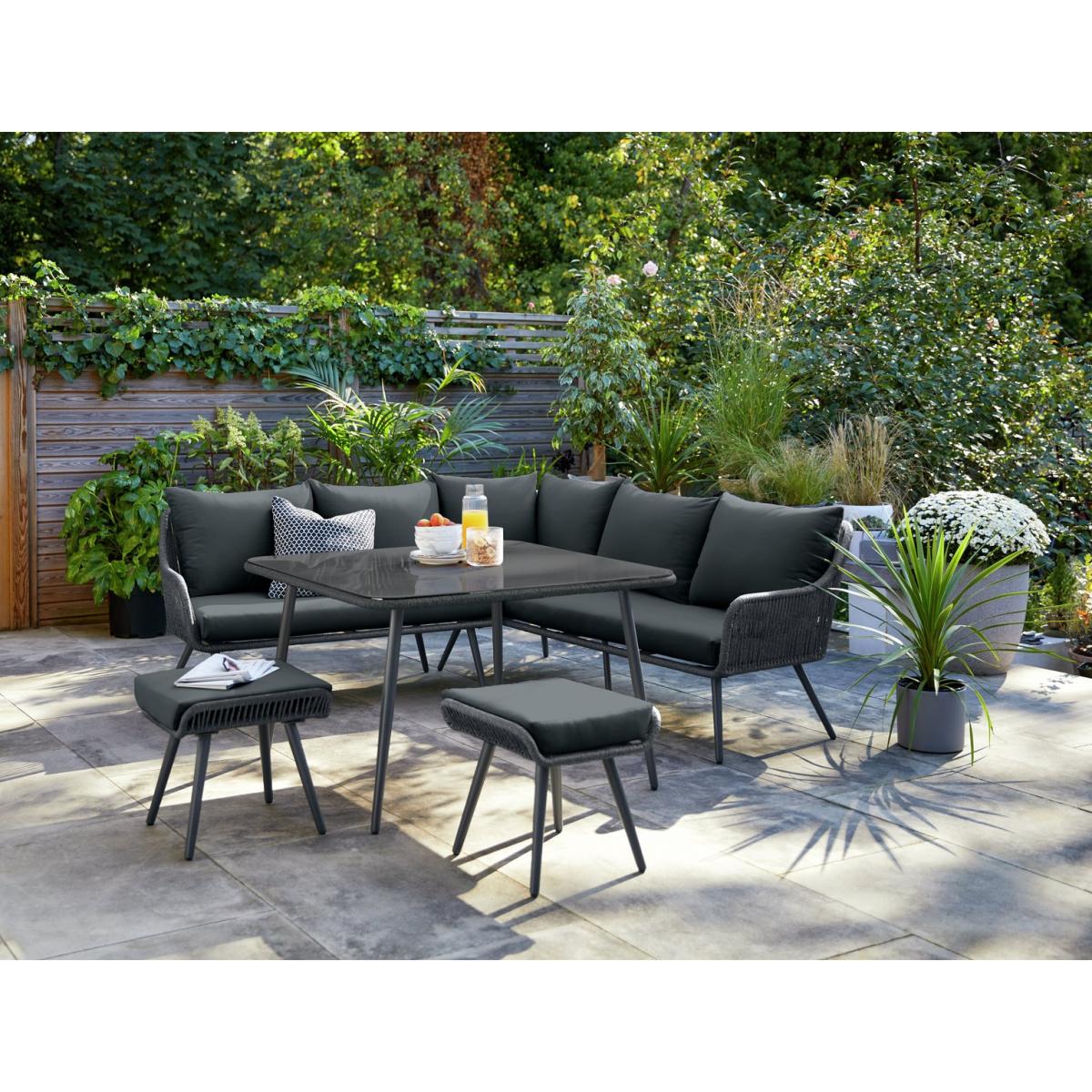 Get garden party ready with our 6-person dining set in jet black. Relax on the 6-seater corner sofa and pull up this pair of nifty stools. Lipped edges mean no slip-sliding around for seat pads. Serving up a feast? Gather round this smart, glass-topped table. Removable legs mean it's simple to store, too. Rattan-effect rope and steel frames make each piece strong, lightweight and easy to move about. The 10 cool grey cushions add to the comfort factor. So, grab a glass of Pimms and settle in. Summer, we're ready for you.