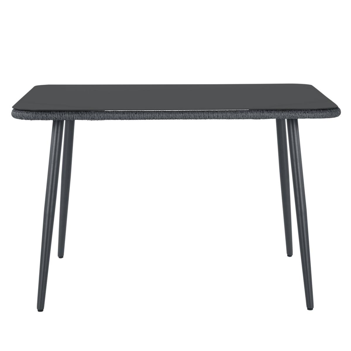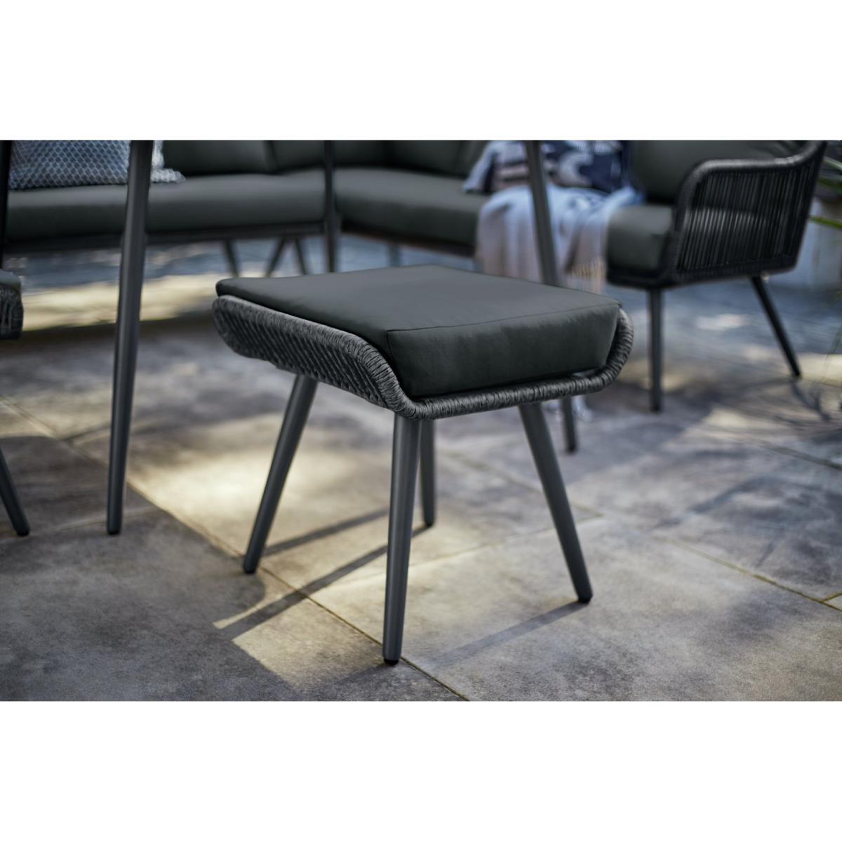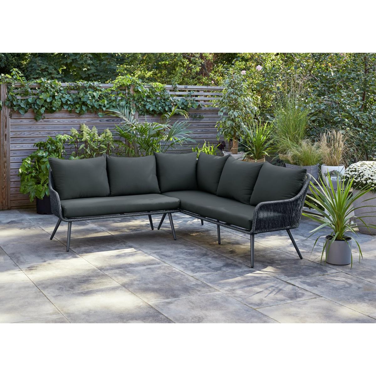 Get garden party ready with our 6-person dining set in jet black. Relax on the 6-seater corner sofa and pull up this pair of nifty stools. Lipped edges mean no slip-sliding around for seat pads. Serving up a feast? Gather round this smart, glass-topped table. Removable legs mean it's simple to store, too. Rattan-effect rope and steel frames make each piece strong, lightweight and easy to move about. The 10 cool grey cushions add to the comfort factor. So, grab a glass of Pimms and settle in. Summer, we're ready for you.