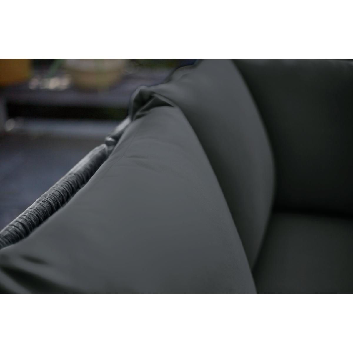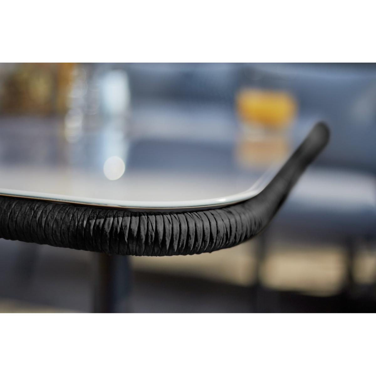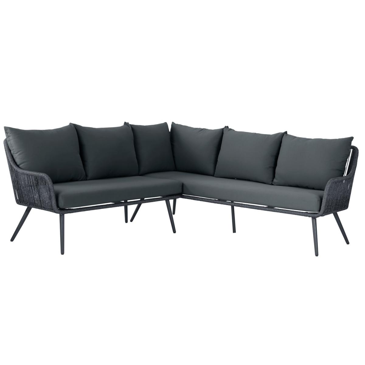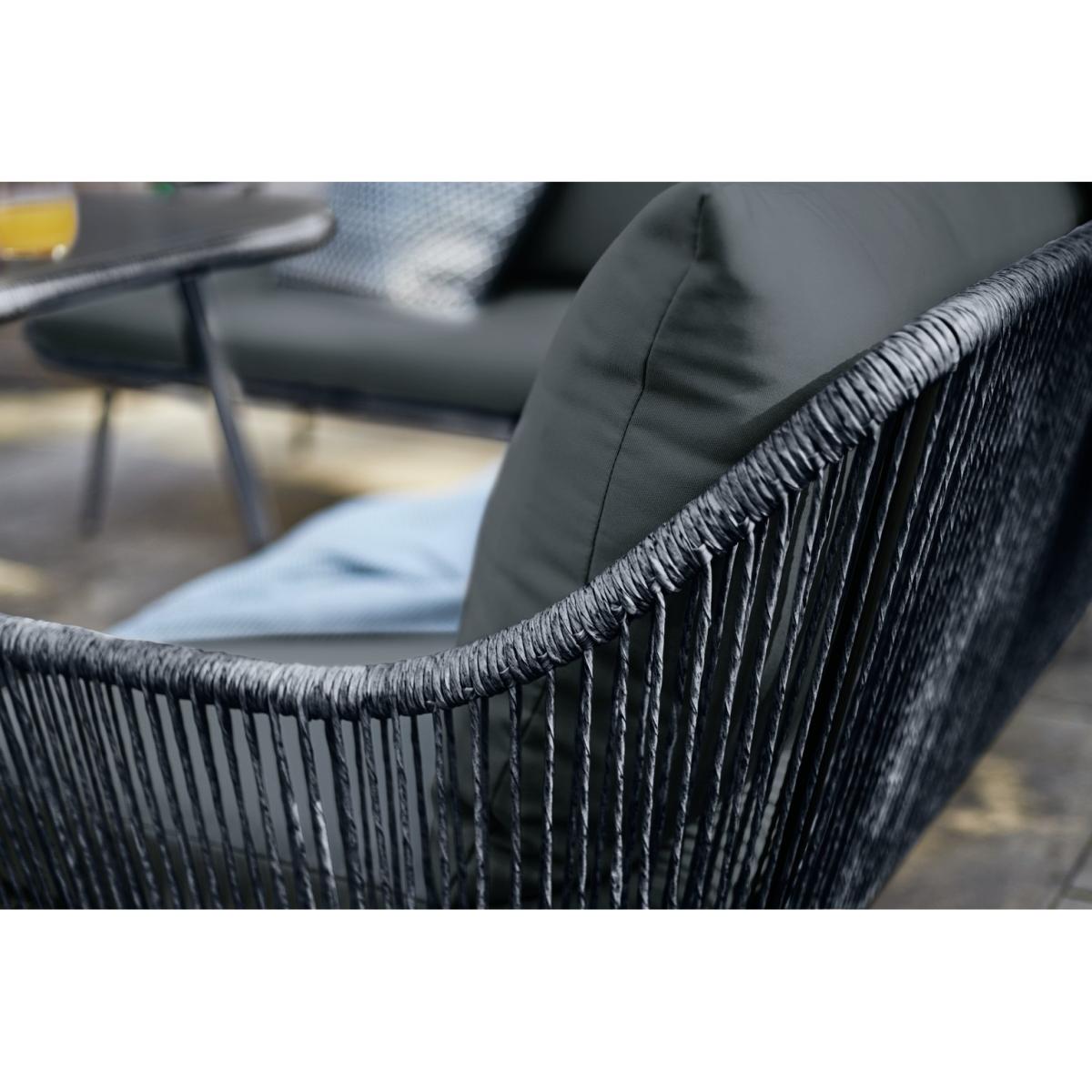 Get garden party ready with our 6-person dining set in jet black. Relax on the 6-seater corner sofa and pull up this pair of nifty stools. Lipped edges mean no slip-sliding around for seat pads. Serving up a feast? Gather round this smart, glass-topped table. Removable legs mean it's simple to store, too. Rattan-effect rope and steel frames make each piece strong, lightweight and easy to move about. The 10 cool grey cushions add to the comfort factor. So, grab a glass of Pimms and settle in. Summer, we're ready for you.