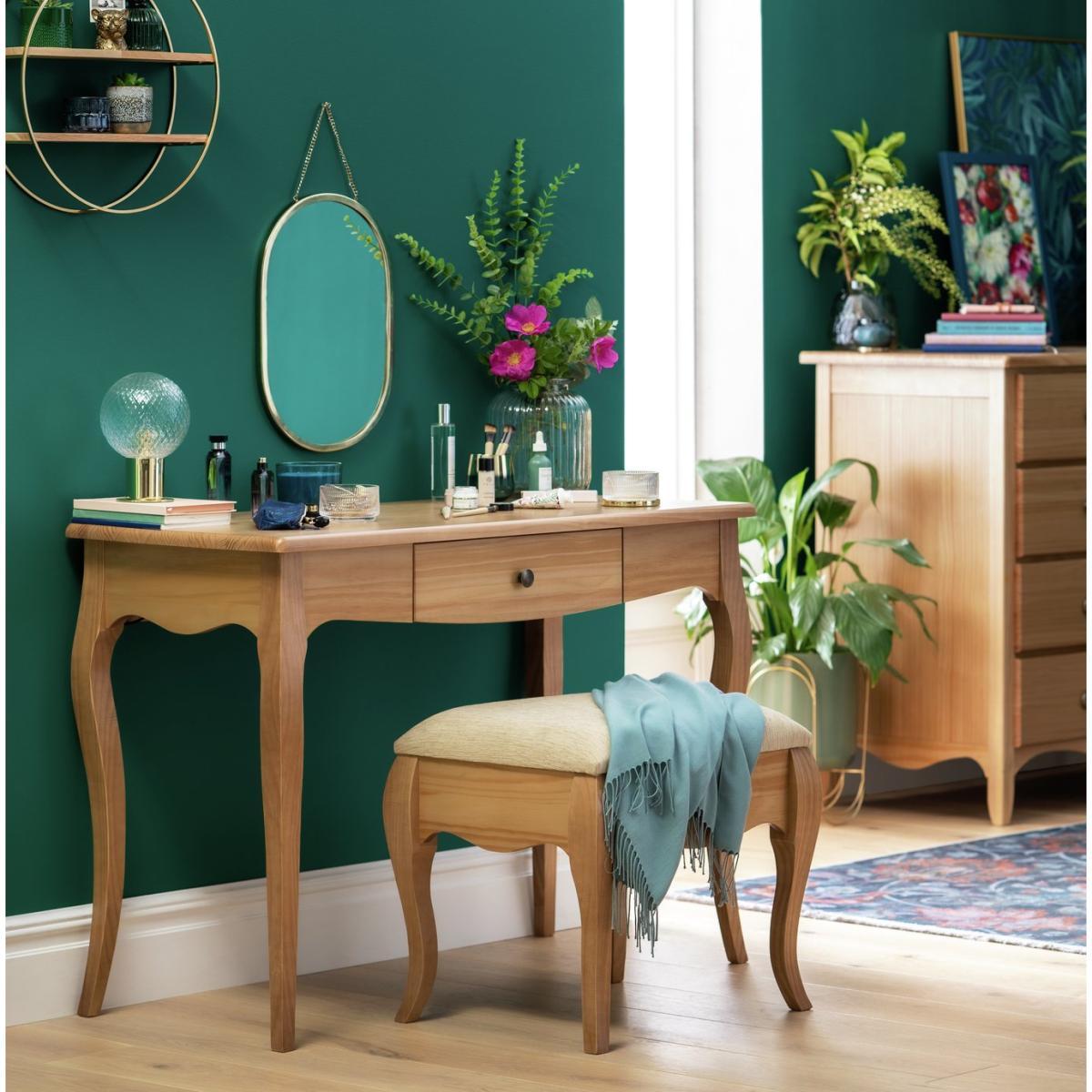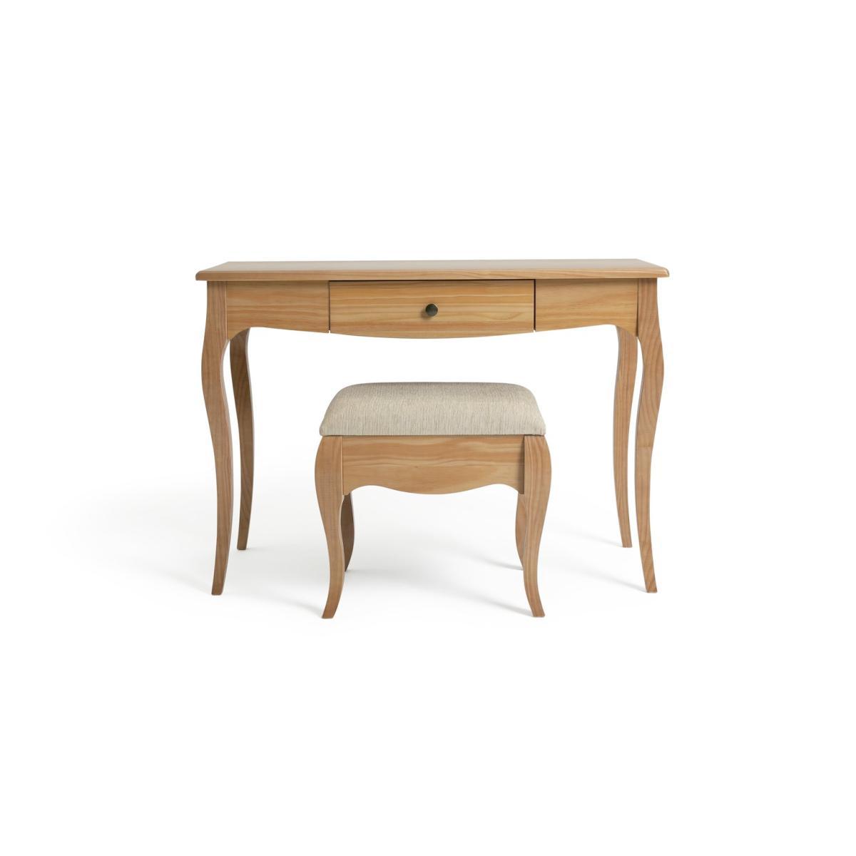 Pamper yourself with Margot. The smooth oak finish and curved detailing makes this wooden dresser the perfect place to get ready in style. And with a soft cushion in natural fabric, the matching large stool is chic and super comfortable. Pop make up, perfumes, or jewellery in the handy drawer. Now your bedroom is clutter-free. Why not dress up Margot with a vase of your favourite flowers? Fabulous. Inspired by the stylish wood look? Take a peek at the rest of the Margot collection, including our chest of drawers and bedside tables. Part of the Margot collection. Made from MDF. Made from FSC certified timber. 1 drawer with metal runners. Metal handles. Additional handles not included. Stool included. Stool made from fabric. Fully assembled - 2 people recommended (includes wall fixings). If this product is over 60cm high it must be securely attached to the wall to prevent overturning. Dimensions: Size H78.4, W110, D50cm. Height without mirror78.4cm. Under table chair space H61.8, W99.8cm. Internal drawer H8.8, W33.4, D43cm. Stool size H49, W53, D45.6cm. Weight: 24kg. Package Dimensions: Package 1 dimensions: H39, W124.5, D55.5cm. Package 1 weight: 26kg. General Information:We are excited to be welcoming some of our favourite HOME products into the Habitat range. Your product may arrive in Habitat or HOME packaging. Manufacturer's 1 year guarantee.