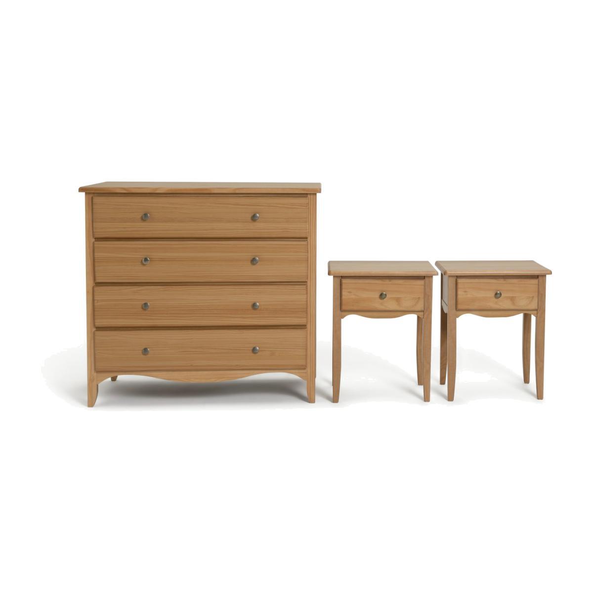 Style and storage, all in one. Our Margot furniture set brings a touch of the country to your bedroom with its a smooth pine finish and curved detailing. Featuring 2 wooden bedside tables and a 4-drawer chest. You'll have plenty of space to keep your clothes and bedside essentials neat and tidy. And you can pop plants and picture frames on top of the chest of drawers too.