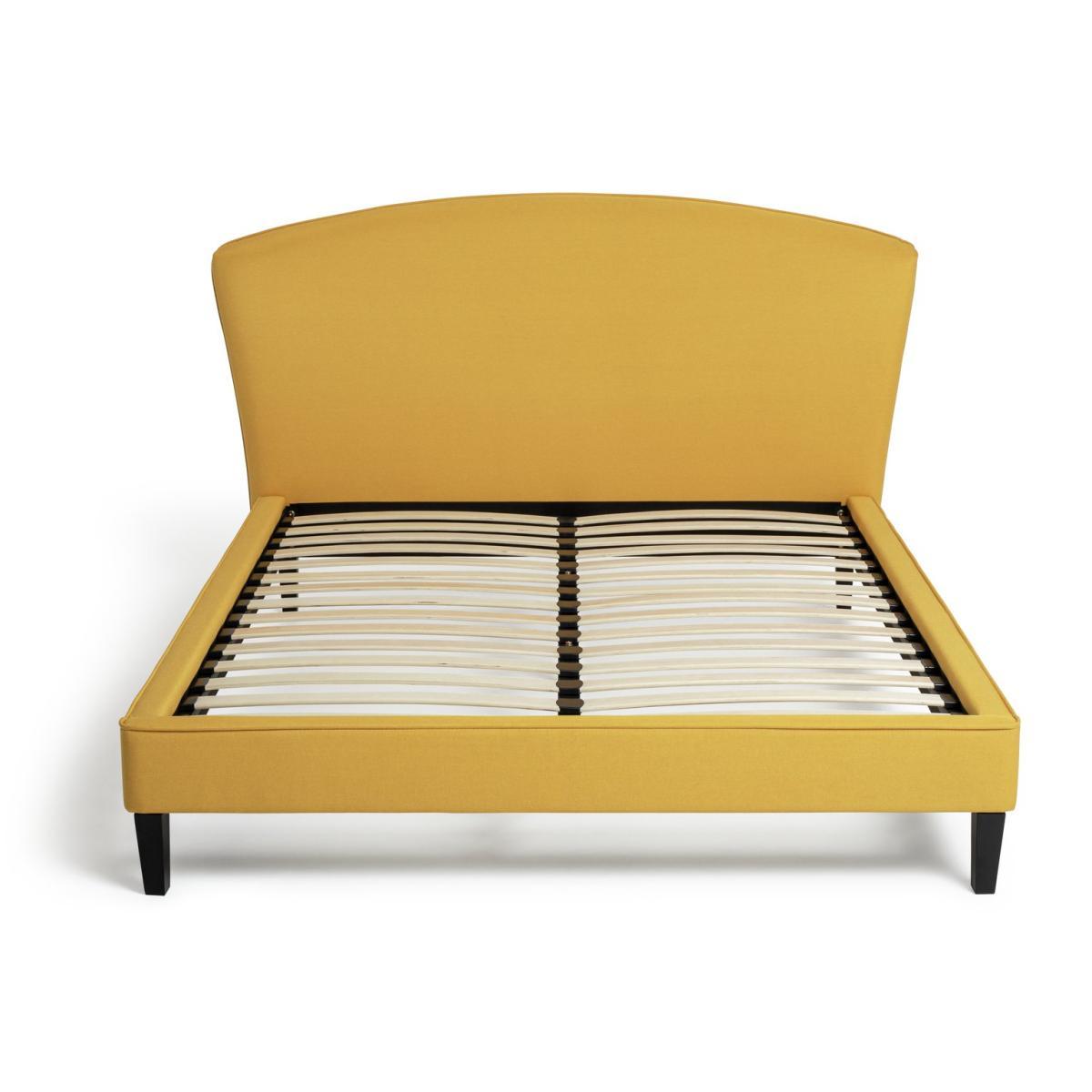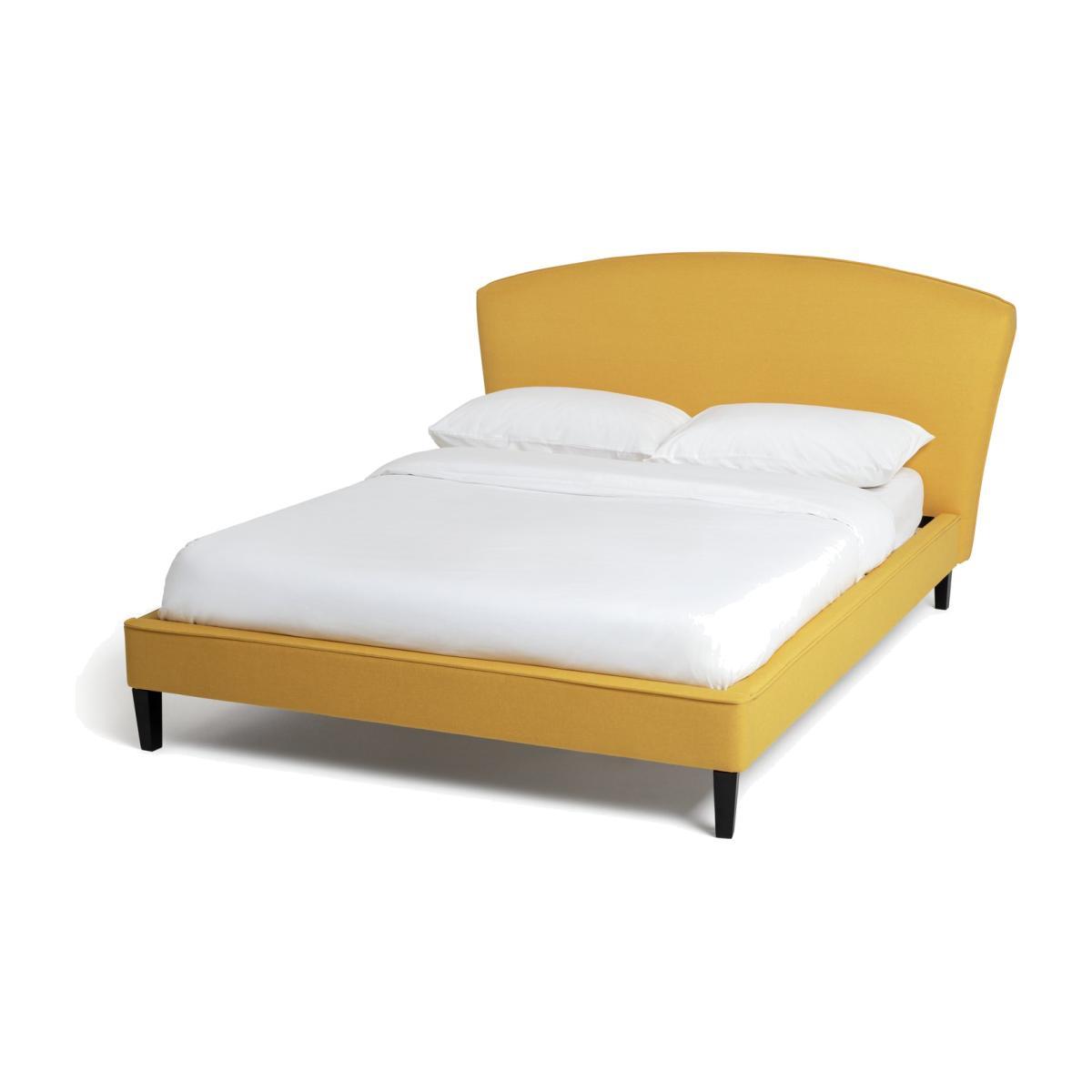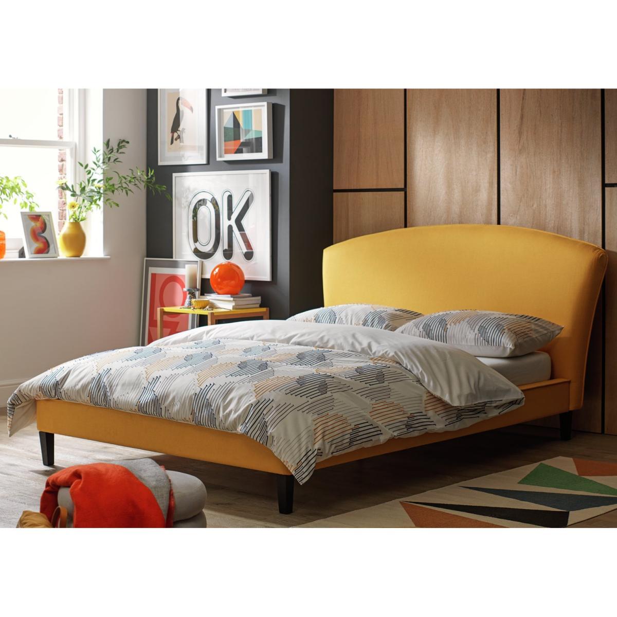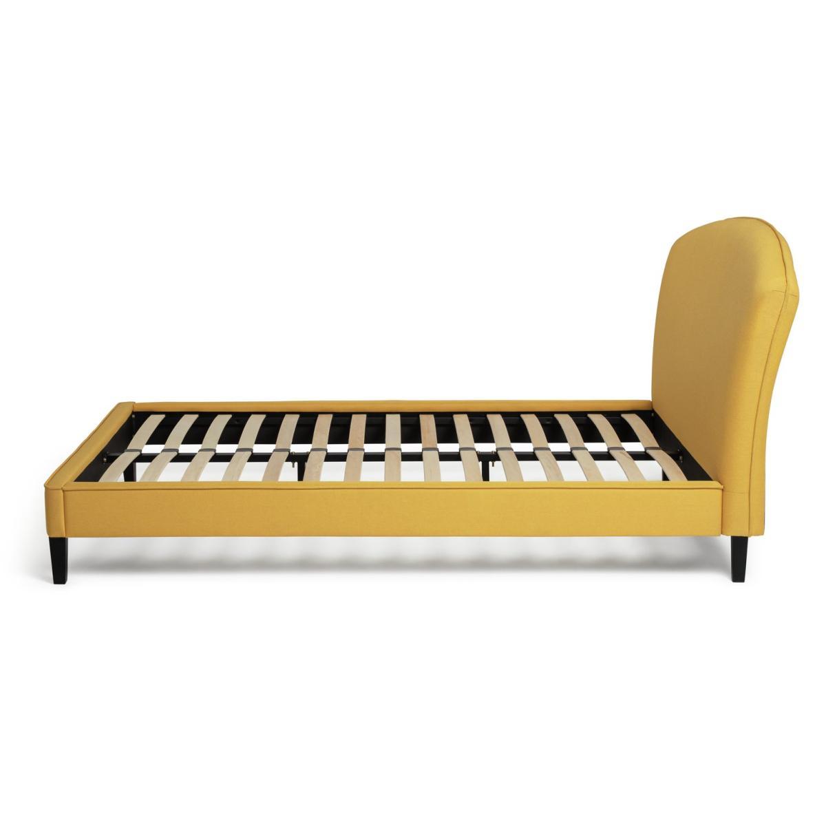 Good morning, sunshine. Bring a fresh feel to your bedroom with our Marlon fabric bed frame. Upholstered in mustard yellow with a curvaceous headboard, it's soft to the touch and colourfully on trend. Black tapered solid wood legs lend a little drama, while sprung wooden slats provide a strong foundation for your mattress. Minimalist or vibrant decor? This bold bed frame is comfortable with either.