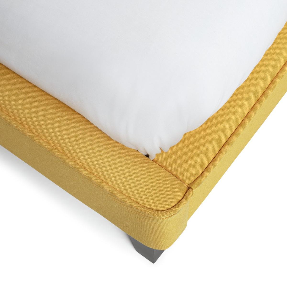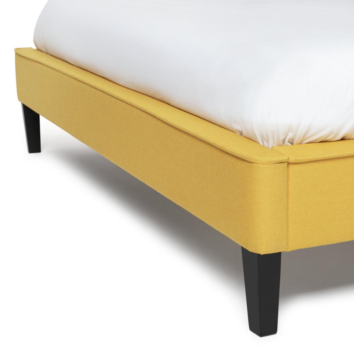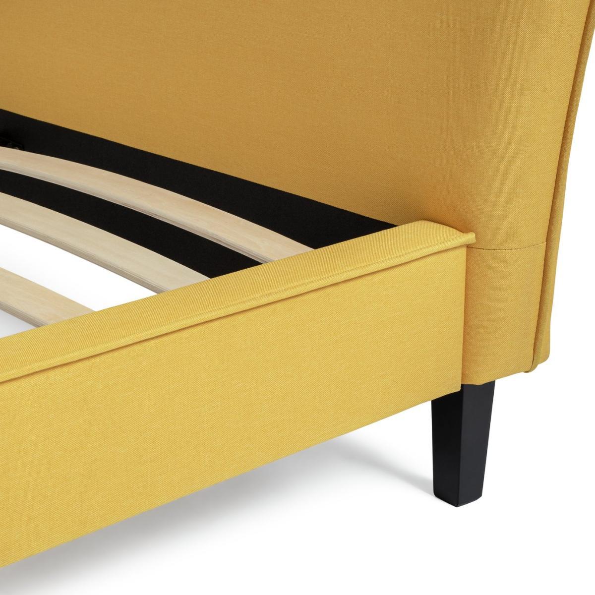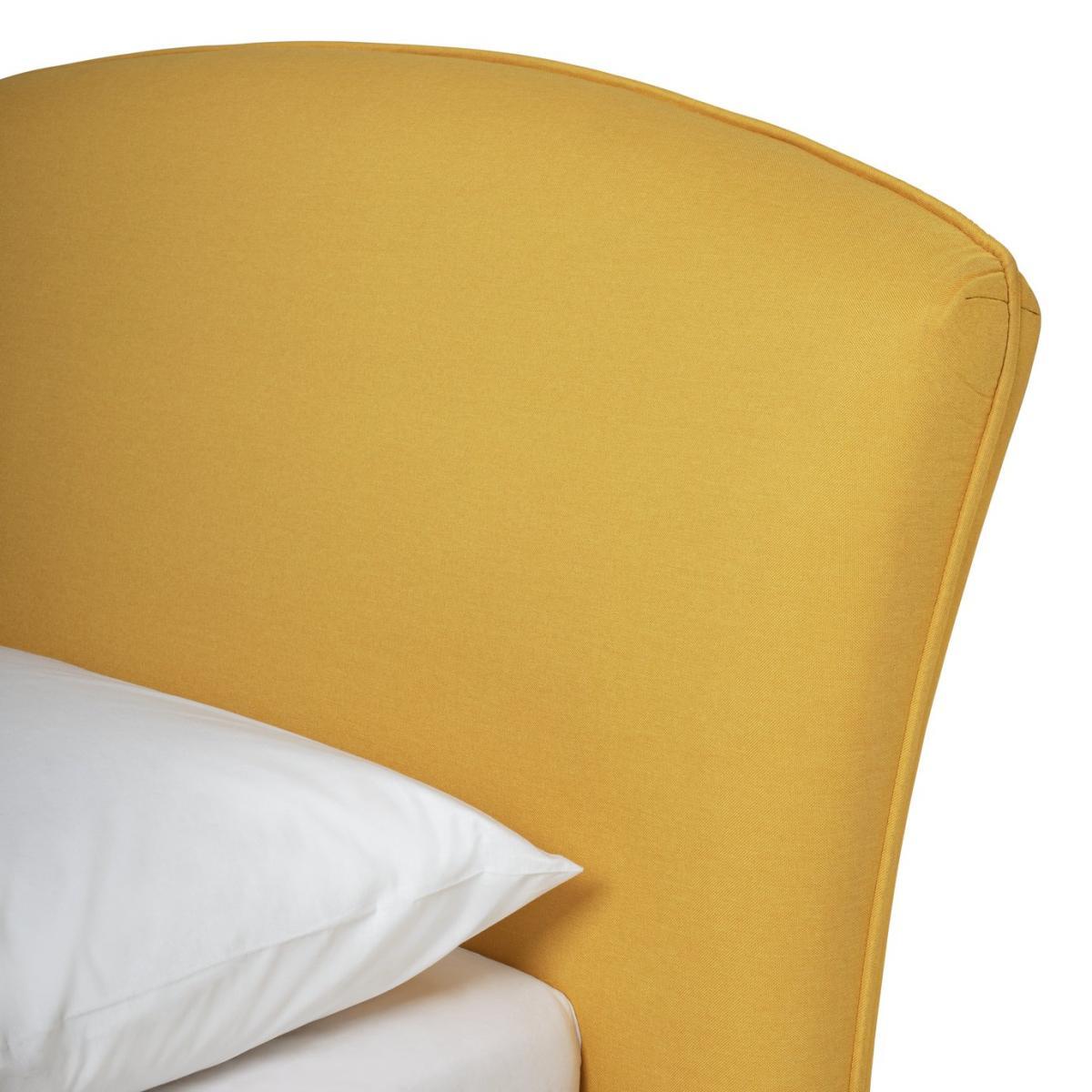 Good morning, sunshine. Bring a fresh feel to your bedroom with our Marlon fabric bed frame. Upholstered in mustard yellow with a curvaceous headboard, it's soft to the touch and colourfully on trend. Black tapered solid wood legs lend a little drama, while sprung wooden slats provide a strong foundation for your mattress. Minimalist or vibrant decor? This bold bed frame is comfortable with either.