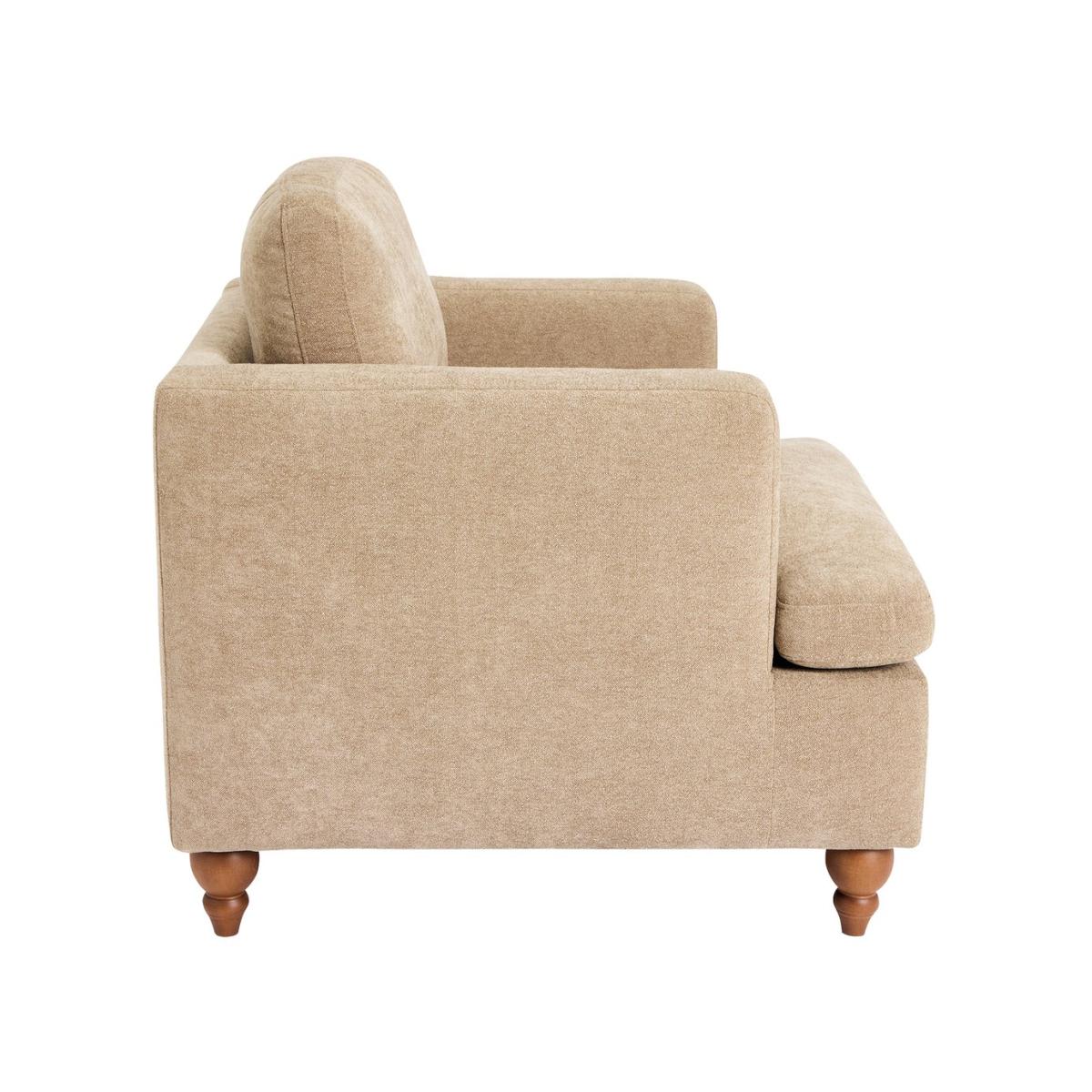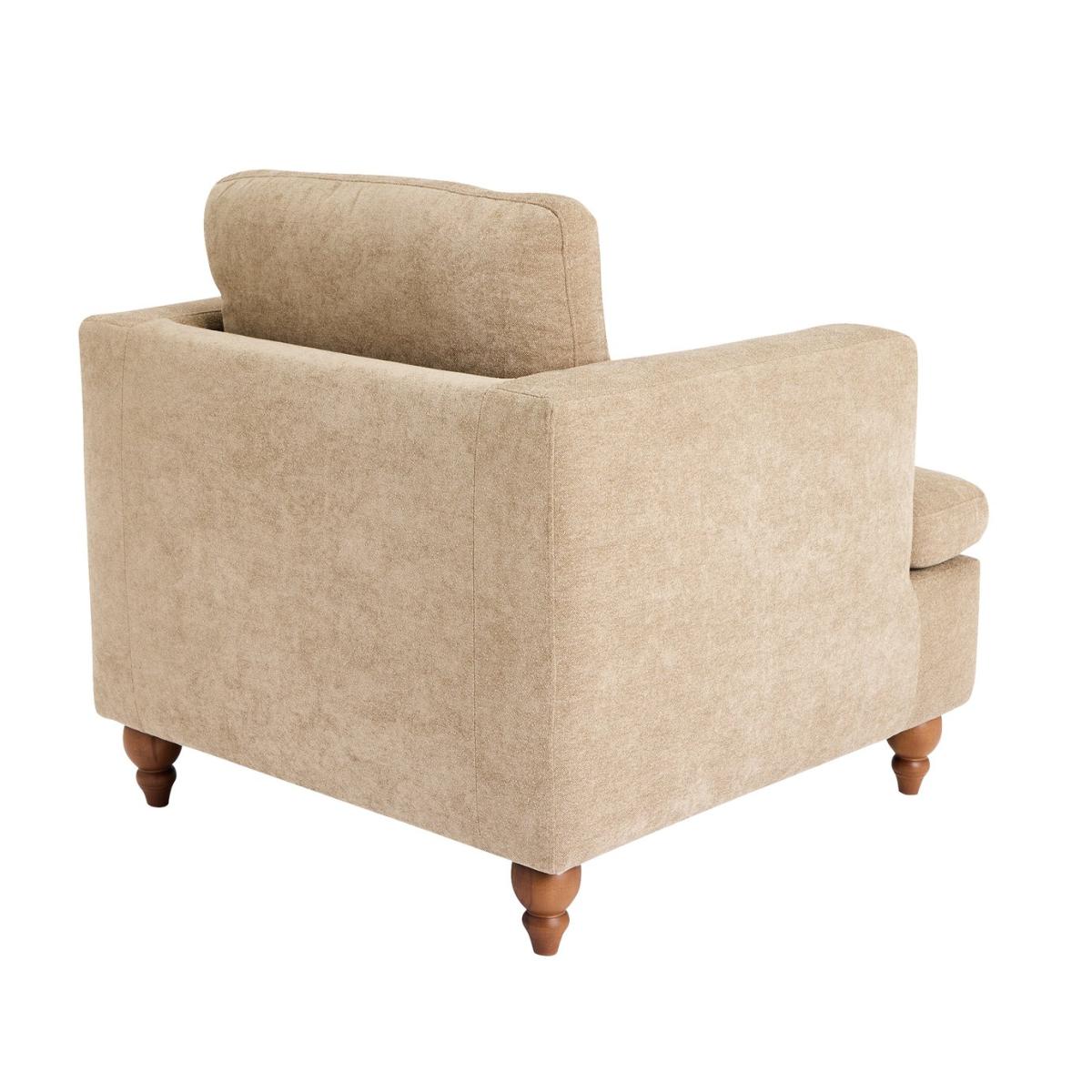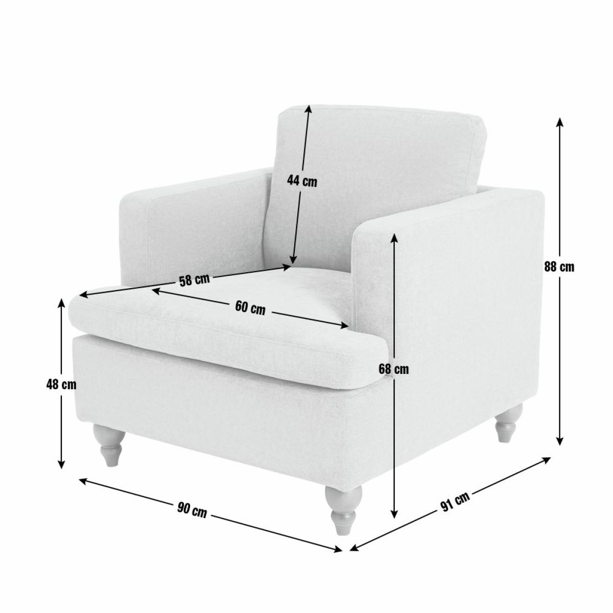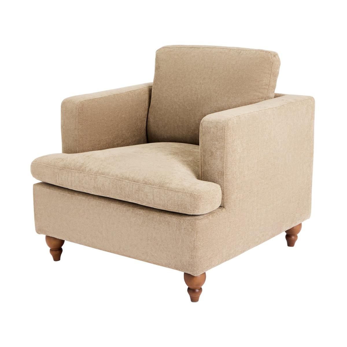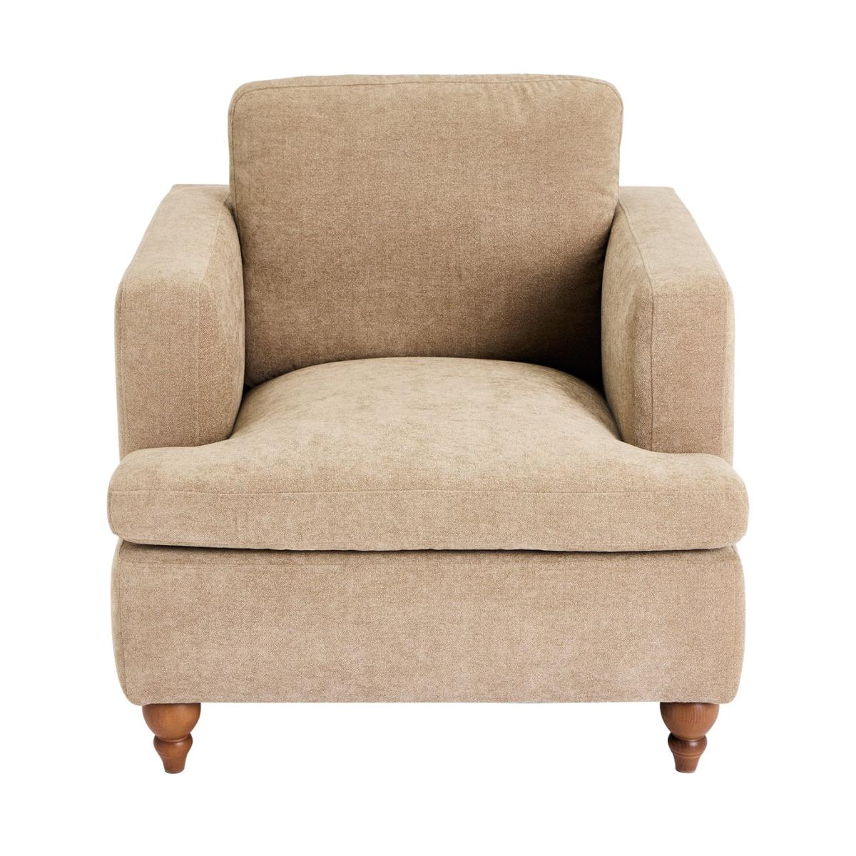 Sink into modern mink. This classically contemporary armchair has oodles of style and comfort. The clean linear design blends beautifully with the traditional look of the turned wooden legs. The foam and fibre wrapped seat and foam filled cushion are made for relaxing. Upholstered in a mink coloured fabric, this is a standout chair with settle in softness. Part of the Matilda collection. Material: Made from 100% polyester. Wooden feet. Removable seat with foam fibre wrap filling. Removable cushion(s) with fibre filling. Dimensions: Size H88, W90, D91cm. Floor to seat height: 48cm. Depth of seat: 58cm. Height of seat back: 44cm. Width of seating area between arms: 60cm. Height of arm rest: 68cm. Weight: 26kg. Packaged dimensions: Package size H58, W92, D93cm. General information: Professional clean only. Plump cushions regularly to maintain shape. Minimal assembly - just add feet. Maximum individual user weight 110kg. Manufacturer's 10 year guarantee.