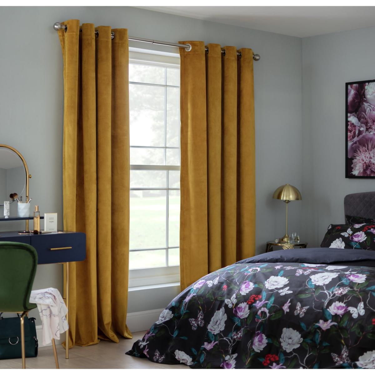 Dressed to impress. Opulent and sophisticated, these vibrant curtains will add a sense of luxury to your lounge or bedroom. We're loving their modern velvet matte finish and generous drape. The dimout ensures privacy and filters out unwanted light. Very mid- century. They're super easy to fit with eyelet headers that slide straight onto a pole. Hang these handsome curtains and set the stage for a dramatic room refresh. Bravo. Easy to hang in fabulous folds with a modern eyelet heading. Plus in beautiful polyester velvet. Velvet is one of this season's Insta-favourites. Our dimout fabric contains a special yarn woven into the cloth to help reduce light penetration, creating a shaded atmosphere in any environment. Mustard Plain Velvet Design. Silver Stainless Steel Eyelets. Features Made from 100% polyester. Unlined. Dimensions Size 117cm (46 inches) wide by 183cm (72 inches) drop. Dimensions provided include header tape. Width refers to one curtain panel before hanging. Eyelet diameter: 4cm. General information Contains one pair of curtains. Suitable for curtain poles. Curtain pole not included. Professional clean only. General Information: We are excited to be welcoming some of our favourite HOME products into the Habitat range. Your product may arrive in Habitat or HOME packaging.