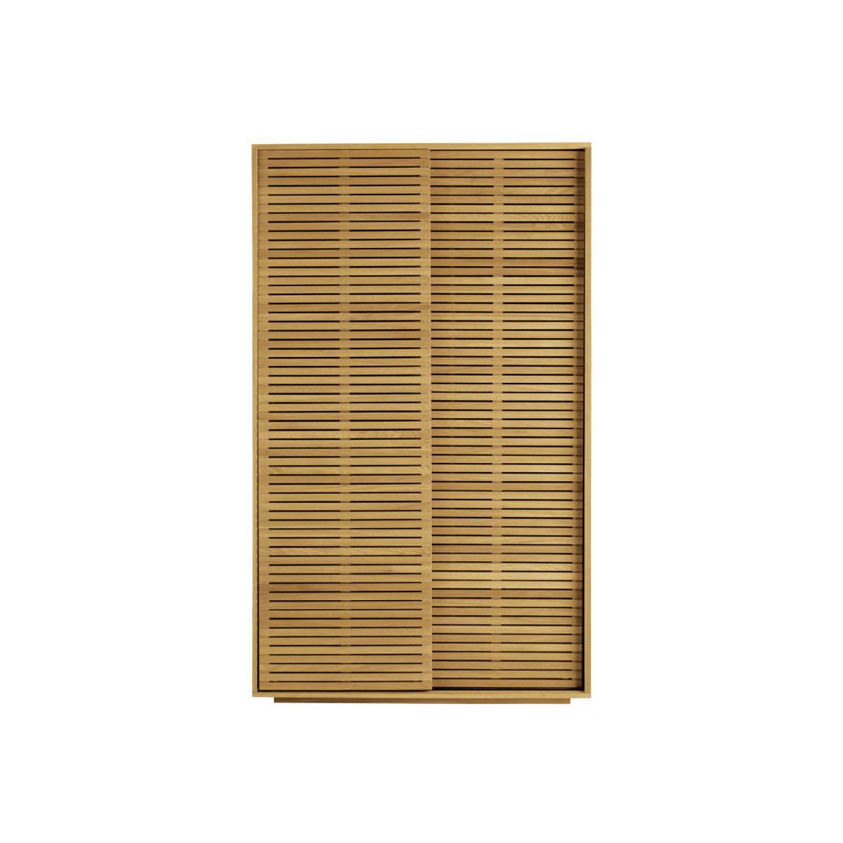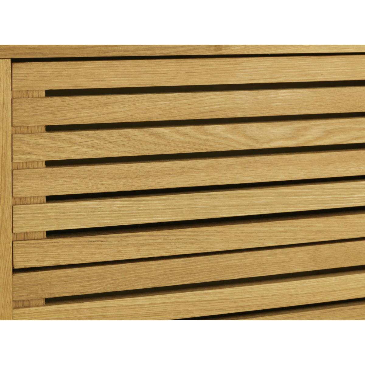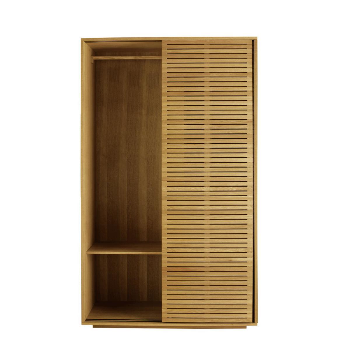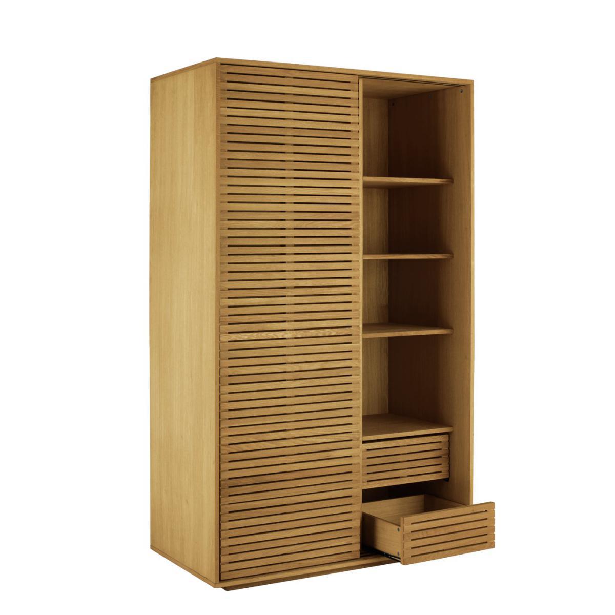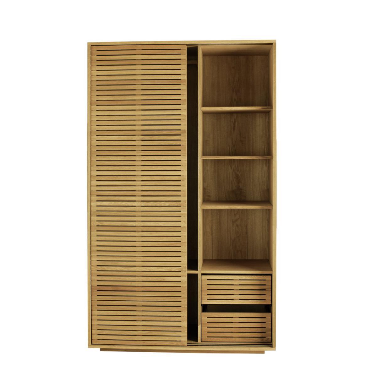 Crafted from beautiful, solid durable oak and oak veneer, this striking Max oak 2 door sliding wardrobe will effortlessly add character to your room and sits on a hidden plinth, giving it a light appearance. Behind the 2 slatted sliding doors, the wardrobe has 1 hanging rail and 1 fixed shelf in the left compartment and 3 adjustable shelves and 2 drawers in the right compartment.