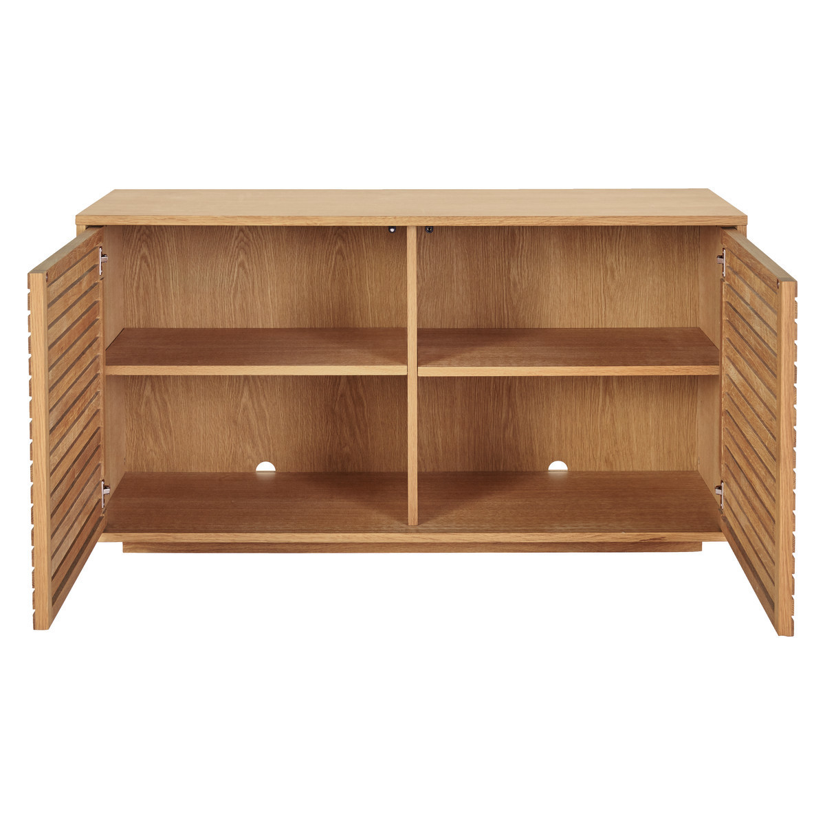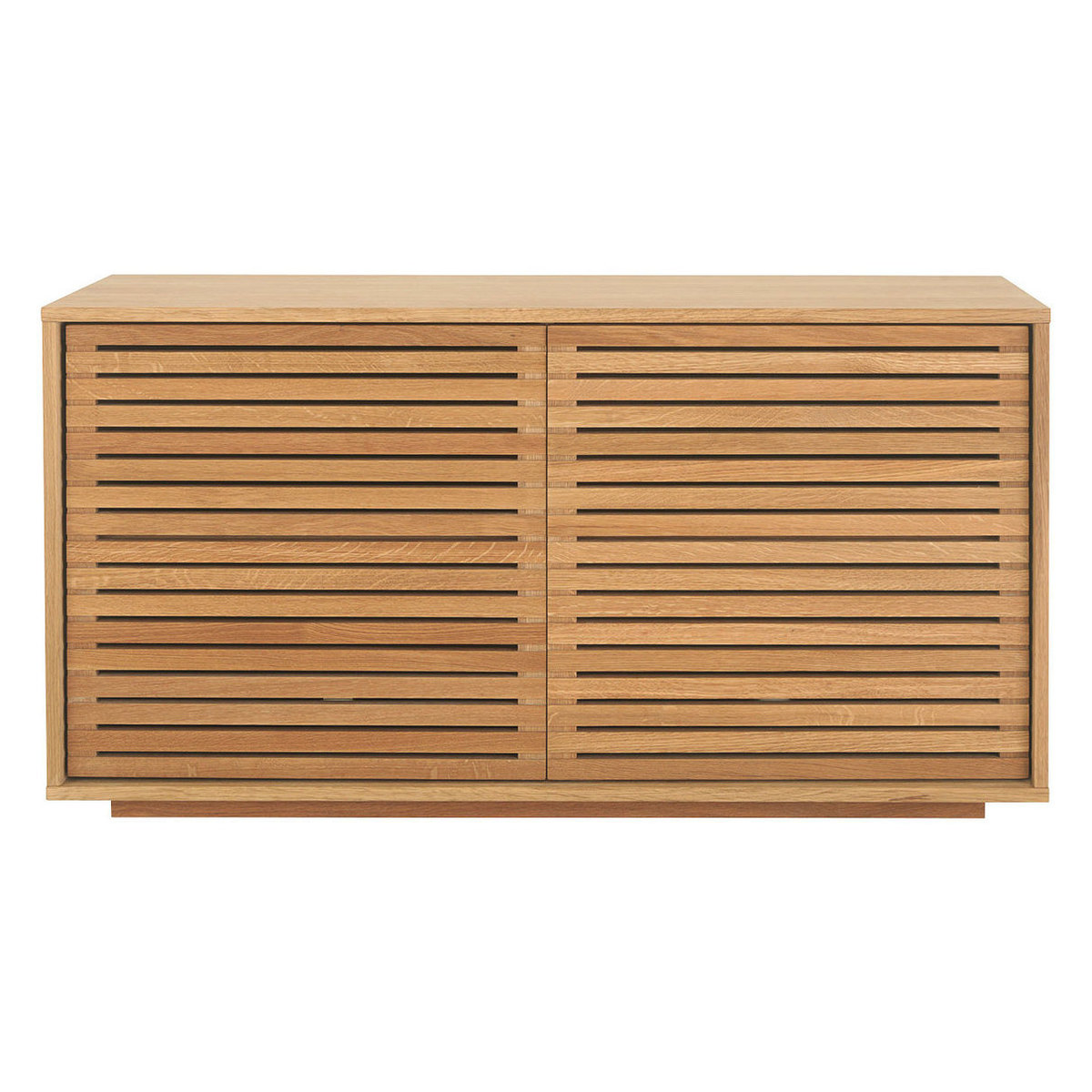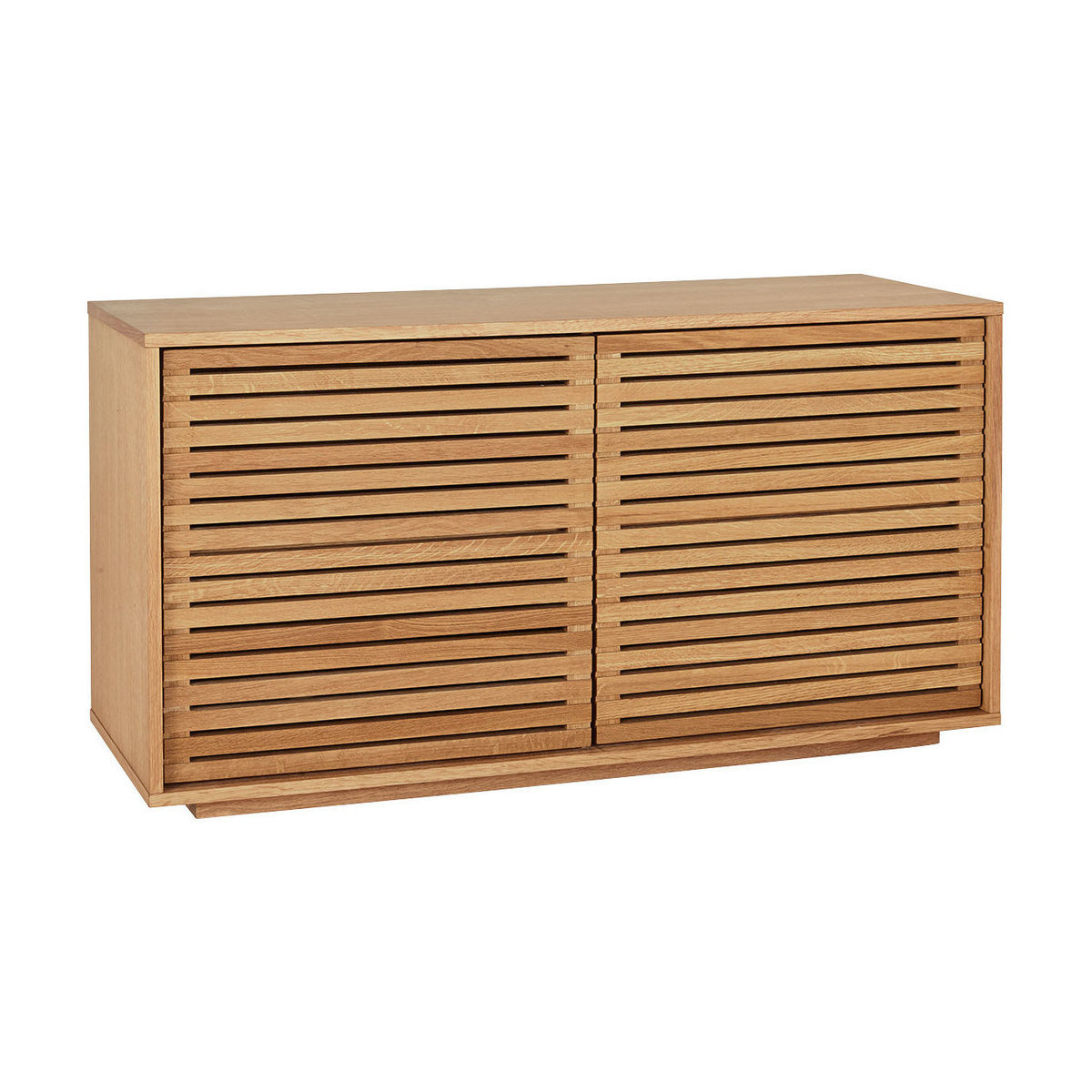 Made from oak and oak veneer, the sideboard has a warm, oiled finish and its combination of slatted doors and hidden plinth give the design a light appearance.