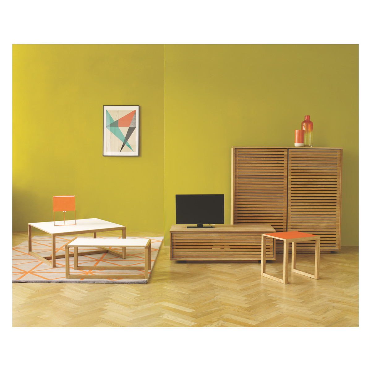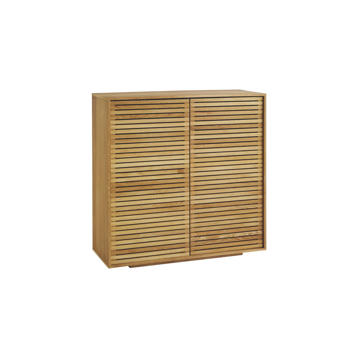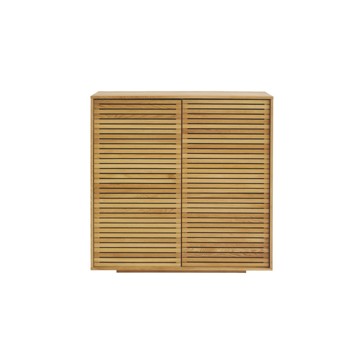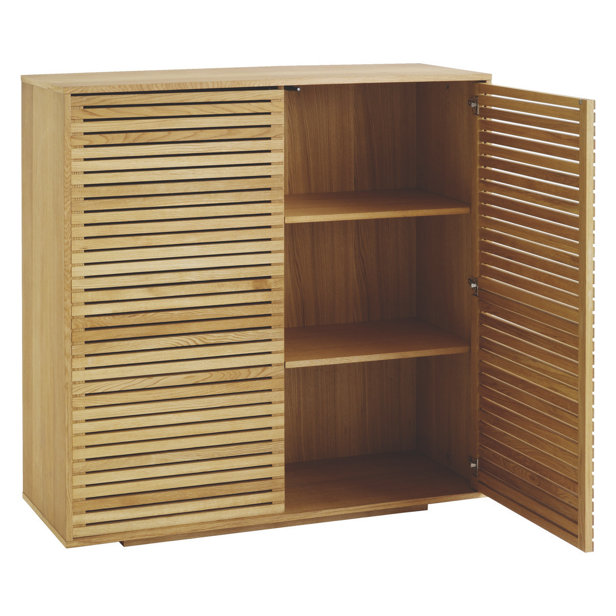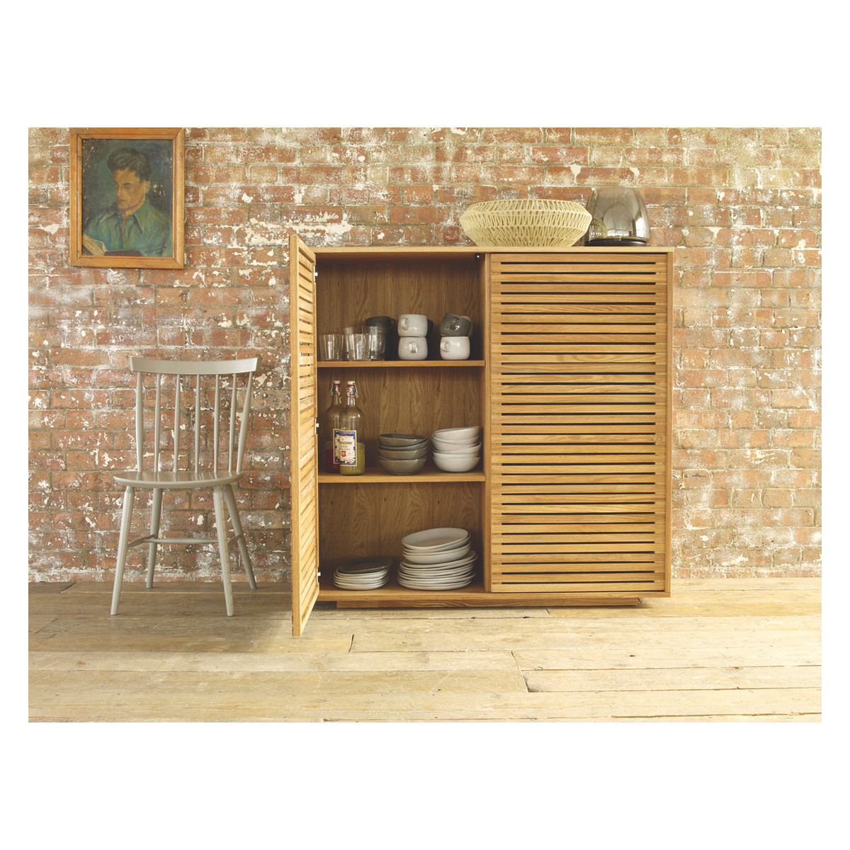Crafted from solid oiled oak and oak veneer, the Max 2 door cupboard with slatted doors adds warmth and character to a room. The combination of slatted doors and hidden plinth give a light appearance while providing generous storage space for any living or dining room.