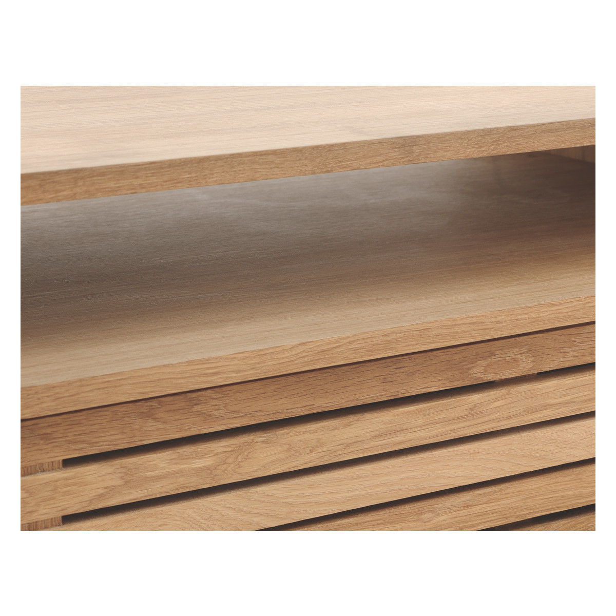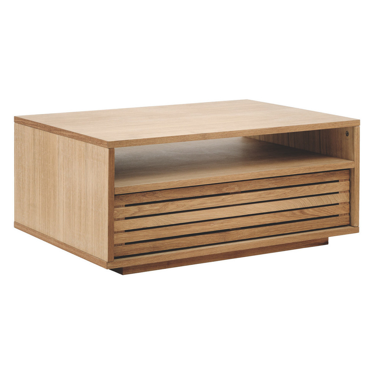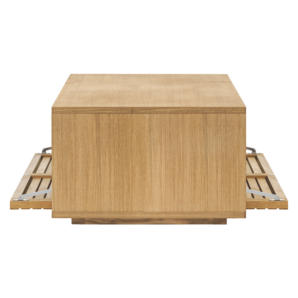 Designed in house and exclusive to Habitat, the Max oak coffee table with storage adds warmth and character to a room while keeping it clutter free. The table's open shelf provides storage for magazines and remote controls, while its generous internal storage space is hidden by 2 slatted drop-down doors, with push-close mechanisms for soft closure. Beautifully crafted in durable oak wood and oak veneer, the table is part of the Max collection of living and bedroom furniture.