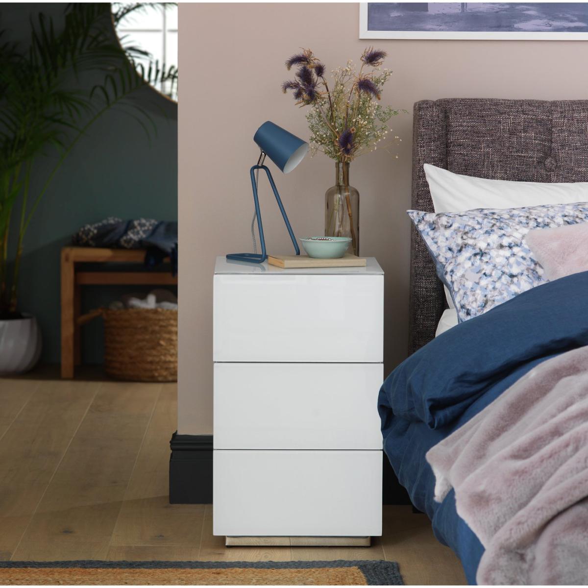 I love this bedside table for its sleek, contemporary look, which makes it a versatile piece in modern and minimalist interiors. The white glass finish adds a crisp, clean vibe that can reflect light and brighten a space, making it ideal for smaller bedrooms or schemes with a neutral palette. It works well paired with both high-gloss and matte finishes, and its understated design ensures it won’t overpower other decor elements. For styling tips, consider placing a statement lamp or a small plant on top to add personality. Inside the drawers, organising with small trays or baskets can keep essentials tidy, making this a practical yet stylish addition to any bedside setup.