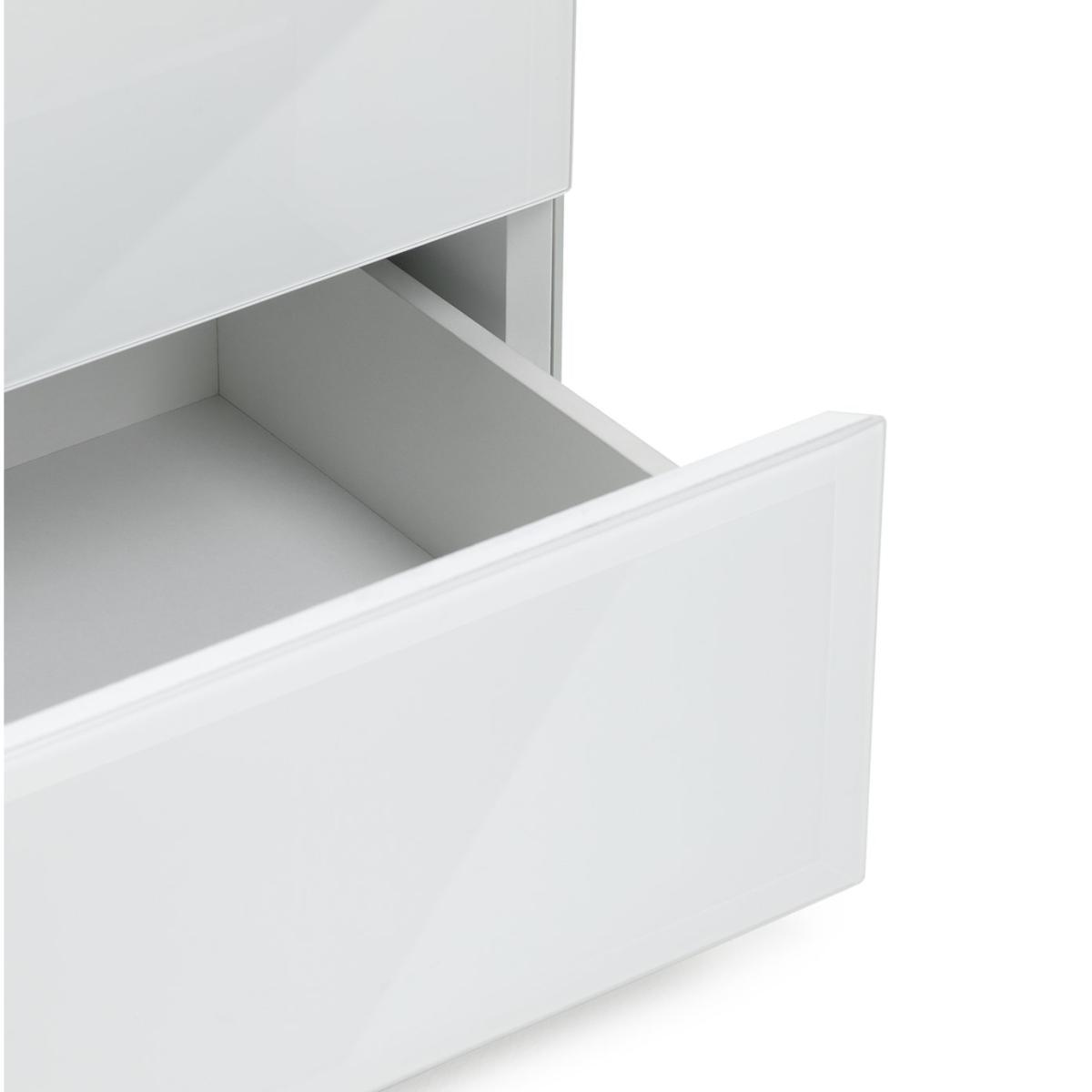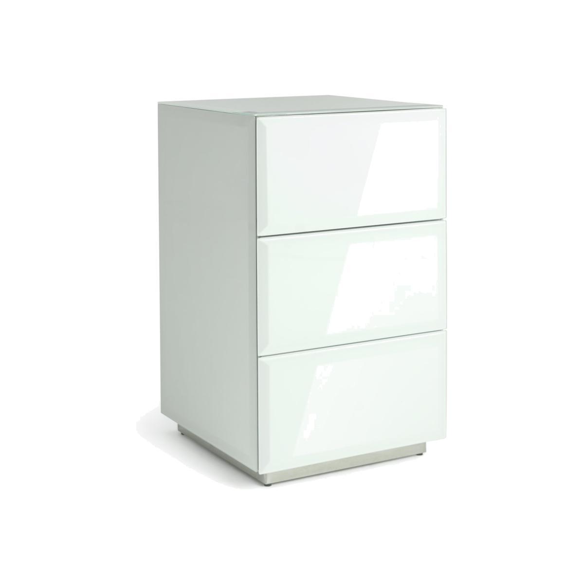 A contemporary, clutter free bedroom. Yes please. With its fresh white glossy glass finish this Mayfair bedside table is a slick operator. The 3 push to open drawers glide effortlessly on solid steel runners. A glamorous space for all your bedtime essentials. With plenty of room on top for a phone, lamp and alarm clock. Arrives fully assembled and ready to nestle next to your bed. Modern Mayfair minimalism at its smoothest.