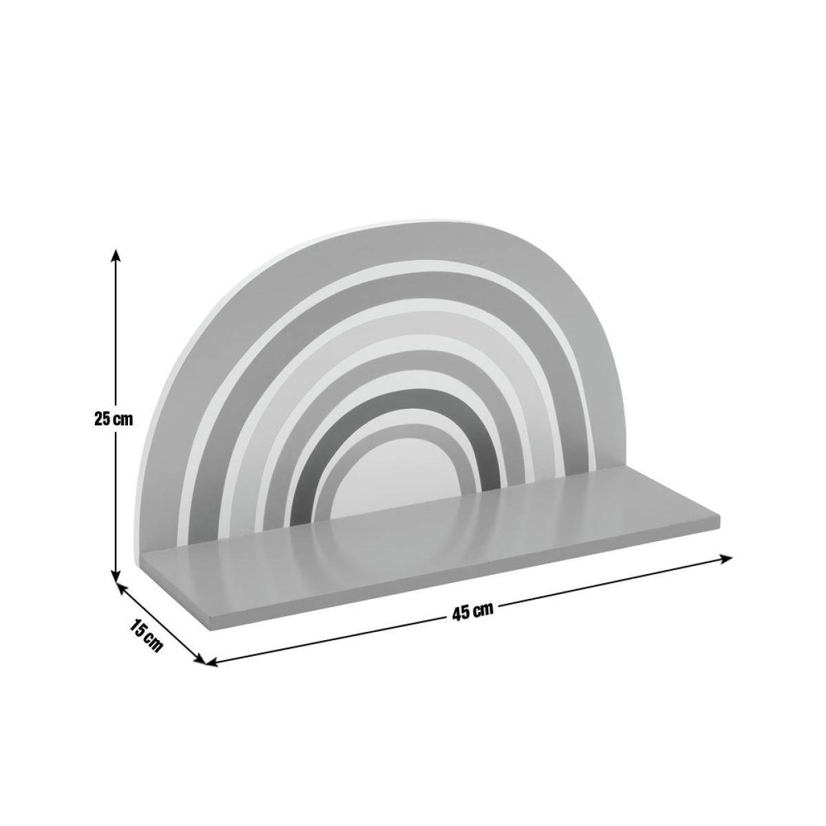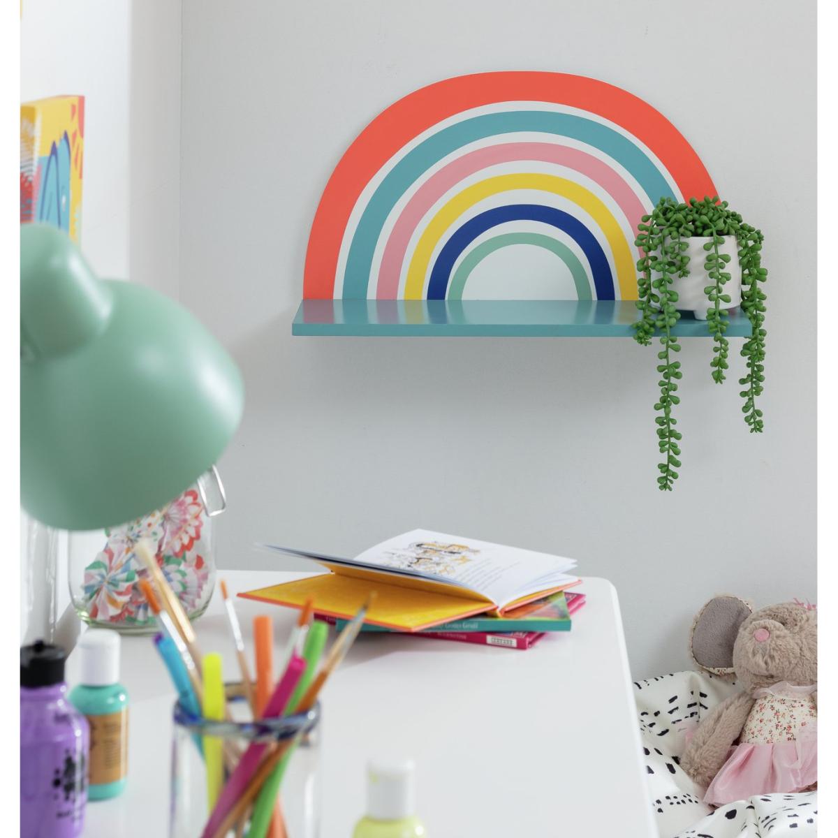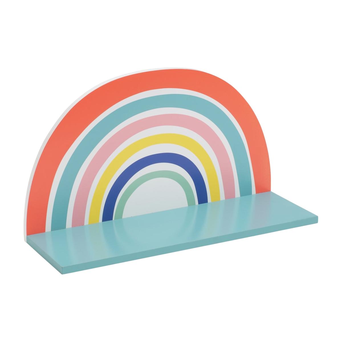 Over the rainbow. Put a smile on your child's face with our colourful rainbow wall shelf. Hang at child-friendly height where they can keep their favourite toys or books. Made from wood and painted in a lovely gloss finish, it's perfect for bedroom or playroom. Part of the MDF collection. Made from wood with a wood effect finish. Size H25, W45, D15cm. Weight 1.95kg. Supports a maximum weight of 10kg. Fully assembled.