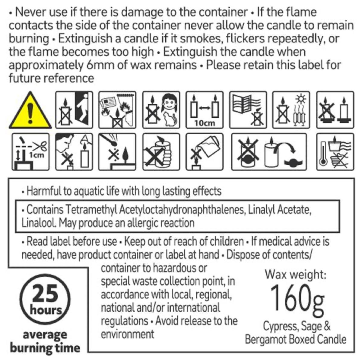 A fragrance that's as pretty as it looks. Poured into a frosted blue jar, this refreshing candle has the aroma of cypress blended with earthy sage and deep bergamot. Comes in a prettily packaged box too. Cypress Sage & Bergamot scent. Paraffin wax. Approximate burn time 25 hours. Size H8.5, W8, D8cm.