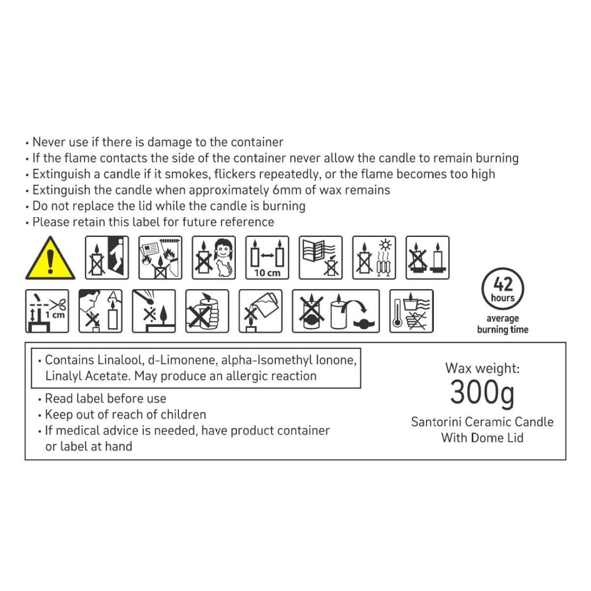 Inspired by the Greek Island of Santorini and its quaint buildings, this perfumed ceramic candle is like a sea breeze carrying the scent of citrus and fragrant flowers. It features the fruity aromas of lemon and bergamot with delicate floral notes of jasmine and violet. Along with invigorating base notes of sea salt, cedarwood and amber. Aah relax and enjoy. Santorini scent. Paraffin wax. Approximate burn time 42 hours. Size H15.5, W8.5, D8.5cm. Diameter 8.5cm.